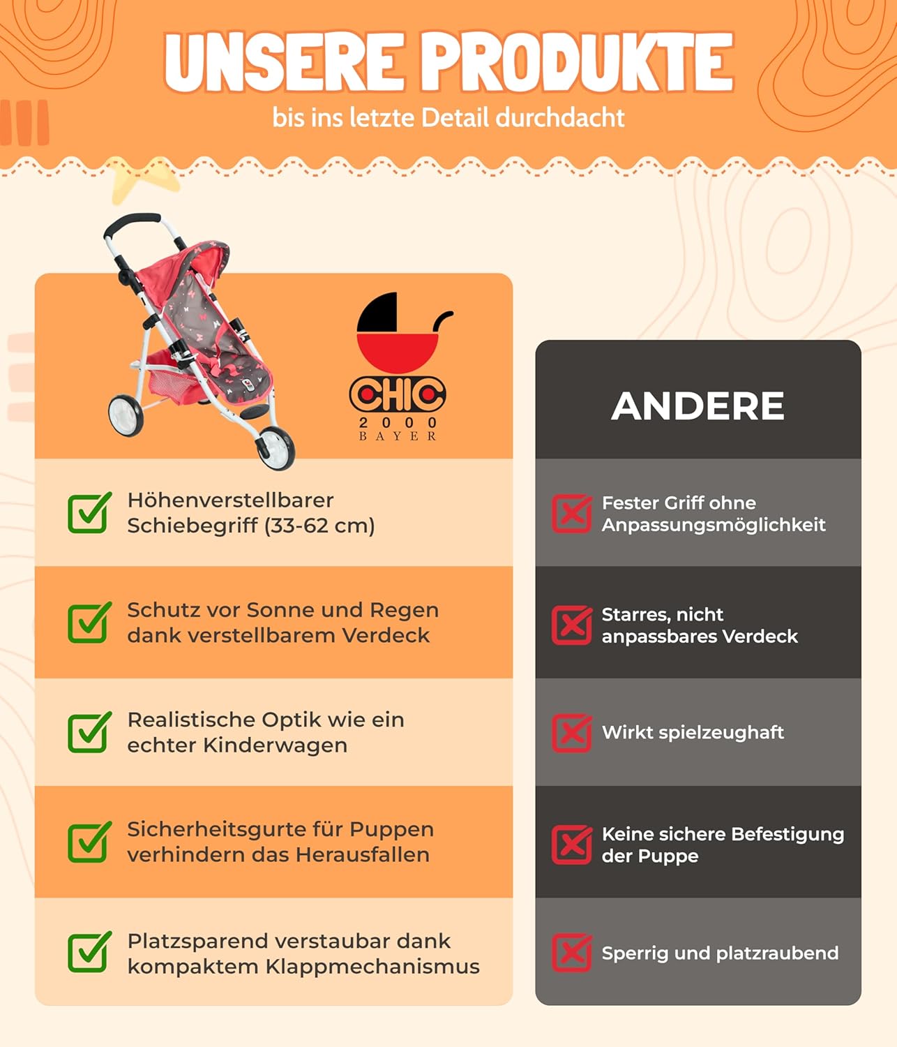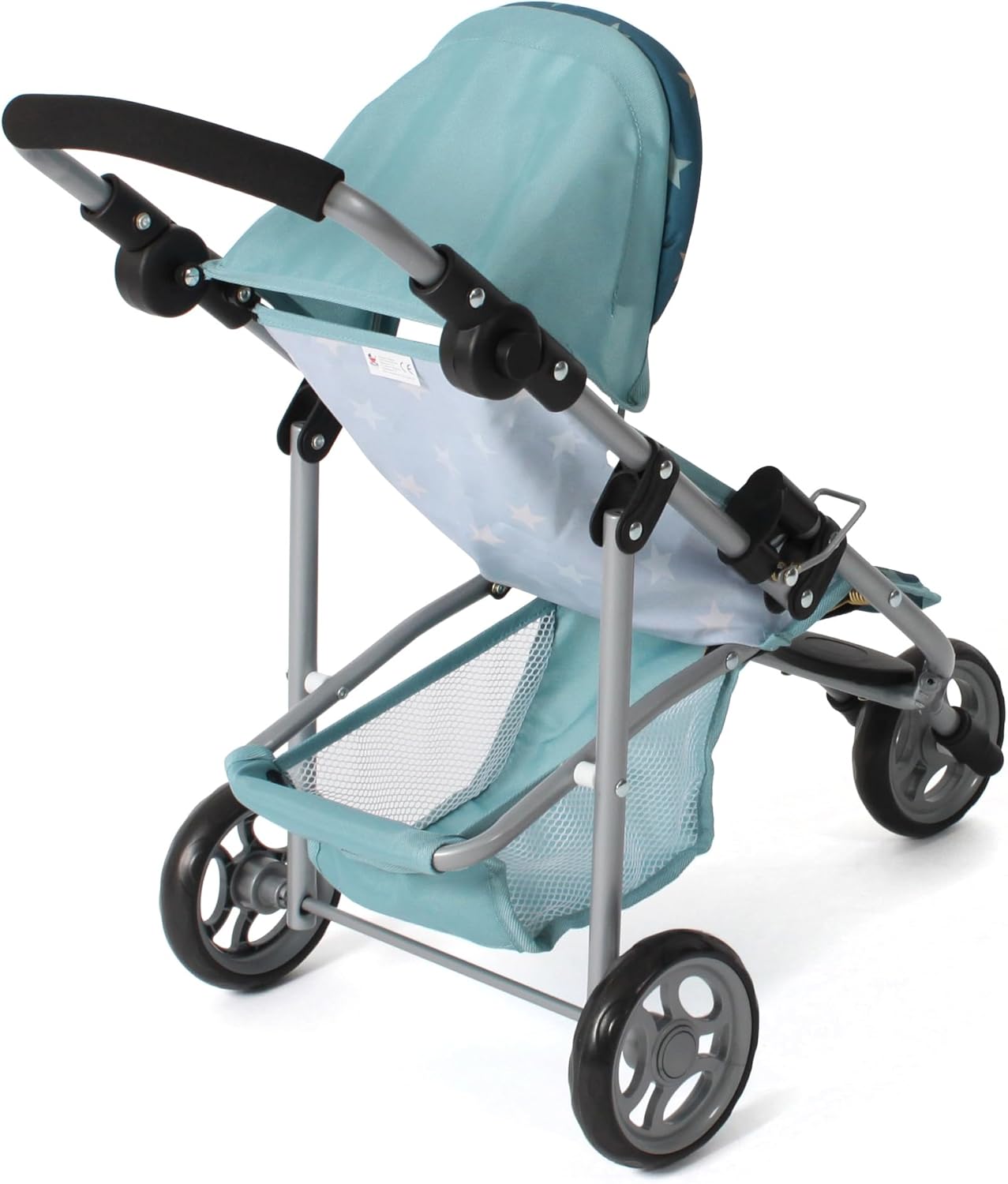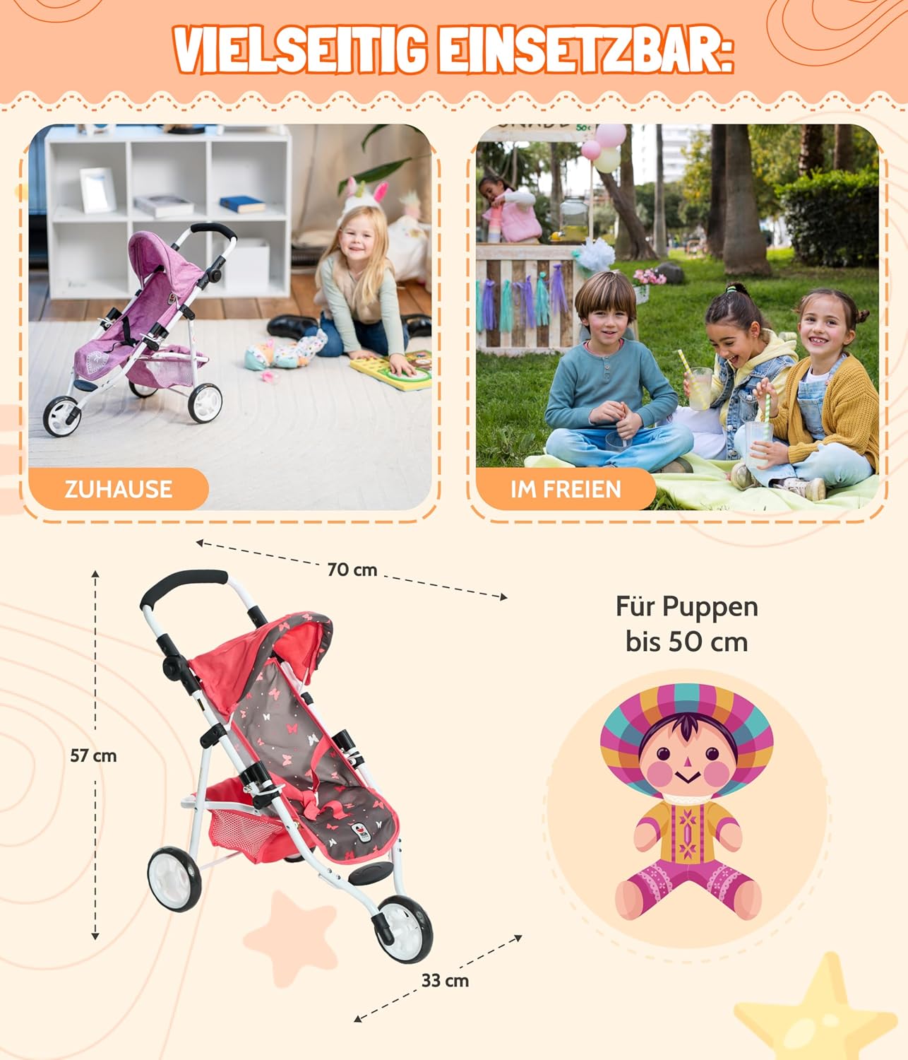Passeggino per bambole piccolo con maniglia regolabile in altezza da 33 a 62 cm. Il passeggino si adatta quindi alle dimensioni del bambino. Passeggino per bambole appositamente progettato per le mamme più giovani Jogger per bambole a 3 ruote con cappottina regolabile, cintura di sicurezza e rete per bagagli. Il passeggino può essere piegato in modo semplice e compatto. La bambola da jogging Lola è adatta per bambole fino a 50 cm di altezza Dimensioni: 70 x 33 x 62 cm, peso: 1,7 kg