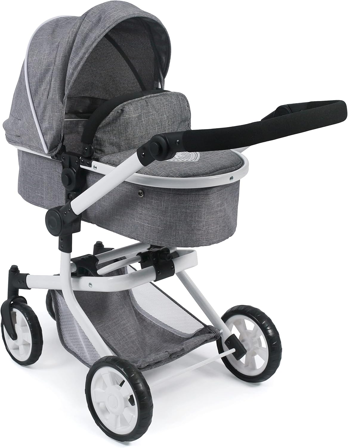 Carrozzina per bambole combinata dal design moderno per bambole fino a 46 cm! Grazie al manubrio regolabile è possibile adattarla in maniera ottimale all'altezza dei bambini. Il vano della carrozzina può essere girato sia verso il senso di marcia che nella direzione di chi la guida. Grazie ai pratici pulsanti può essere trasformata in un passeggino sportivo. La copertura del vano è ideale per proteggere la bambola dal sole o dal vento. La carrozzina comprende, fra le altre cose, ruote anteriori girevoli che permettono di curvare in maniera particolarmente agile. Nella borsa in dotazione è possibile riporre tutti gli accessori importanti per la bambola. La carrozzina per bambole è molto facile da richiudere per il trasporto.