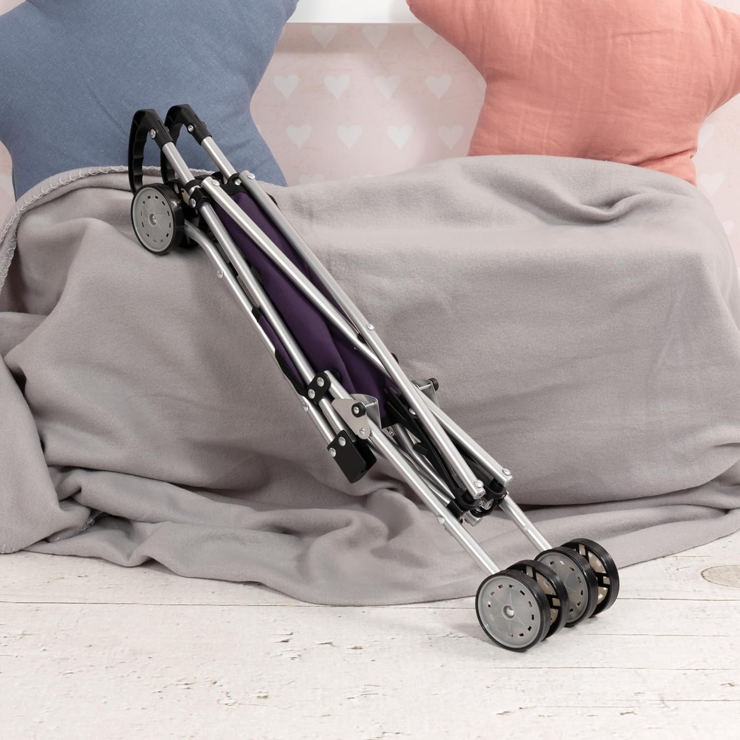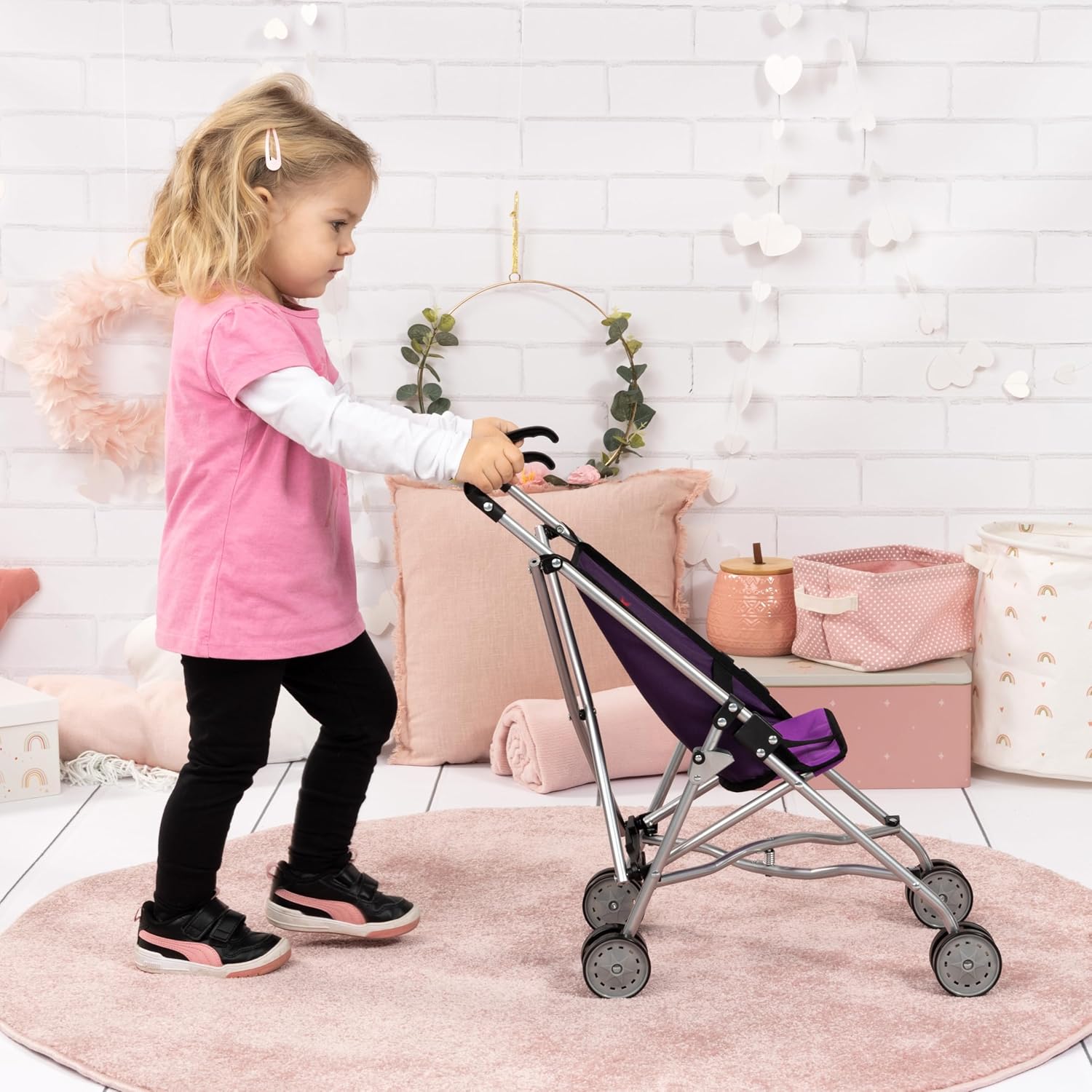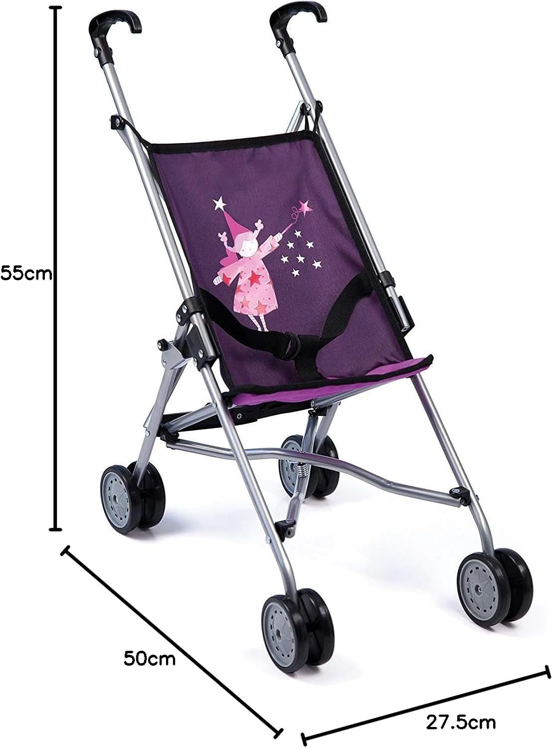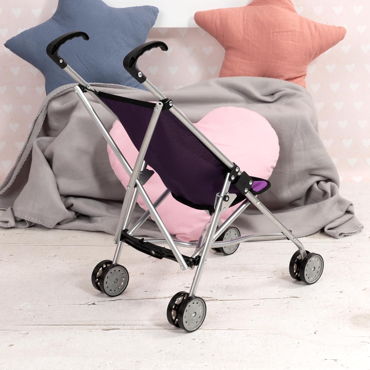Questo moderno passeggino per bambole (Altezza: 55cm) è l'ideale per i piccoli che vogliono giocare a fare la mamma o il papà. Il passeggino per bambole può ospitare bambole fino a 46 cm di lunghezza. Con la cintura integrata è possibile assicurare le bambole o gli animali di peluche. Grazie alle doppie ruote lisce e alla pratica impugnatura, ogni passeggiata sarà un evento gioioso. La passeggino per bambole è molto facile da richiudere per il trasporto.