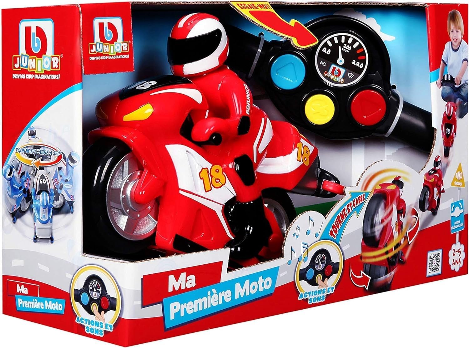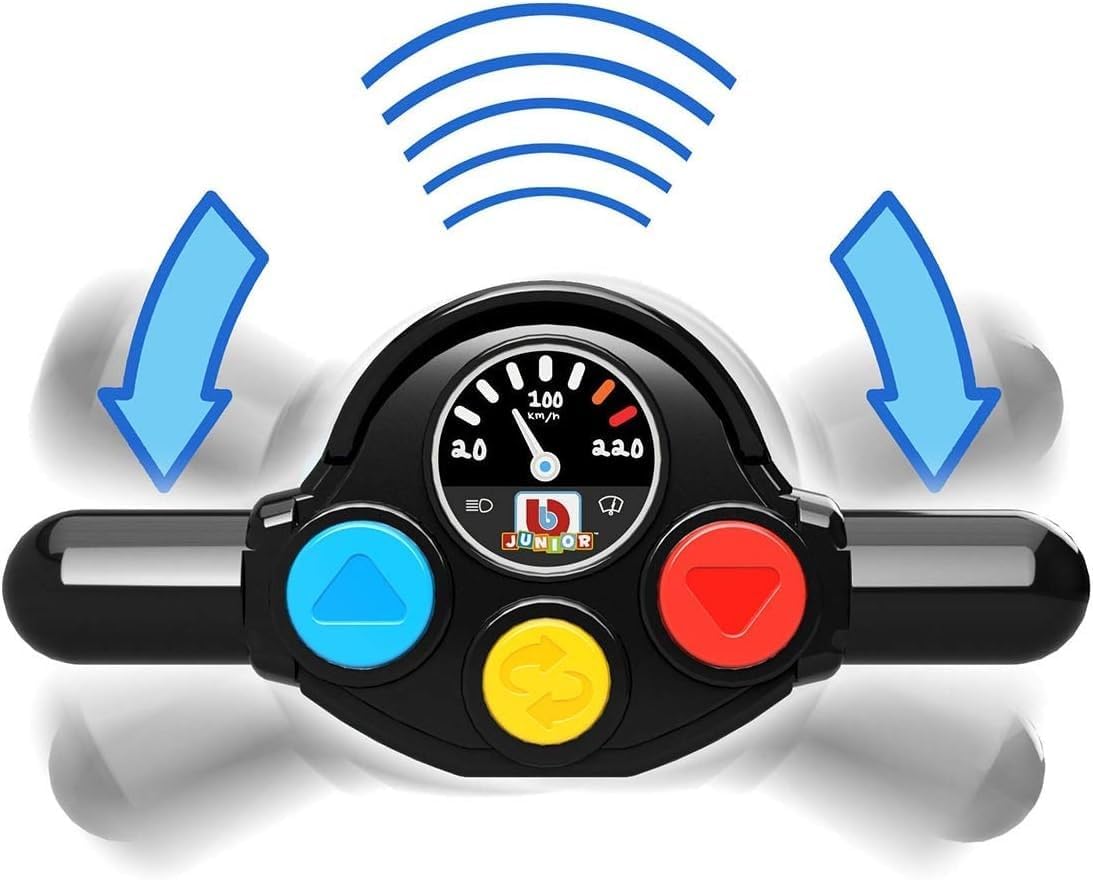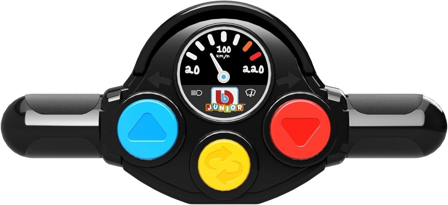 IMMAGINAZIONE: Lasciate che il vostro bambino sviluppi la propria immaginazione utilizzando questa moto. Creerà un mondo immaginario circondato da strade soleggiate, uccelli che cantano e montagne da sorvolare. Accompagnalo nella sua creatività. Più siamo pazzi più ridiamo Regalo: vuoi fare piacere al tuo bambino, a un paio di amici o altri per Natale o per un compleanno? Beh, non aspettare più! Questa moto con il suo telecomando manubrio è perfetta per te! Età: questa moto è adatta per bambini di 24 mesi o più! E sai perche'? È l'età perfetta per inventare la sua storia. Il bambino non potrà più farne a meno! DIVERTENTE: Gira il tuo manubrio e la tua moto gira. Scopri il tuo super clacson, i suoni e i rumori del motore!