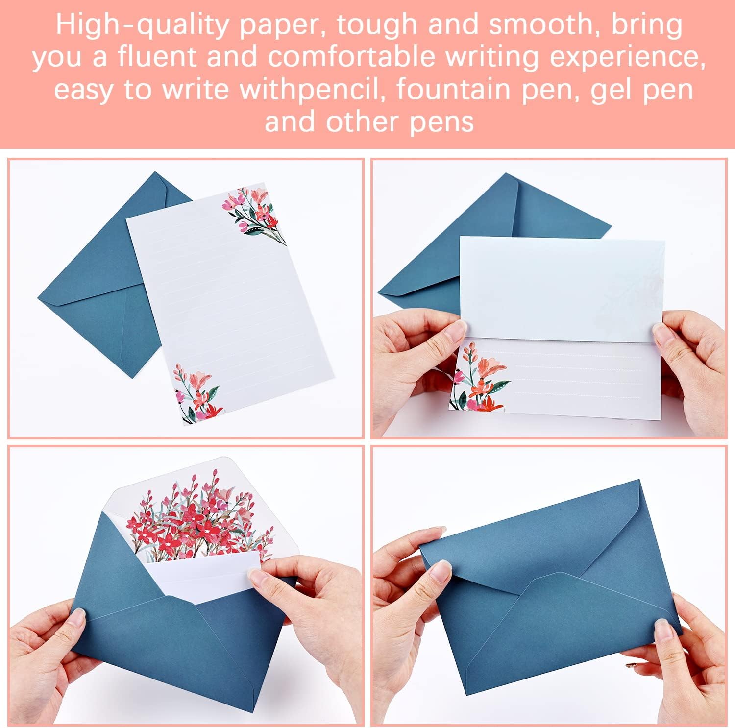 🌷【Quello che ottieni】Avrai set 6 carta da lettere con busta, ogni set di 4 carta da lettere e 2 buste, con 6 stili diversi. Ci sono 24 busta letter alfabetica e 12 buste carta con fiori unico. 🌹【Taglia】24 fogli di lettere da 19*13,5 cm;Busta: 16x11.5 cm; dimensioni standard e motivi carini rendono carta da lettere e buste più impressionante e affascinante. 🌺【Carta stampabile di alta qualità】Carta vintage da scrittura è realizzata in carta di alta qualità, che può soddisfare perfettamente le tue esigenze di calligrafia o stampa. La parte anteriore delle carta da lettere è progettata con i fiori. La carta per lettere alfabetica busta lettera è aumentare lo spazio di scrittura. La carta lettere è vuota, quindi puoi giocare completamente alla creatività. 🌸【Materiali di alta qualità】Le set carta da lettere e buste sono realizzate con eccellenti materiali di carta. Sono solidi e durevoli, lisci in superficie. Sono ecologici, riciclati, non totossici e resistenti e possono essere usato per molto tempo. Portavi un'esperienza di scrittura fluente e confortevole. 🌻【Bellissimo design】Set di Carta da Lettere e Buste in stile fiore, carino, fresco ed elegante. Ci sono linee sulla nostra carta lettere elegante, che è molto adatto per spiegare racconti e poesie.Molto adatto per la scrittura e i regali quotidiani. 🌼【Selezione regalo ideale】Kit carta da lettere con buste sono semplici, belli, eleganti, sono le scelte ideali per note, lettere e poesie d'amore e sono anche scelte ideali per la festa della mamma, San Valentino, anniversario, compleanno, ecc.