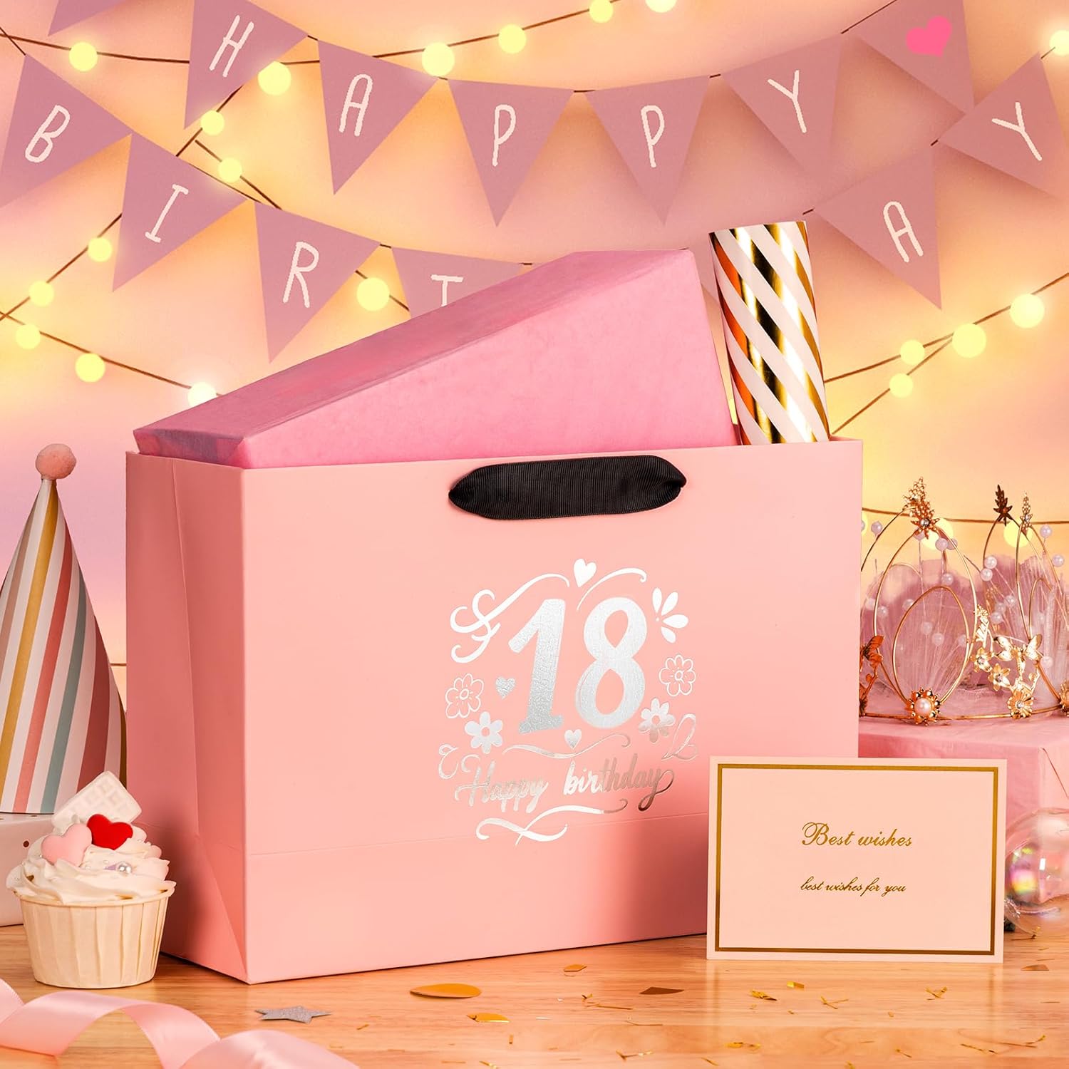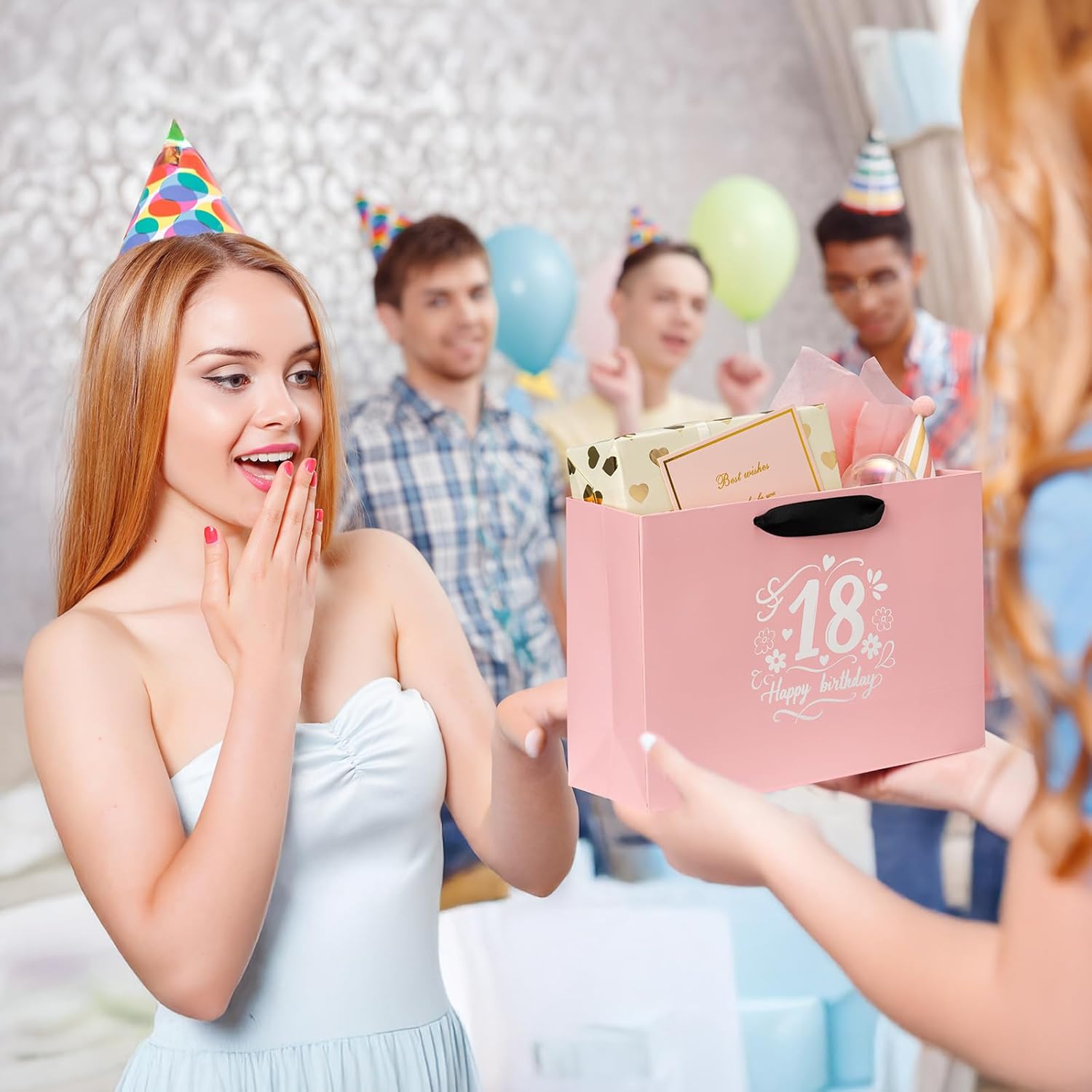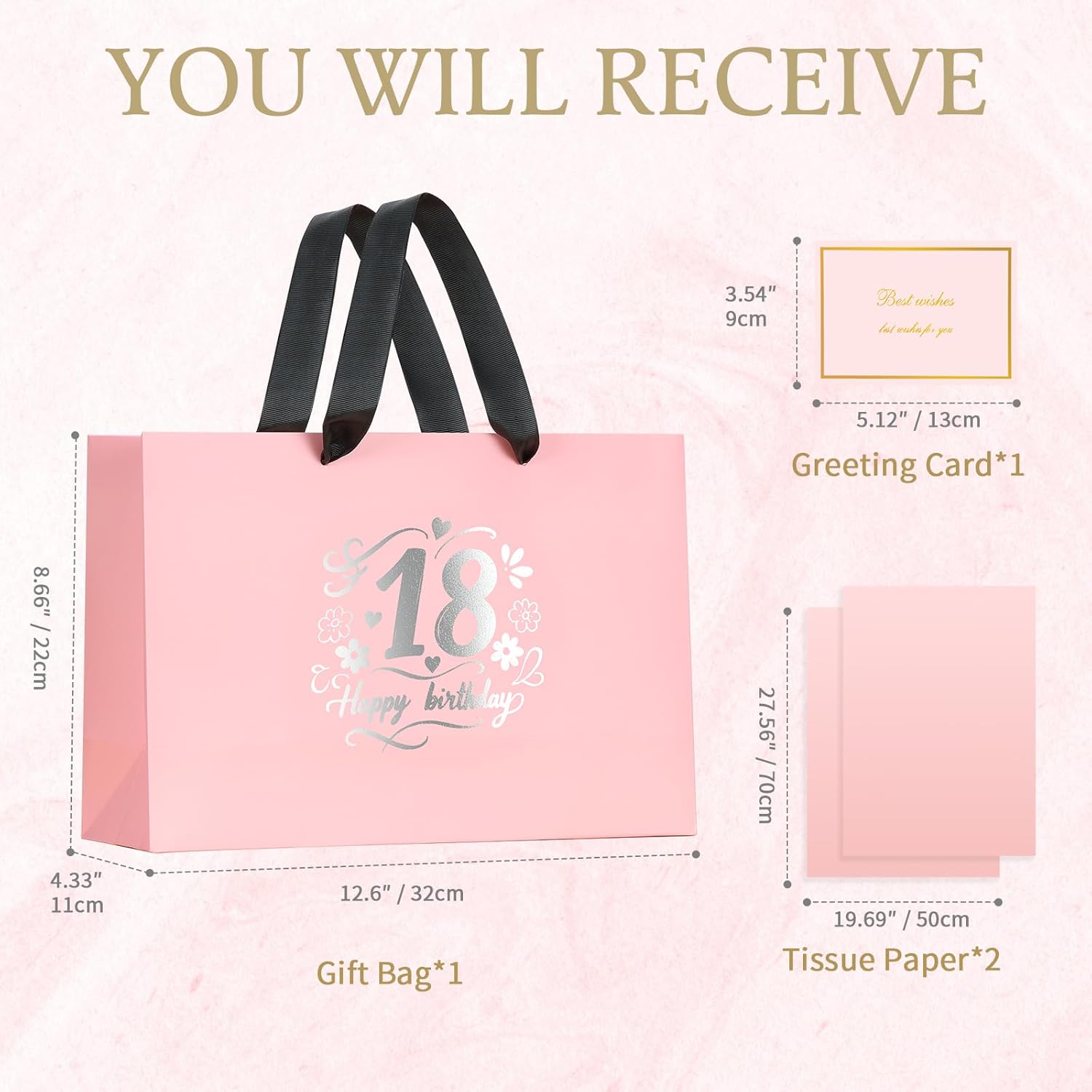 [Bellissimo set di sacchetti regalo] Riceverai un sacchetto regalo bblike di alta qualità per ragazze con carta velina. Il sacchetto regalo rosa misura 32 x 22 x 11 cm ed è adatto per regali di piccole e medie dimensioni. Ogni set di sacchetti regalo viene fornito con un biglietto su cui puoi scrivere i tuoi migliori auguri alla tua famiglia e ai tuoi amici. [Design elegante] La combinazione di colori rosa e nero aggiunge un tocco artistico ai sacchetti regalo rosa. La carta rosa Sydney può essere utilizzata per decorare i regali, conferendo al set di sacchetti regalo un aspetto sofisticato ed esclusivo. [Ecologico] La confezione regalo è realizzata in carta ecologica e biodegradabile con una trama spessa. Il fondo e i manici dei sacchetti regalo sono rinforzati per una maggiore durata e possono essere facilmente piegati per essere riutilizzati. Può essere utilizzato sia come accessorio decorativo che pratico per la vita quotidiana. [Proteggi i regali] I sacchetti regalo di compleanno con manici proteggono i sacchetti della festa di compleanno da danni, graffi o sporco. La stabile confezione regalo di compleanno garantisce che il regalo raggiunga il destinatario nelle migliori condizioni. [Per ogni occasione] I nostri sacchetti regalo di compleanno sono perfetti per 18 anni, 18 anni, San Valentino, celebrazioni, regali di ringraziamento, addio al nubilato o qualsiasi occasione.