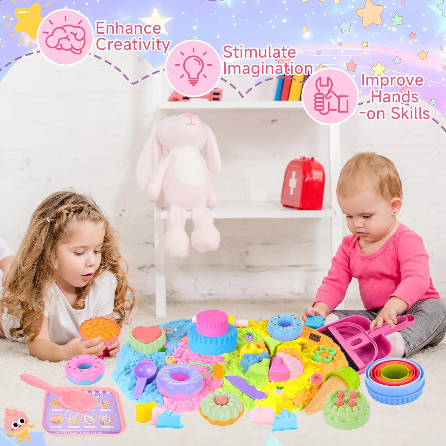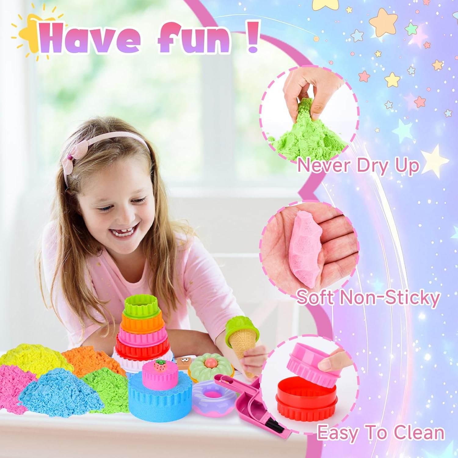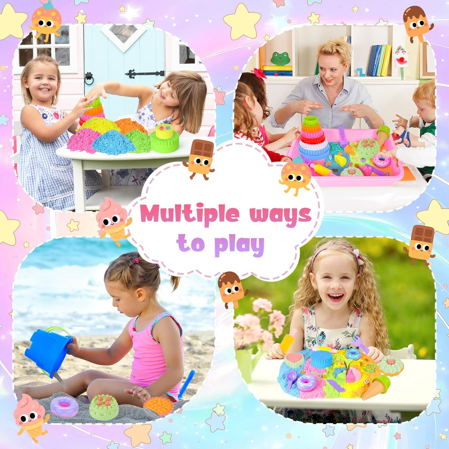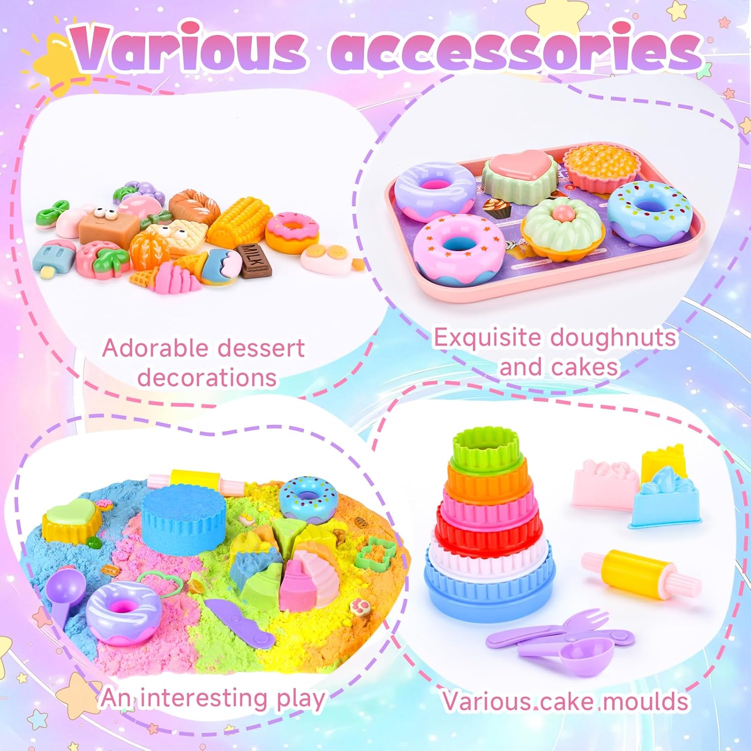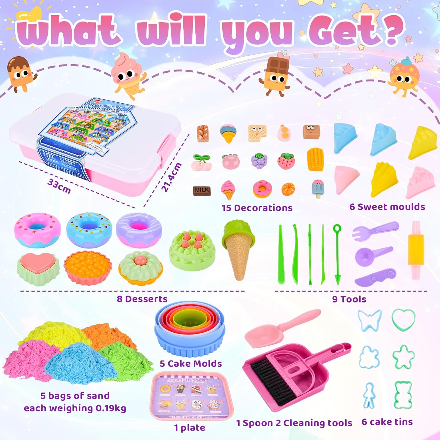 🎂【Set di sabbia magica per dessert】Questo set di sabbia magica per dessert contiene 1 sandbox con coperchio,950 grammi di sabbia spaziale a 5 colori,3 ciambelle,3 cupcake,1 gelati,6 formine per biscotti,1 set di posate,1 mattarello,1 set di strumenti per la pulizia,15 dessert,5 utensili da intaglio in plastica,6 stampi per dolci (da grande a piccolo),4 stampi per dessert,1 vassoio da portata e 1 biglietto di auguri 🍞【Sabbia magica giocattolo】La sabbia comprimibile “bagnata” ha la consistenza e la fluidità della sabbia ordinaria e allo stesso tempo la plasticità della plastilina.È facile da modellare,non appiccica e non asciuga velocemente.I bambini possono dare libero sfogo alla loro immaginazione e utilizzare il kit modello per afferrare,riempire,pizzicare,intagliare,ecc.la sabbia per cambiare la forma della sabbia e rendere la loro immaginazione più concreta.Realizza castelli,torte e altro ancora 🧁【Gioco di ruolo divertente】Il Sabbia Magica Set è ricco di contenuti.I bambini possono assumere il ruolo di uno chef che prepara i dolci,di un venditore che vende dolci o di un cliente che acquista il gelato.Ciò consente di incoraggiare pienamente l'immaginazione e il pensiero creativo dei bambini.Durante il processo di gioco di ruolo,i bambini possono anche sviluppare le loro capacità comunicative e aiutarli ad affrontare meglio le relazioni sociali 🥯【Facile da pulire e riporre】Il set è dotato di una serie di strumenti per la pulizia che possono aiutarti a pulire in modo efficace quando il tuo bambino ottiene la sabbia fuori dalla scatola.Allo stesso tempo,questo set di sabbia giocattolo viene fornito con una sabbiera con coperchio.Dopo l'uso,tutto può essere riposto nella scatola per riporlo e trasportarlo facilmente 🍰【Regalo creativo perfetto】Sabbia Cinetica Set è il regalo perfetto per ragazzi o ragazze di 3 4 5 6 7 8 9 anni.Questo set di giocattoli sandbox può far divertire i bambini,migliorare la loro concentrazione e tenerli impegnati nell'apprendimento e nella creazione.Perfetto per regali di compleanno,regali di Natale,regali di Pasqua,regali di Halloween,regali di ritorno a scuola e altro ancora