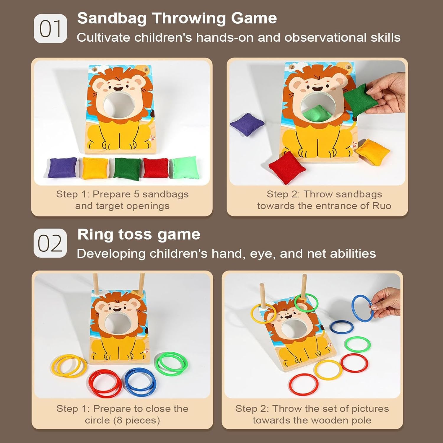 Supporto antiscivolo: la combinazione di rivestimento a base d'acqua, materiali naturali adatti ai bambini e una base antiscivolo con bordi arrotondati garantisce un'esperienza di gioco sicura e divertente Divertimento interattivo: i colori vivaci e accattivanti combinati con affascinanti disegni di animali incoraggiano il divertimento interattivo e stimolano il movimento, ideale per feste di famiglia, feste in giardino e giochi per bambini, questo gioco di lancio di beanbag crea momenti divertenti per tutte le età Giocattolo educativo coinvolgente: supporta l'apprendimento precoce attraverso uno stile di gioco divertente, progettato per un facile trasporto e un uso senza sforzo durante picnic o attività di gruppo da soli o insieme Competenze giocose: il gioco di lancio con sacchettini favorisce la coordinazione fisica e la consapevolezza spaziale grazie al principio di gioco basato su punti e zone bersaglio graduate per lo sviluppo progressivo delle abilità in un'atmosfera divertente Gioco interattivo: un obiettivo del fumetto fornisce una guida visiva durante il gioco, favorisce la coordinazione occhio-mano e una risposta più rapida grazie alle versatili modalità di lancio di anelli e sacchetti per tutti gli ambienti