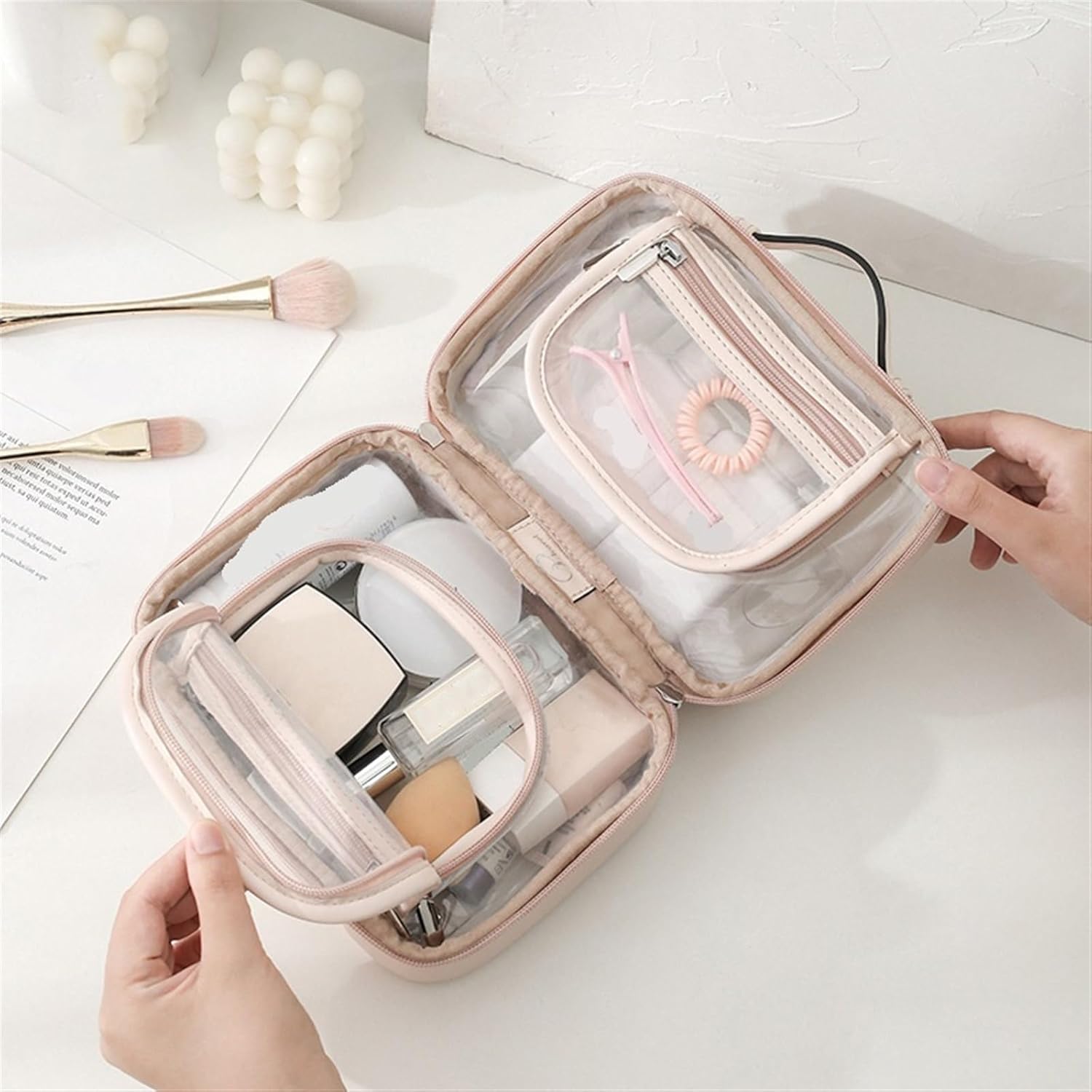 Design Elegante: Questa pochette è un accessorio chic, perfetto per ogni occasione, dal viaggio di lavoro a una serata fuori. Aggiunge un tocco di stile al tuo look, rendendola un must-have nel tuo beauty case donna Praticità Incredibile: Ideata per un utilizzo quotidiano, la nostra pochette da viaggio offre ampio spazio per riporre cosmetici e accessori, mantenendoli organizzati e facilmente accessibili. Rappresenta la soluzione ideale per il tuo beauty da viaggio Facile da Trasportare: Leggera e compatta, si adatta facilmente a borse di diverse dimensioni. La pochette da viaggio è perfetta per le avventure, permettendoti di portare con te tutto il necessario senza ingombrare troppo Versatilità Assoluta: Non solo per trucchi! Questa pochette può essere utilizzata anche come beauty case uomo, per riporre articoli da toeletta o accessori tecnologici, soddisfacendo le esigenze di tutti Rifiniture Curate: Ogni dettaglio è pensato per offrire un'esperienza d'uso piacevole. I materiali selezionati e il design funzionale rendono questa pochette un accessorio pratico e raffinato per ogni viaggiatore 1. Grande capacità: questa borsa for il trucco ha abbastanza spazio for riporre tutti gli articoli da toeletta da viaggio, pennelli for il trucco di dimensioni standard o cosmetici e flaconi di dimensioni normali. Ampia apertura for un facile accesso agli oggetti essenziali. 2. Borsa for il trucco a doppio strato: la borsa da viaggio trasparente ha due piccole tasche con cerniera, il che la rende un'ottima scelta for separare i cosmetici dagli articoli da toeletta.