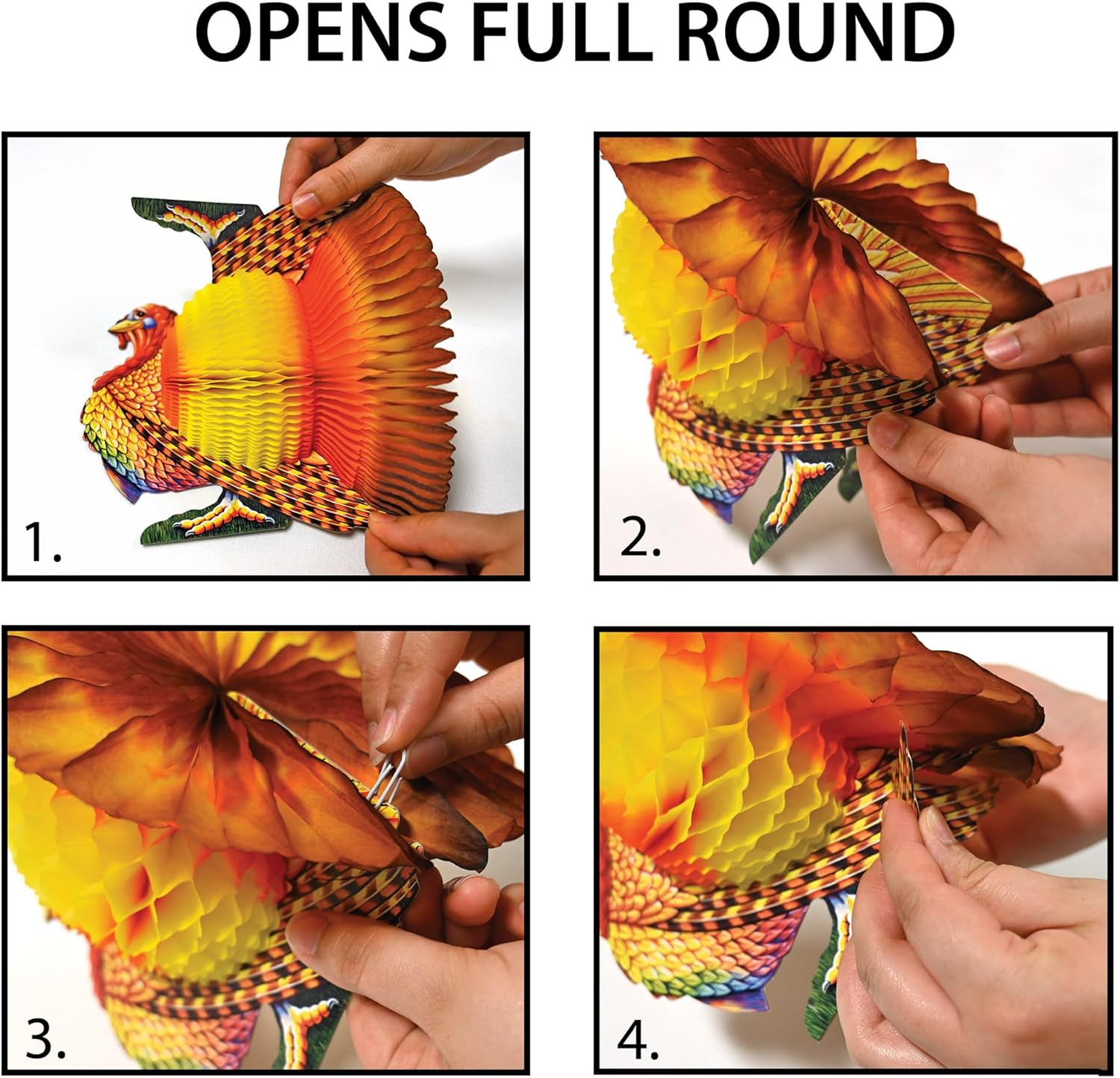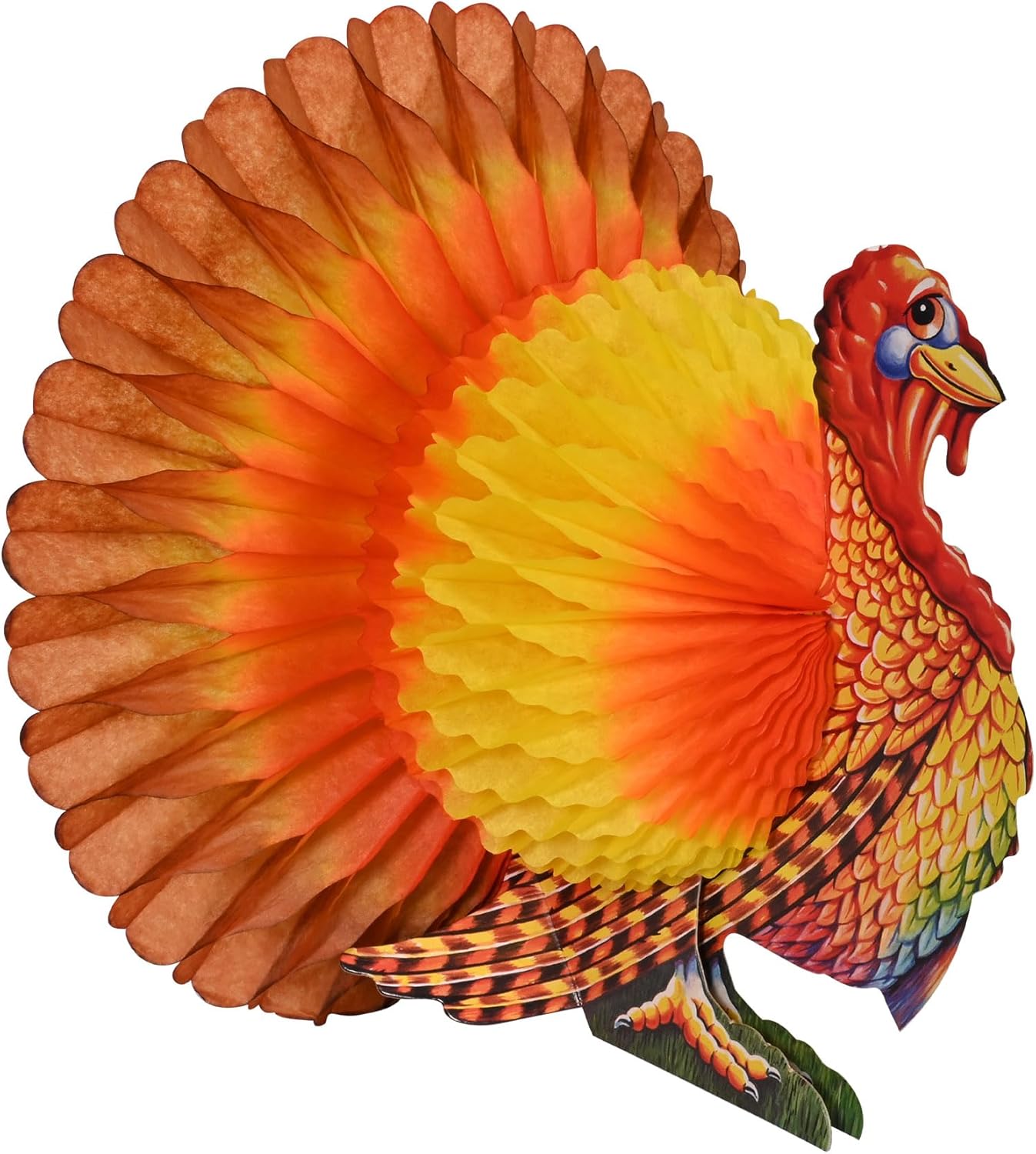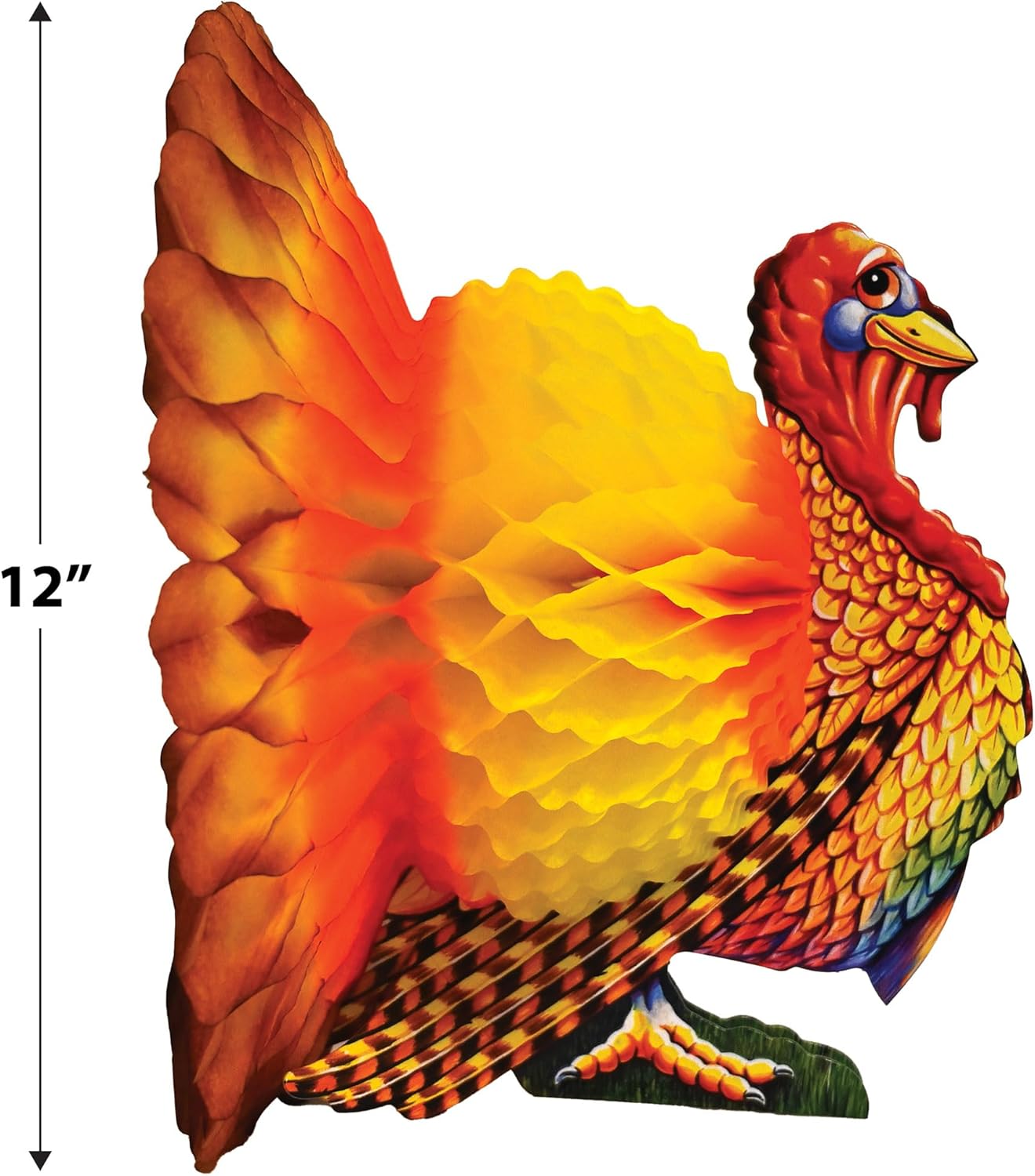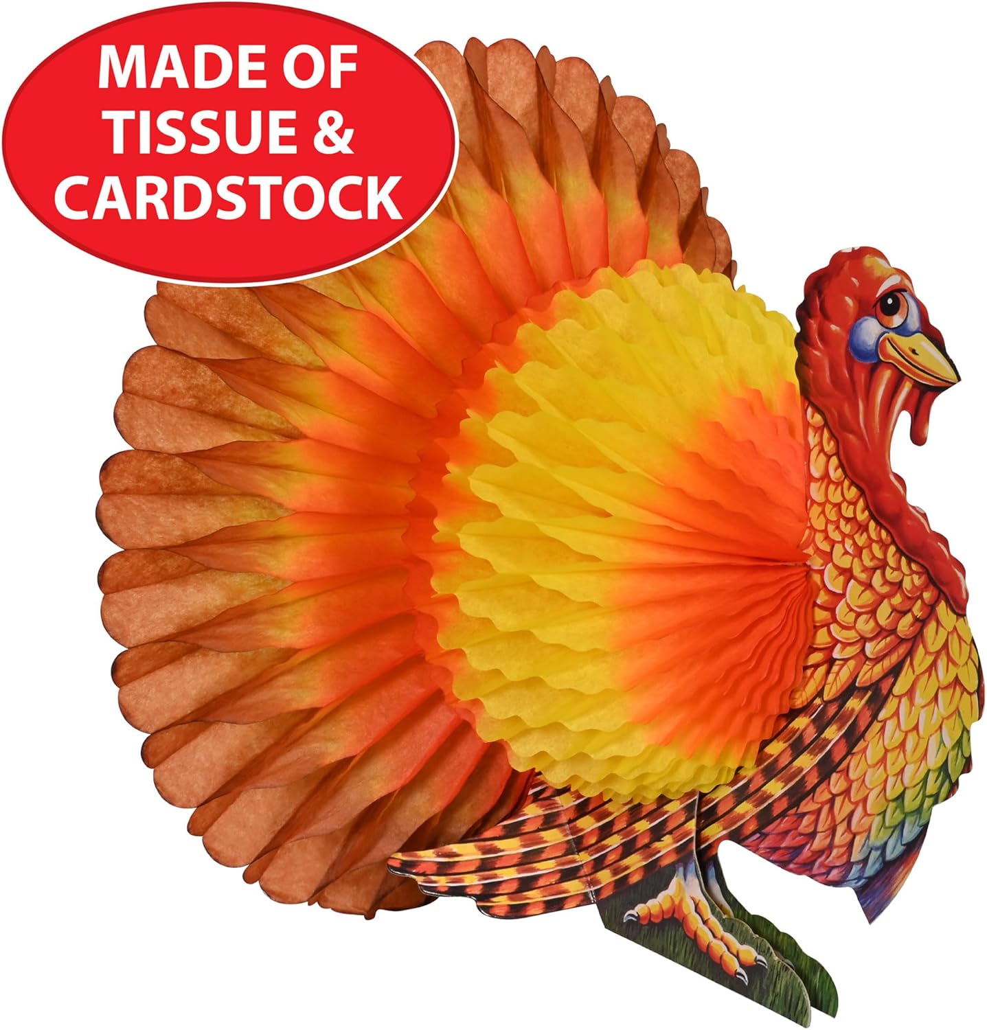Include 2 centri di tacchino nella confezione. Ogni pezzo centrale misura 12 pollici. Realizzato in cartoncino e carta velina. Starà benissimo su un tavolo per l'autunno e la stagione del Ringraziamento.