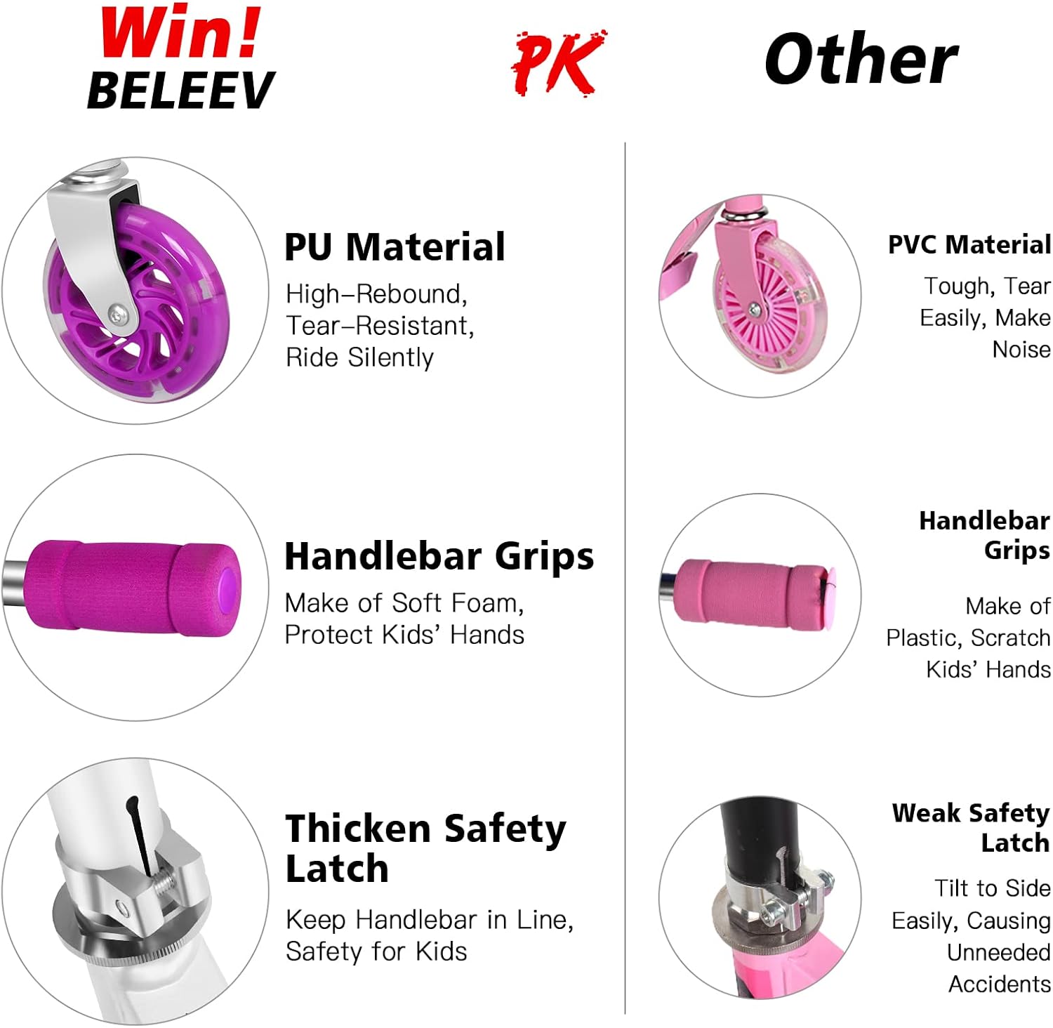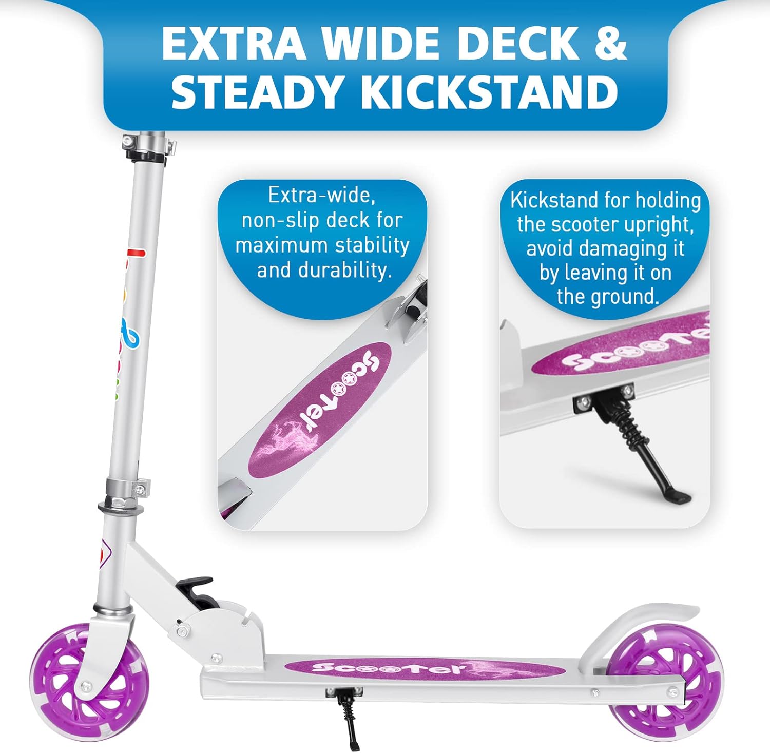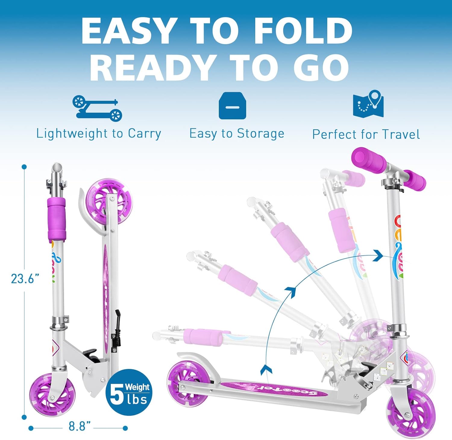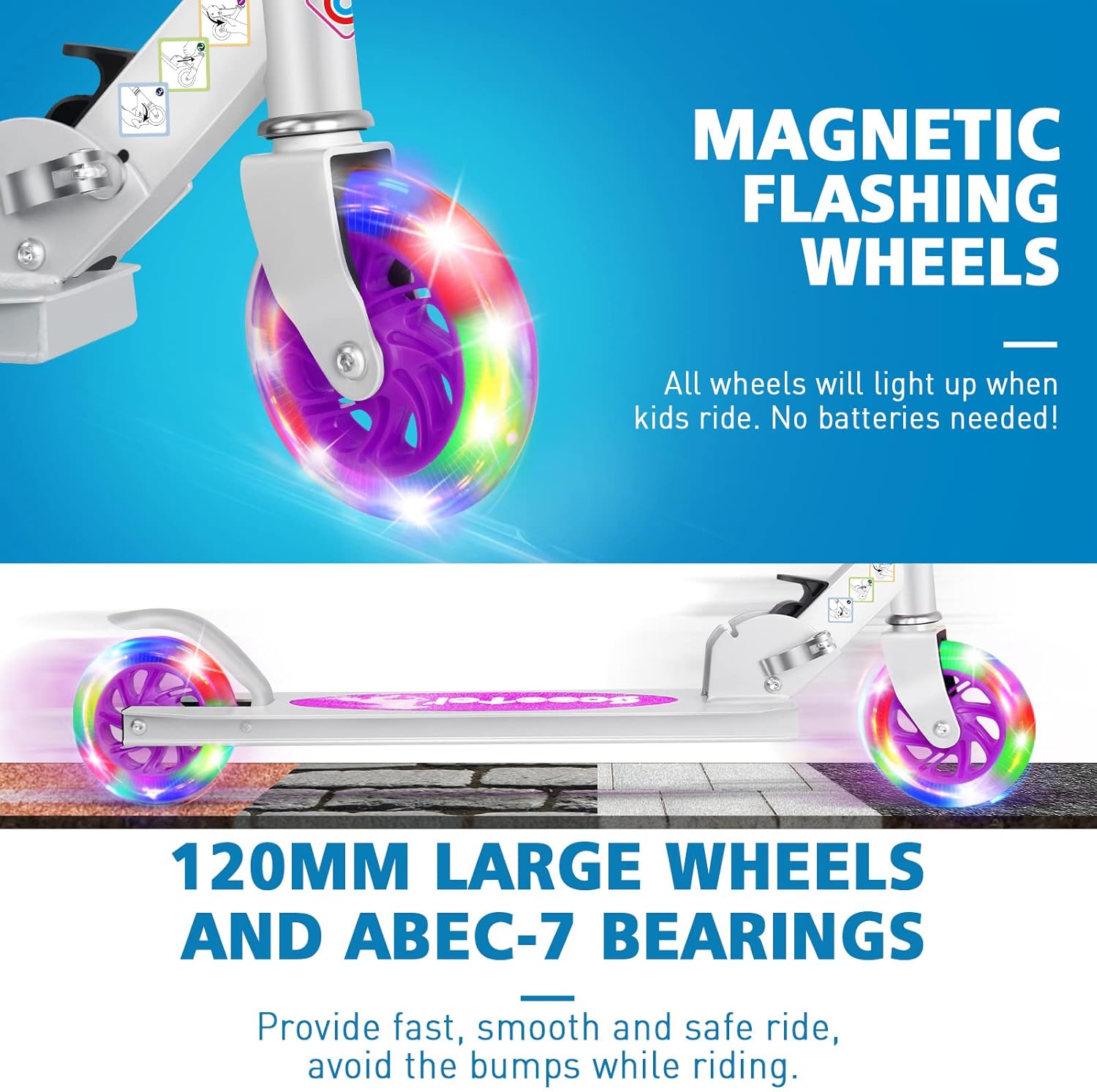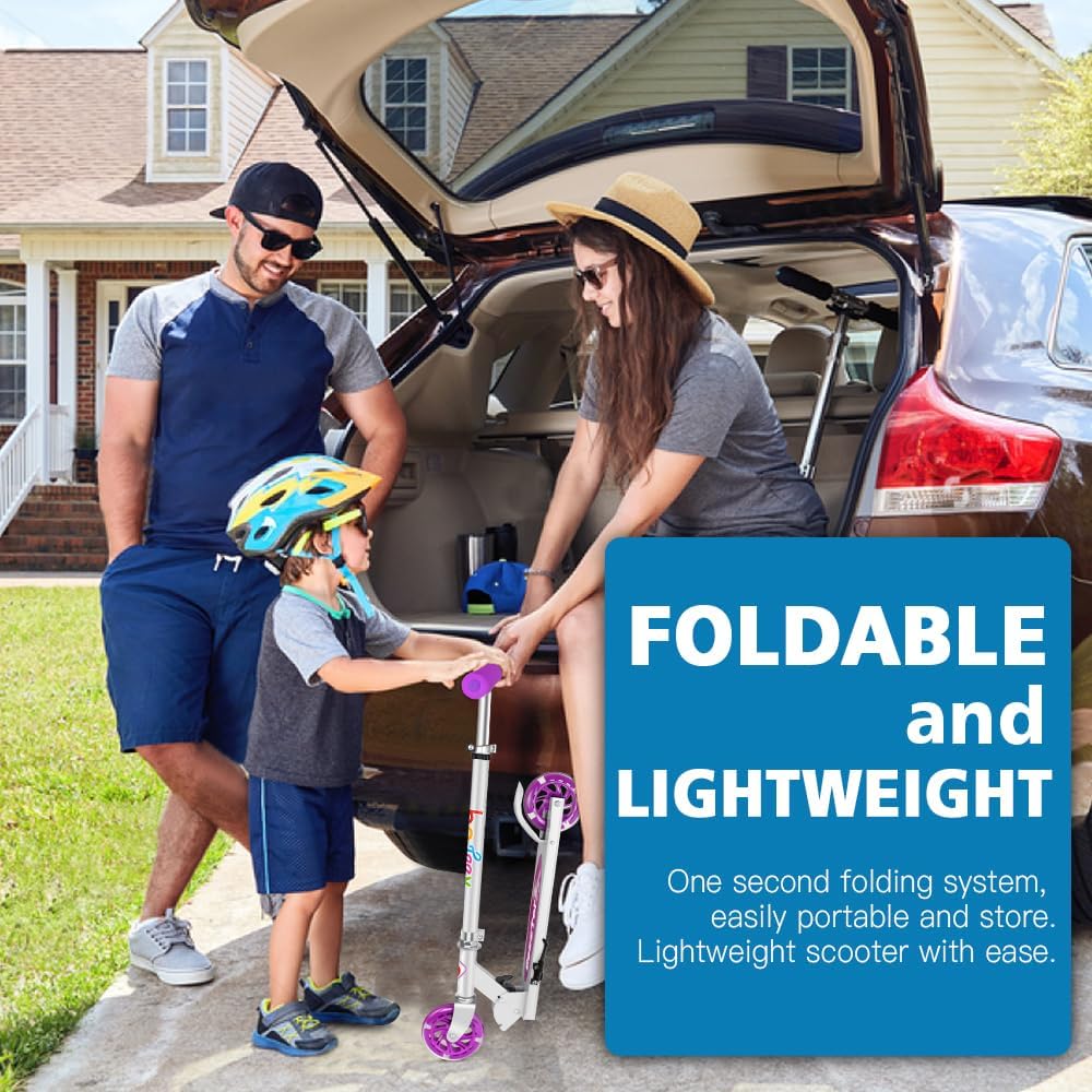 Divertimento per i bambini: lo scooter viene fornito completamente assemblato ed è subito pronto per l'uso. Con due ruote luminose a LED lampeggianti, non sono necessarie batterie. Le luci diventano più luminose quanto più velocemente i tuoi bambini pedalano con le nostre bici con nucleo magnetico. Amerai questa caratteristica speciale che rende unico il tuo scooter! (La confezione non contiene batterie.) Regolabile e stabile: il nostro scooter è dotato di manubrio regolabile. Ciò significa che puoi regolare la barra a T da 30,75 a 34,75 pollici da terra. È bello accompagnare i bambini mentre crescono. Realizzati in resistente lega di alluminio, il tubo a T e il piatto pesano solo 2,25 kg, facilitando la manovrabilità e il trasporto. Comodo e sicuro: gli scooter per ragazze sono dotati di robuste ruote in PU di grandi dimensioni (120 mm) e di un sistema di assorbimento degli urti senza molle con cuscinetti ABEC-7. Le impugnature in schiuma per manubrio extra spesse offrono comfort e non si consumano rapidamente. Il freno sul parafango posteriore consente di fermare rapidamente lo scooter durante la pedalata. Basta aprirlo e piegarlo: con un secondo meccanismo di chiusura, lo scooter viene consegnato completamente assemblato. Per aprirlo, è sufficiente rilasciare il morsetto sul meccanismo di chiusura, quindi sollevare la leva di plastica e trattenere la fessura anteriore. Pieghevole per riporlo, risparmia molto spazio. Il manubrio rimovibile si piega facilmente e si aggancia ai supporti integrati. È perfetto da portare in valigia o in macchina. Durevole e facile da guidare: lo scooter per bambini è progettato per resistere all'uso e agli abusi da parte dei bambini. Materiale durevole che resisterà ad anni di utilizzo e abuso, supportando ciclisti fino a 50 kg. Il piano antiscivolo è basso a terra e facilita l'entrata e l'uscita dei bambini.