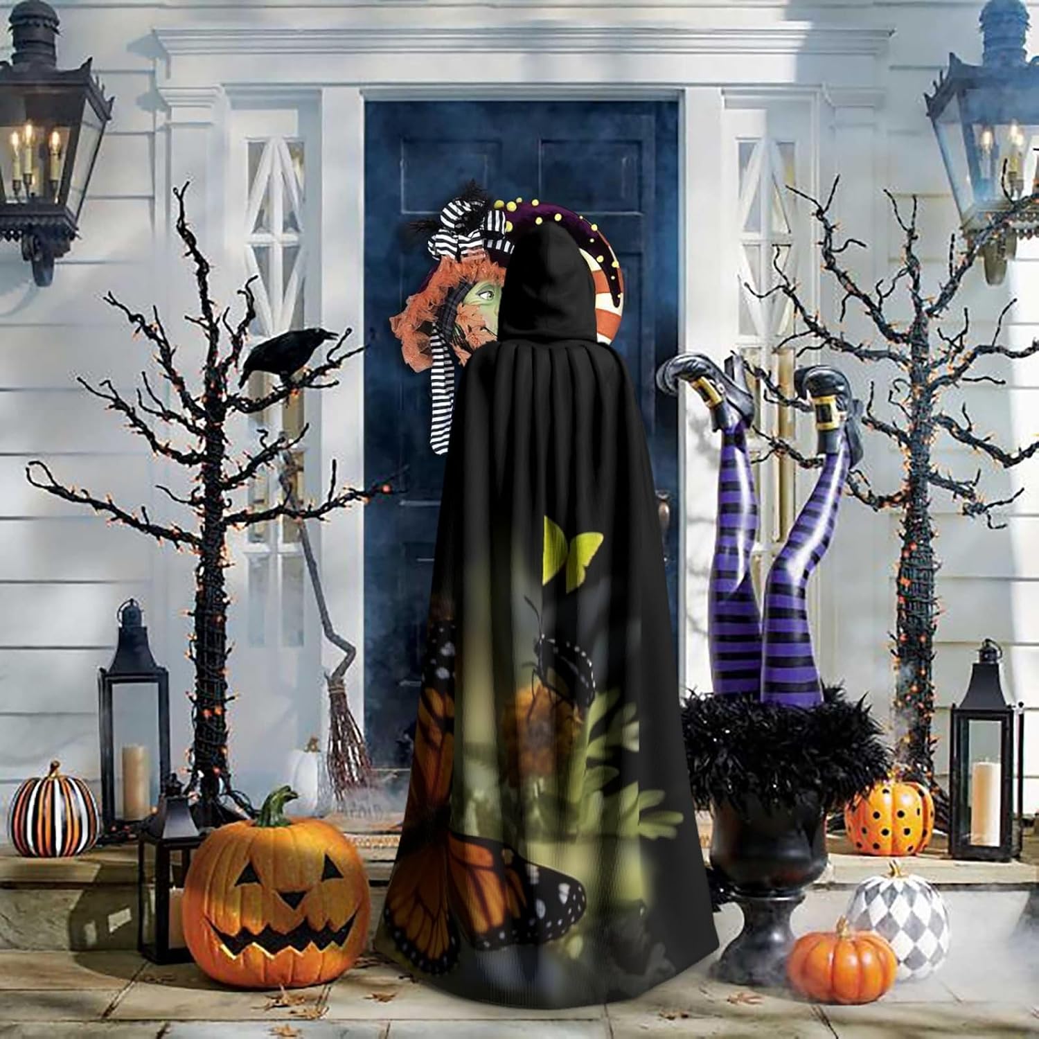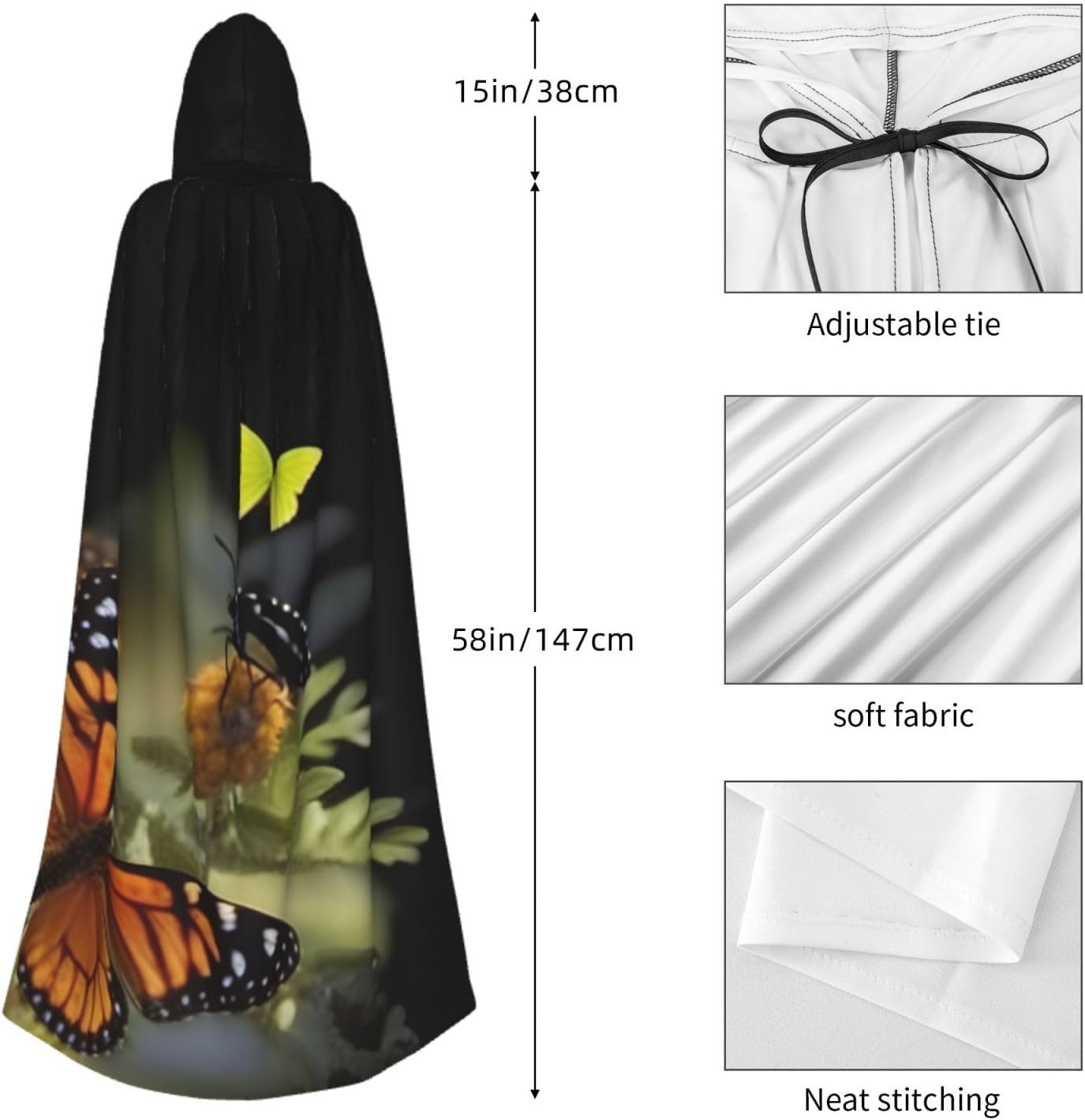 Realizzato in poliestere, questo bellissimo mantello con stampa a farfalla è comodo da indossare e senza prurito. Il suo design a tutta lunghezza lo rende una taglia A adatta a tutti per adulti e ragazzi. Distinguiti tra la folla ad Halloween, eventi di gioco di ruolo in costume, feste a tema, o in qualsiasi incontro o carnevale. Con design senza cerniera e colletto annodato, indossabilità è un gioco da ragazzi. Inoltre, è lavabile in lavatrice e facile da mantenere. Abbraccia lo spirito di Halloween con stile con il nostro mantello con cappuccio e fai un aspetto indimenticabile!
