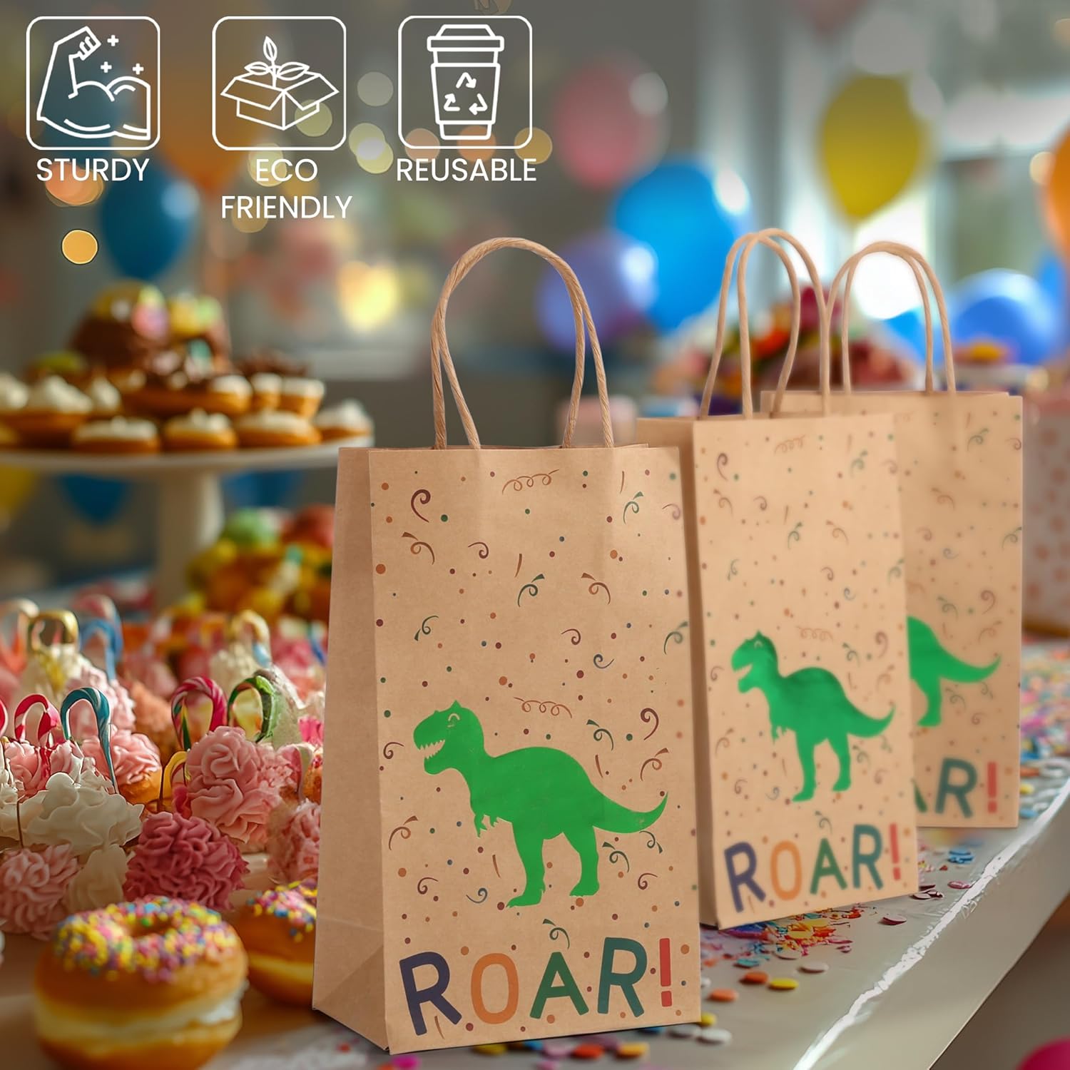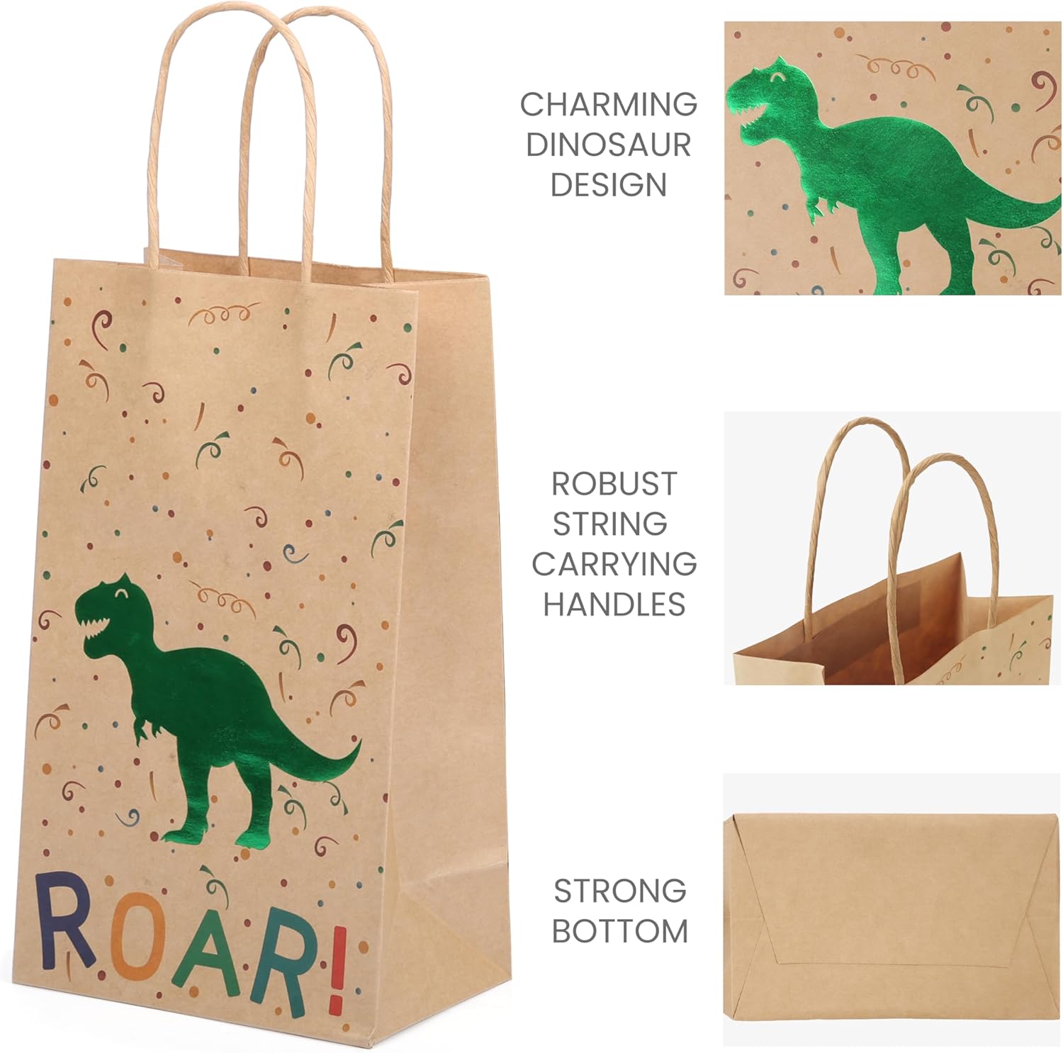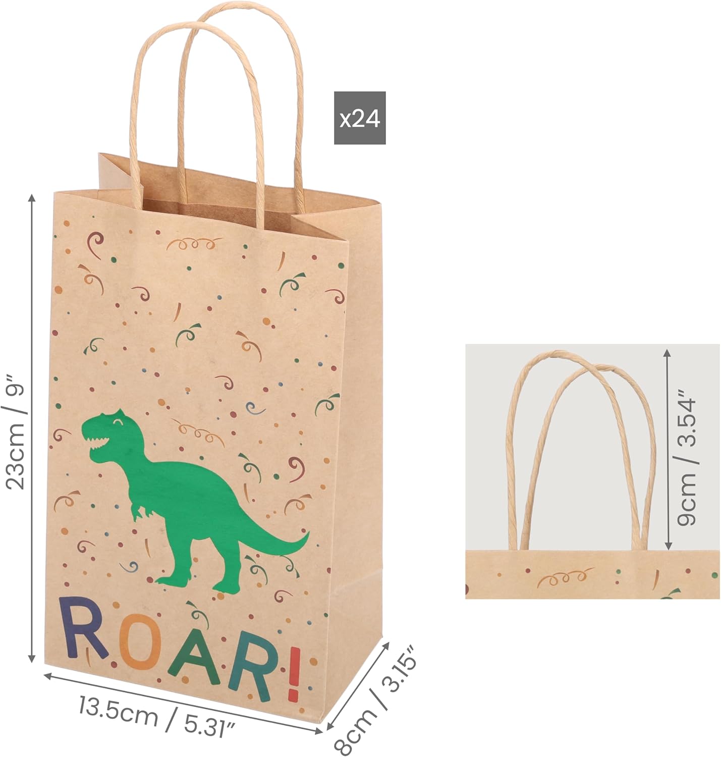 SACCHETTI DI CARTA PER COMPLEANNO BAMBINI: questa confezione contiene 24 sacchetti regalo con dinosauri per bambini. Ogni sacchetto regalo è realizzato in carta kraft marrone di alta qualità con una stampa T-Rex, che lo rende perfetto per una festa di dinosauri per bambini. Tutti i piccoli sacchetti di carta vengono consegnati smontati; una volta aperti sono lunghi 13,5 cm, larghi 7,9 cm e alti 22,8 cm. Queste borse da festa ecologiche hanno una base robusta e 2 robuste maniglie sulla parte superiore delle borse. DECORAZIONE CON DINO: I nostri piccoli sacchetti di carta sono perfetti per il compleanno di un dinosauro. Il design è adatto a ragazzi e ragazze. Sul lato di ogni borsa kraft è stampato un dinosauro T-Rex verde brillante. Sotto questa immagine c'è "RUGGITO!" leggere. I bambini adoreranno queste borse con dinosauri e non vedranno l'ora di scoprire cosa troveranno al loro interno. Combina questi sacchetti di carta in modo colorato con altre decorazioni per il compleanno dei dinosauri come palloncini, piatti dinosauri e tovaglioli dinosauri. BORSE DA COMPLEANNO ECOLOGICHE: queste piccole borse regalo per bambini sono realizzate in materiale ecologico e riciclabile. Si piegano rapidamente e facilmente e mantengono il contenuto al sicuro. Quando la festa è finita, puoi appoggiare i sacchetti di compleanno dei bambini in piano e piegarli per riutilizzarli. Puoi anche scrivere i nomi dei bambini sui sacchetti di caramelle con una penna. Oppure puoi decorare ulteriormente la superficie della carta con adesivi. MOLTE OCCASIONI: Usa questi piccoli sacchetti per caramelle per feste con dinosauri alle feste di compleanno dei bambini, battesimi o baby shower a casa. Puoi anche usare queste borse colorate in classe. Metti regali e caramelle nei sacchetti da distribuire agli ospiti all'inizio o alla fine di una festa. Posiziona le borse da festa sui tavoli come decorazioni per la stanza. Confeziona dolci come caramelle incartate, cioccolatini e piccoli giocattoli nei sacchetti regalo. Grandi aiutanti quotidiani: i nostri prodotti sono costruiti in modo funzionale e combinano funzionalità e stile. Grazie al nostro design accurato, sono costantemente affidabili e pratici quando necessario, ideali per ogni occasione.