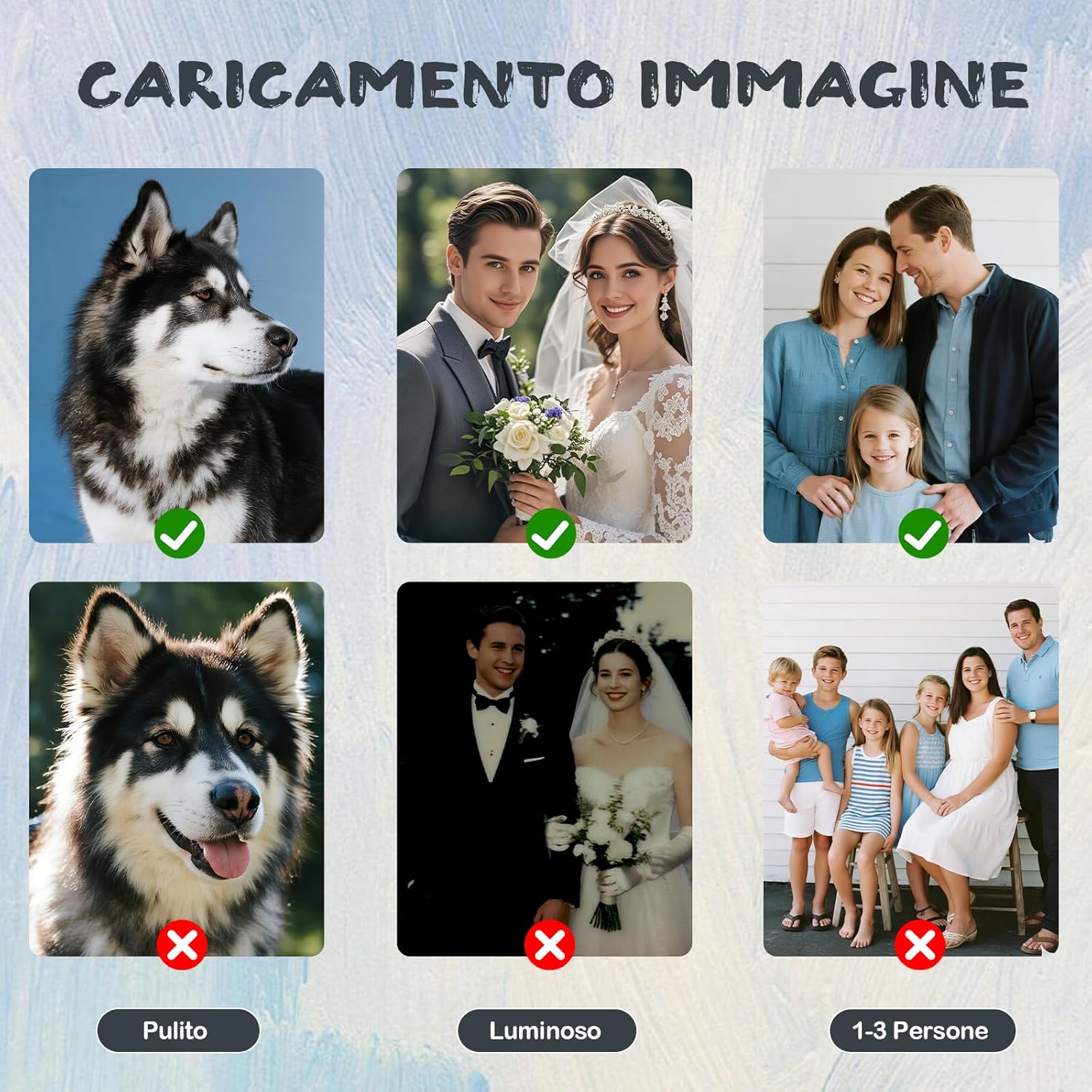 🎨 Crea il Tuo Capolavoro Personalizzato – Trasforma i tuoi ricordi più preziosi in un’opera d’arte unica con il nostro kit di dipingere con i numeri personalizzato. Basta caricare una foto in alta risoluzione (di famiglia, animali o viaggi), e noi la trasformeremo in quadri da dipingere numerati personalizzati. Tutti i colori necessari sono inclusi: crea la tua tela in modo facile e divertente. Perfetto per chi ama dipingi con i numeri adulti o cerca un’attività creativa con paint by numbers. 💖 Facile da Usare per Tutti – Nessuna esperienza? Nessun problema! Il nostro kit di dipingere con i numeri adulti personalizzato include tele pre-stampate con sezioni numerate e colori acrilici brillanti per rendere facile la pittura. Che tu sia un principiante o un artista esperto, questo kit paint by numbers è perfetto per tutti: facile, rilassante e gratificante. Dipingere con i numeri non è mai stato così accessibile. 🖼 Decorazione Personalizzata per la Casa – Una volta completata, la tua pittura con i numeri personalizzata diventerà una decorazione unica per la tua casa. Che sia nel soggiorno, in camera da letto o in ufficio, aggiungerà un tocco personale e significativo a qualsiasi spazio. Quadri da dipingere numerati con la tua storia – un modo creativo per rendere il tuo ambiente davvero tuo. 🎁 Un Regalo Originale e Memorabile – Cerchi un regalo davvero significativo? Il nostro dipingere con i numeri personalizzato è perfetto per compleanni, anniversari, Natale, San Valentino o qualsiasi occasione speciale. È un dono unico per partner, genitori, figli o amici. Crea un ricordo duraturo trasformando una foto cara in una tela con dipingere con i numeri adulti. 💯 Servizio Clienti Reattivo & Kit Completo – Il nostro set dipingi con i numeri adulti include tutto: tela pre-stampata di alta qualità, colori acrilici, tre pennelli e ganci per appendere. Hai domande? Il nostro servizio clienti ti risponde entro 24 ore per garantirti un’esperienza senza stress. Prova la qualità paint by numbers con il supporto che meriti.