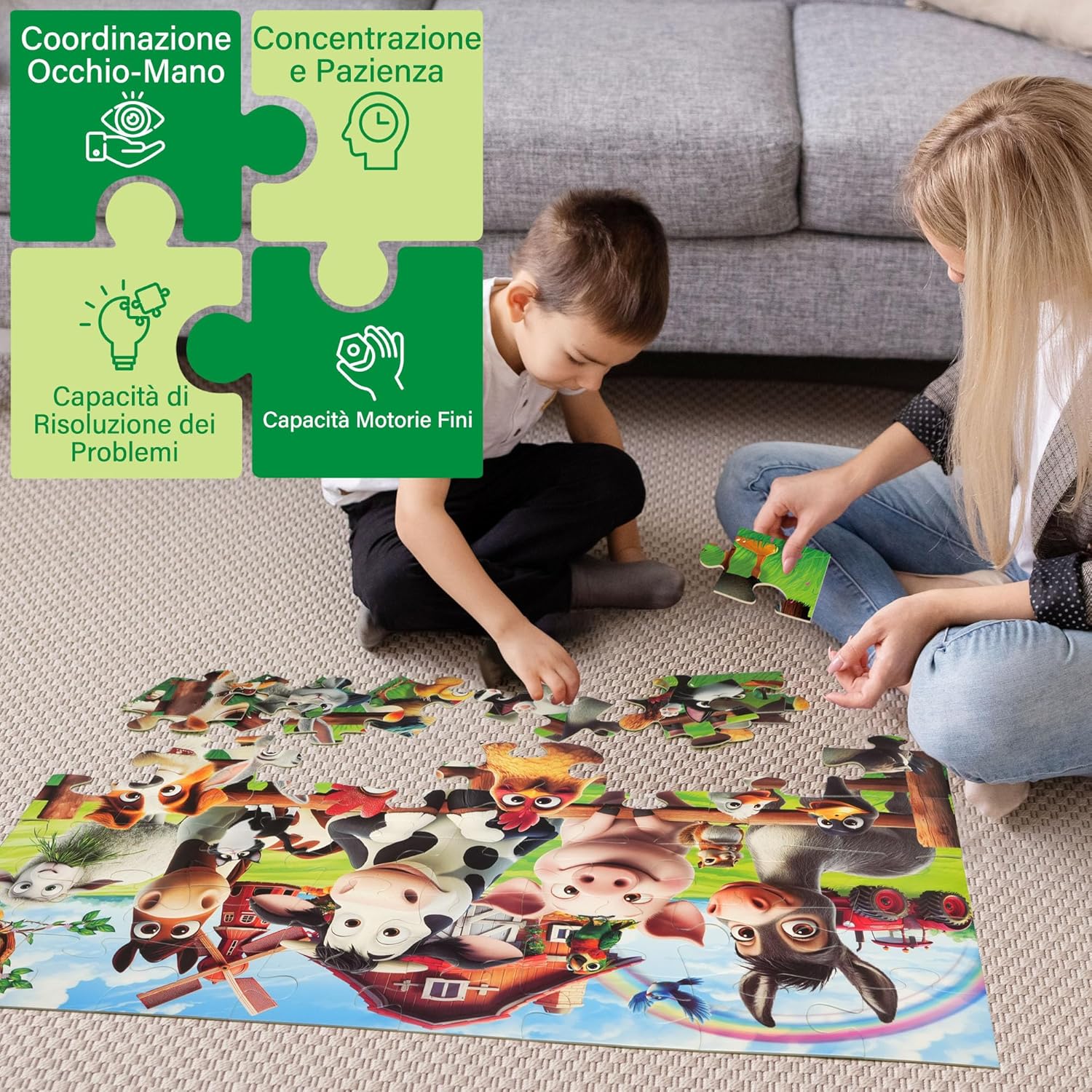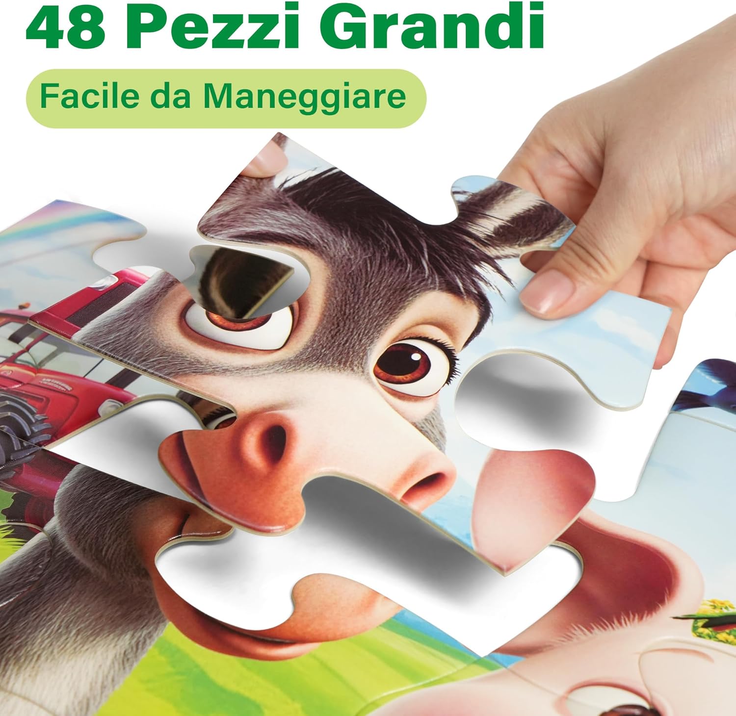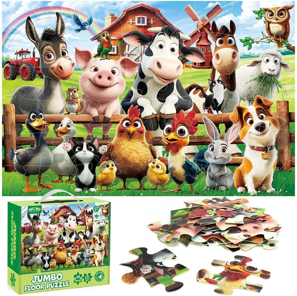 Puzzle da Pavimento XXL con Animali della Fattoria: Puzzle extra-large da 48 pezzi per bambini (90 x 60 cm) con colorati animali della fattoria che affascineranno e istruiranno i bambini dai 3 anni in su Materiale Sicuro e Resistente: Realizzato in materiale spesso, atossico e lavabile, per un divertimento duraturo e una facile pulizia per i genitori Promuove Competenze Chiave e il Riconoscimento Precoce degli Animali: Questo puzzle per bambini piccoli migliora la coordinazione occhio-mano, l'osservazione e le capacità di problem solving, introducendo i bambini a mucche, galline, pecore e altri animali della fattoria in modo giocoso e interattivo Facile da Maneggiare ed Emozionante: I pezzi del puzzle XXL sono perfetti per le manine dei bambini e offrono la giusta sfida per mantenere i bambini impegnati senza frustrazione Attività per famiglie Ricca di Divertimento: I pezzi del puzzle di grandi dimensioni incoraggiano il gioco di gruppo, favoriscono il legame genitore-figlio e sviluppano le capacità di lavoro di squadra, perfetto per i bambini che hanno bisogno di un gioco attivo Regalo Perfetto per Bambini: Questo puzzle per bambini dai 3 anni in su è un regalo ideale per compleanno, Natale o altre occasioni. Un regalo di Natale che unisce intrattenimento e istruzione per portare gioia e apprendimento ai più piccoli