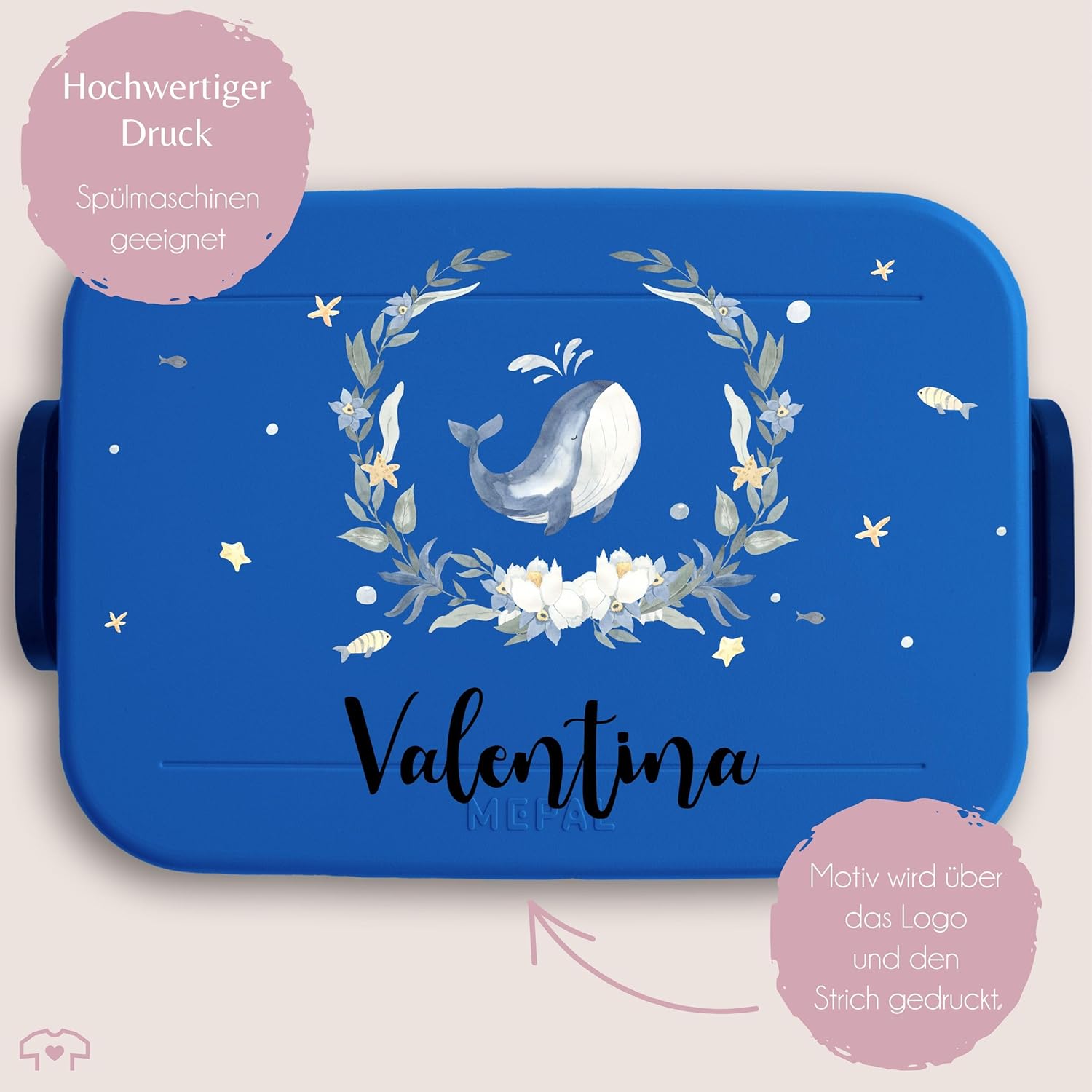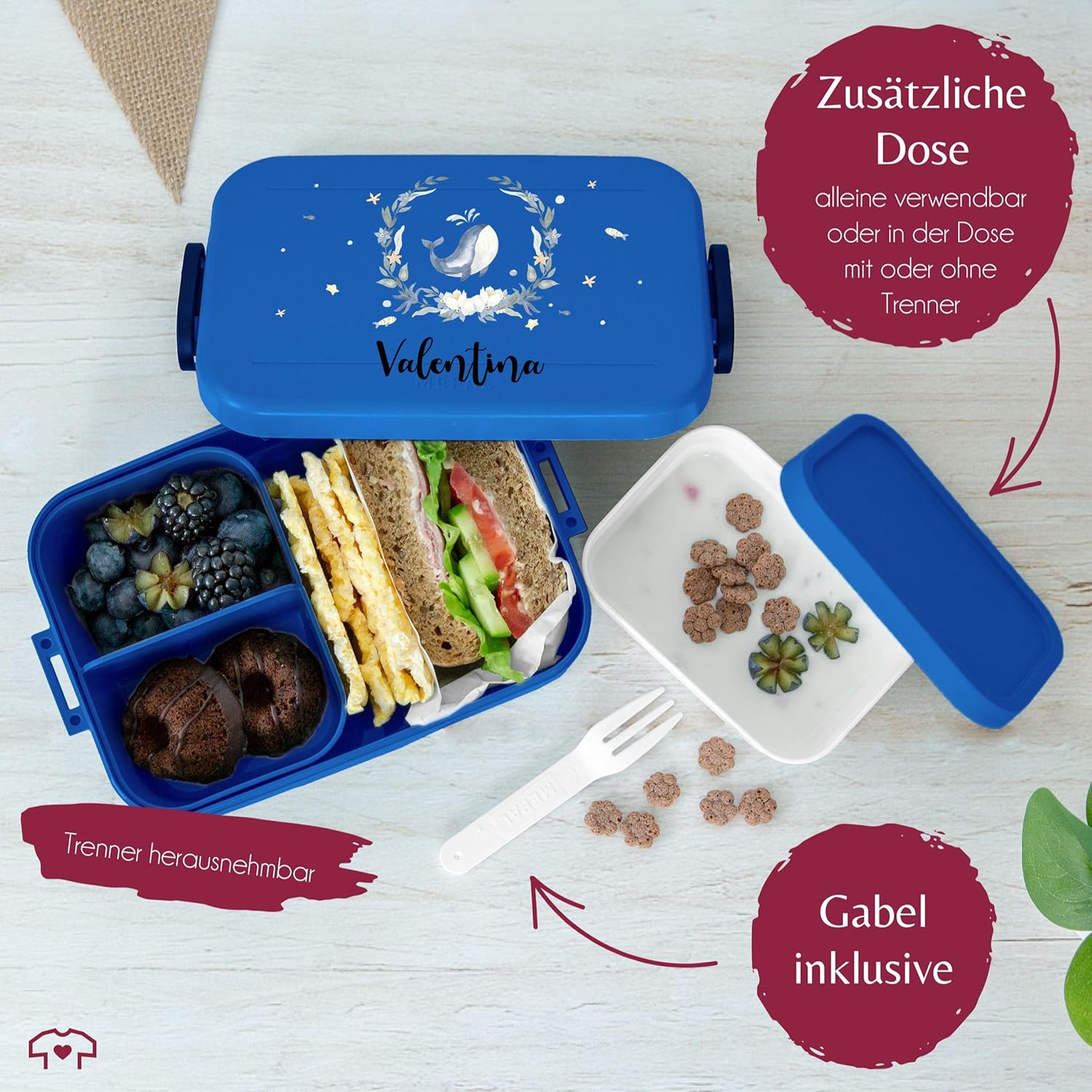 Motivo balena: la simpatica stampa con balena, ghirlanda e nome desiderato è un ottimo regalo per i bambini. Inserti per bento e forchetta per snack: il contenitore per il pranzo bento ha due diversi inserti per bento che consentono di separare cibo e snack. Grazie alla pratica forchetta snack, mangiare in viaggio è particolarmente semplice e soprattutto igienico. Questo rende il bento box ideale come compagno durante le vacanze scolastiche o quando hai fame, non importa se sei in viaggio, a scuola o all'asilo. Spazio sufficiente: questo fantastico contenitore per il pranzo con stampa offre spazio sufficiente per un massimo di quattro panini o altri piccoli snack, come verdure tritate o frutti di bosco. Questo lo rende ideale per un pasto abbondante ed equilibrato durante le vacanze scolastiche o all'asilo. Grazie alla fantastica stampa a motivi potrete regalare ai vostri piccoli un regalo davvero speciale! Lavabile in lavastoviglie: la pulizia della bento box può essere facilmente eseguita in lavastoviglie. Anche il materiale della lattina stampata è privo di BPA. Ciò significa che il contenitore per il pranzo è privo di sostanze chimiche nocive. Ciò significa che puoi goderti lo spuntino della pausa senza preoccupazioni e nulla ostacola un utilizzo sano e sicuro. Ideale per la scuola e l'asilo: il contenitore per il pranzo Bento con una bellissima stampa è ideale per il pranzo a scuola o all'asilo. La lattina è compatta e facile da trasportare. I vari inserti bento permettono inoltre al tuo bambino di gustare un pasto vario e sano.