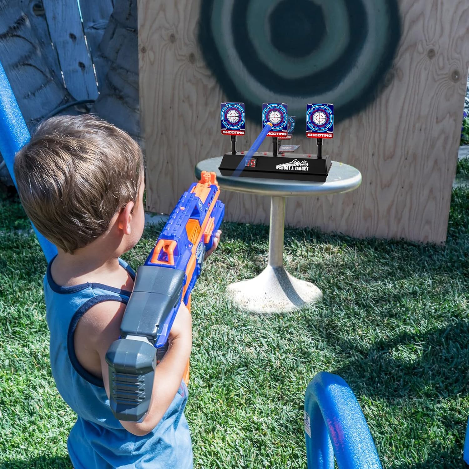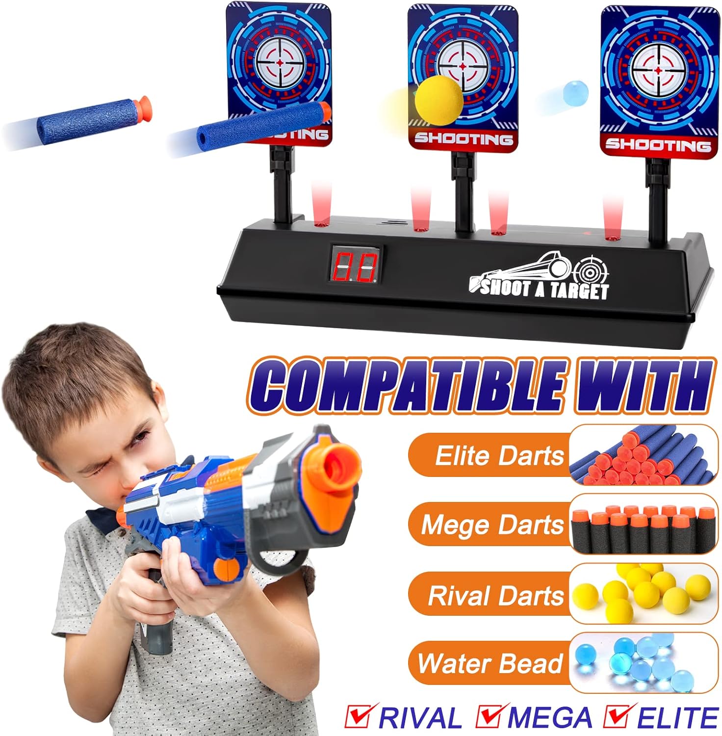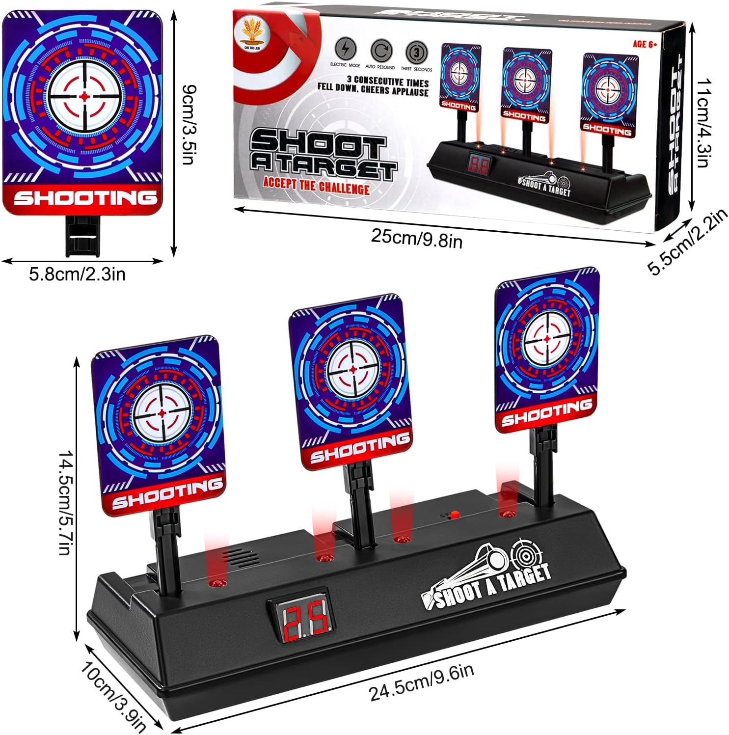 Un sacco di divertimento: Bersaglio motorizzato intelligente compatibile con i blaster della serie Nerf Gun N-Strike Elite/Mega/Rival, i blaster Blob, le pistole BB e altri blaster a proiettile morbido. Effetti sonori realistici: Quando si colpisce il bersaglio, si sente il rumore degli spari o dei vetri che si rompono e le luci lampeggiano, migliorando l'atmosfera del gioco e l'esperienza di tiro. Ripristino automatico: sistema di ingranaggi elettronici incorporato, un punto per colpire tre bersagli, tutti i bersagli rimbalzano automaticamente quando cadono. Alta qualità: Il bersaglio di tiro per bambini è realizzato in plastica ecologica, resistente e non deformabile, non facile da rompere. Richiede 3 batterie da 5A (non incluse). Giocattoli educativi: da usare come esercitazione personale di tiro per migliorare le capacità di mira o per competere con gli amici, ideale per le riunioni di famiglia e i giochi in cortile.