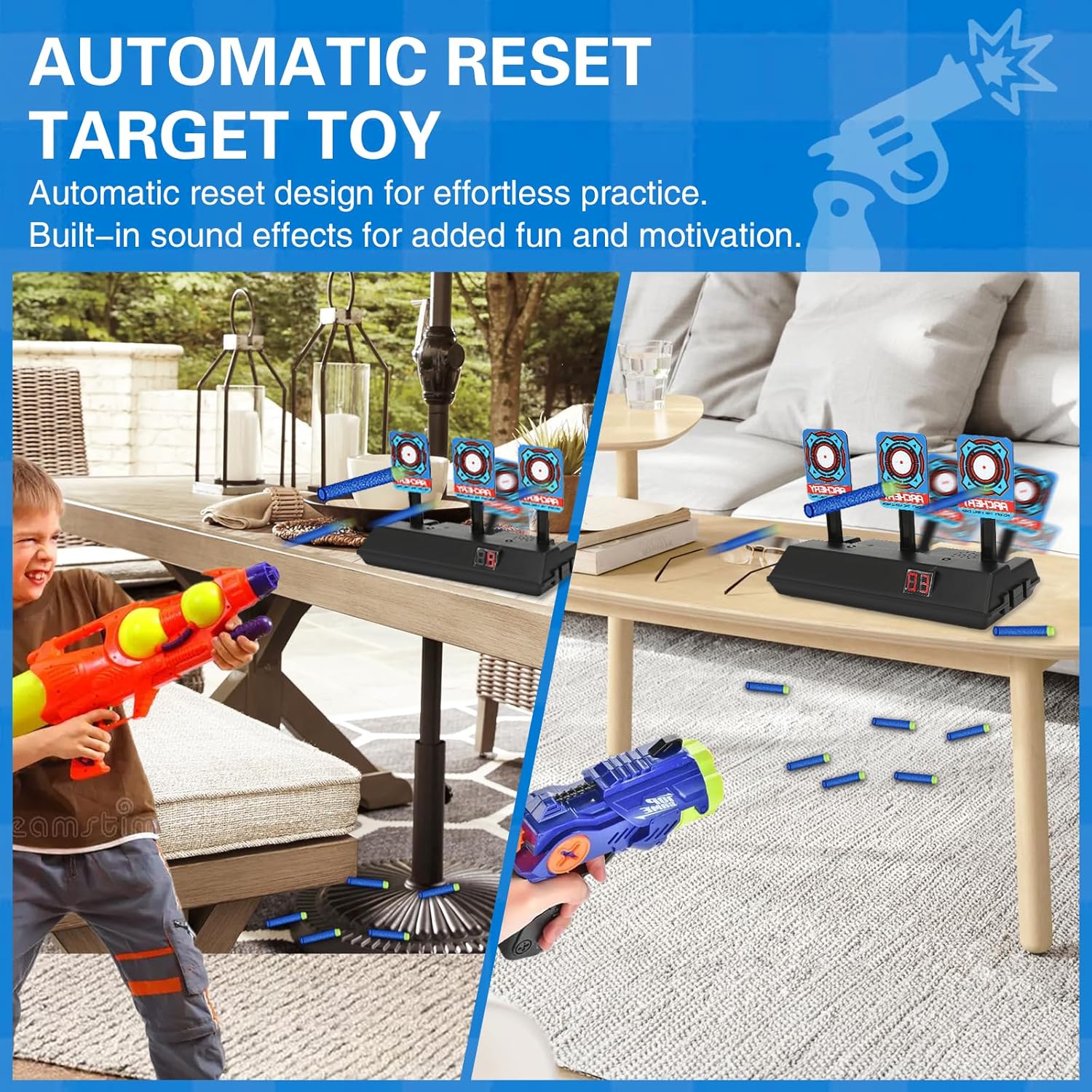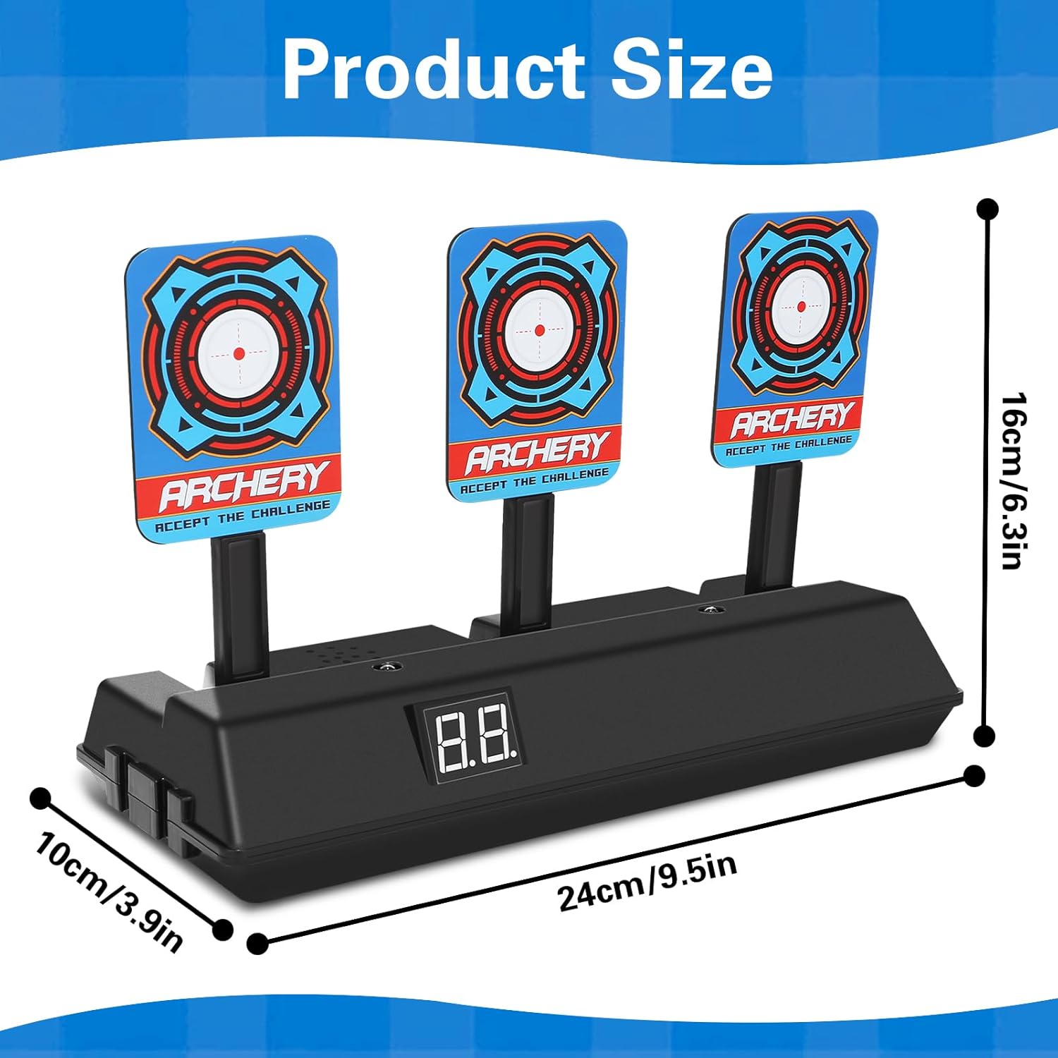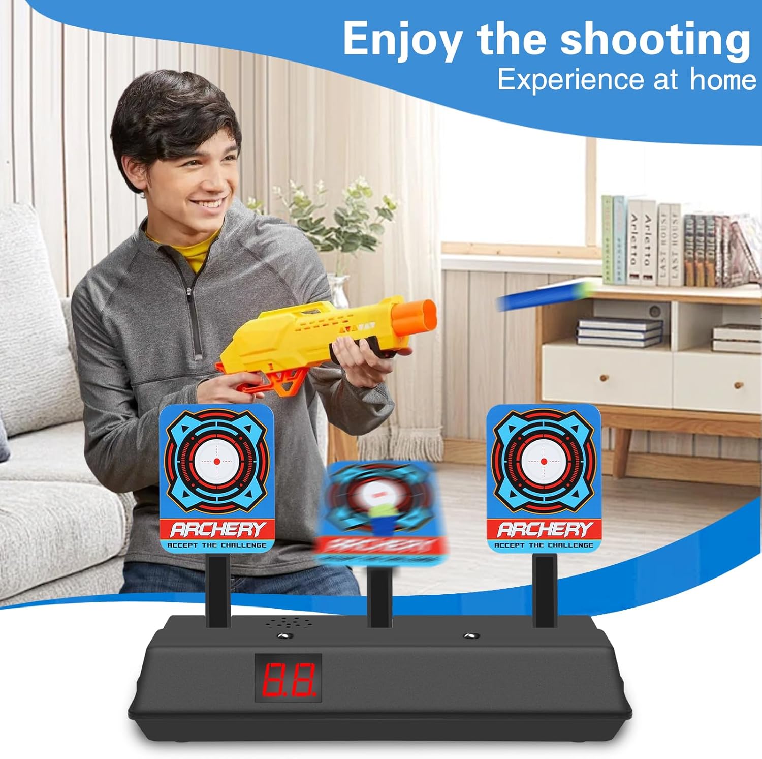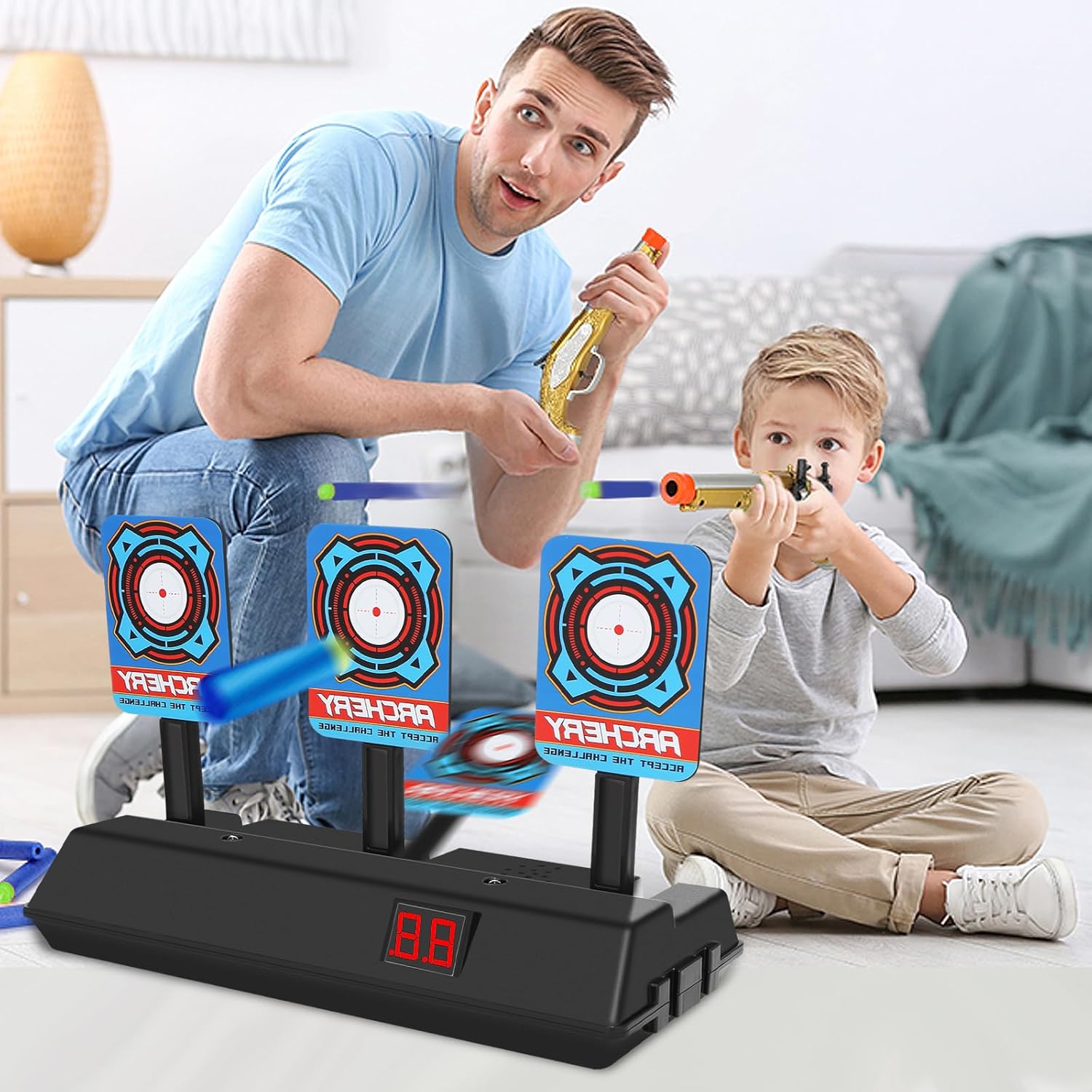 【Contenuto della confezione】: riceverai un bersaglio elettronico automatico con punteggio, che è un giocattolo da tiro molto attraente per i bambini a cui piace sparare e possono giocare a giochi emozionanti e stimolanti con amici e familiari. 【Materiali di alta qualità】: il bersaglio elettronico con punteggio è realizzato in plastica di alta qualità, che è sicura e atossica, durevole e ha bordi lisci, così i bambini possono giocarci con sicurezza. Sono necessarie 3 batterie AA (non incluse). 【Sistema di punteggio automatico】: il bersaglio elettronico digitale con punteggio ha un sistema di punteggio automatico. Con l'aiuto di luci intense, puoi vedere il bersaglio in modo più intuitivo e preciso. Effetti sonori e luminosi realistici assicurano questa sensazione di combattimento, che è facile da padroneggiare anche per i bambini senza esperienza di tiro. 【Giocattoli educativi】: quando spari a tutti e quattro i bersagli, il bersaglio tornerà automaticamente al suo stato originale rapidamente. I giochi di tiro elettrico digitale possono aiutare i bambini a mettere in pratica abilità pratiche e coordinazione occhio-mano e possono anche alleviare lo stress. 【Regalo perfetto】: il giocattolo bersaglio elettronico è adatto a bambini e bambine di tutte le età, può essere utilizzato sia all'interno che all'esterno ed è un regalo perfetto per compleanni, feste, festa dei bambini, Natale, Halloween e Capodanno.