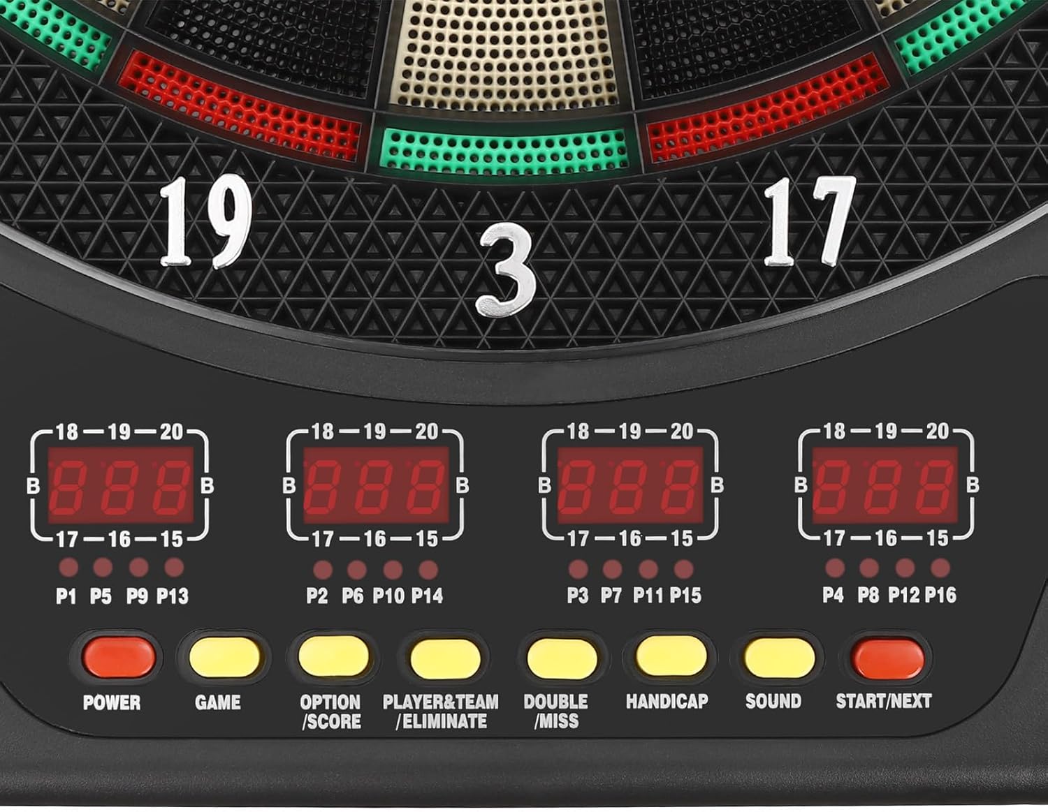 [Durevole]: il bersaglio è realizzato principalmente in ABS e PP ed è stato realizzato con processo di stampaggio a iniezione, in modo che il bersaglio sia robusto e resistente all'abrasione e abbia una lunga durata. [Molteplici modalità di gioco]: il bersaglio supporta fino a 16 giocatori e viene fornito con 27 modalità di gioco con 243 stili di gioco avanzati per portare più divertimento a te e ai tuoi amici. [Esperienza di gioco piacevole]: con 4 schermi LED, istruzioni vocali e conteggio automatico, non è necessario contare manualmente il punteggio, rendendo il gioco più facile e divertente. [Facile da usare]: il bersaglio è etichettato sul bordo con il numero di gioco e il nome del gioco, e con il pannello di controllo e i pulsanti chiari è possibile cambiare facilmente la modalità di gioco e regolare il volume. [Design intelligente]: le frecce in ferro con punte morbide e il design a nido d'ape garantiscono un'esperienza di gioco sicura e confortevole. Inoltre, l'anello di protezione esterno della maglia intorno all'area bersaglio protegge sia le freccette che la parete da eventuali danni.