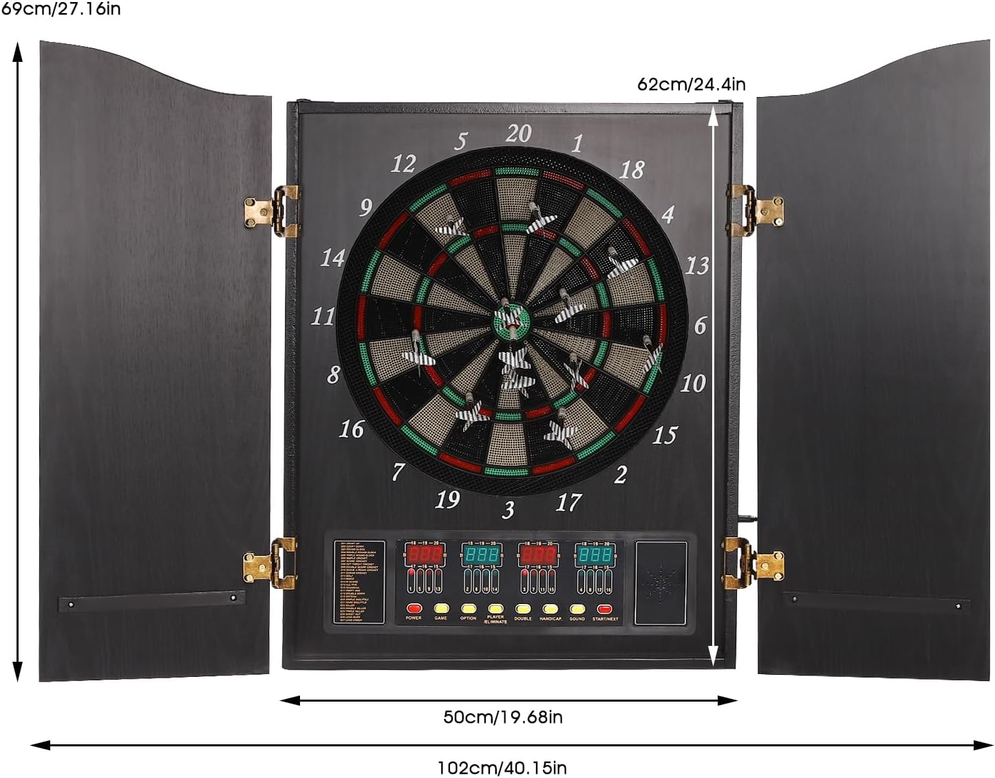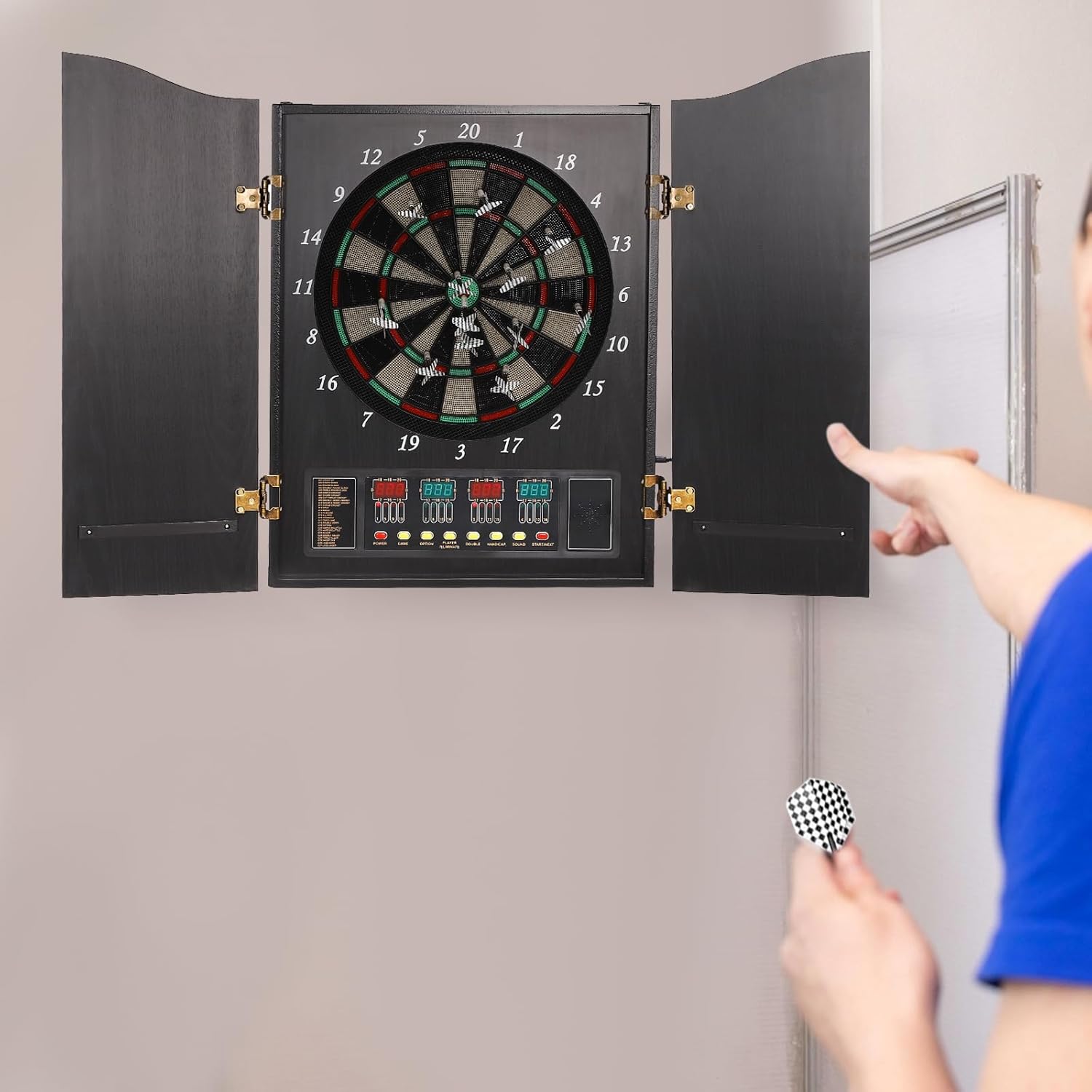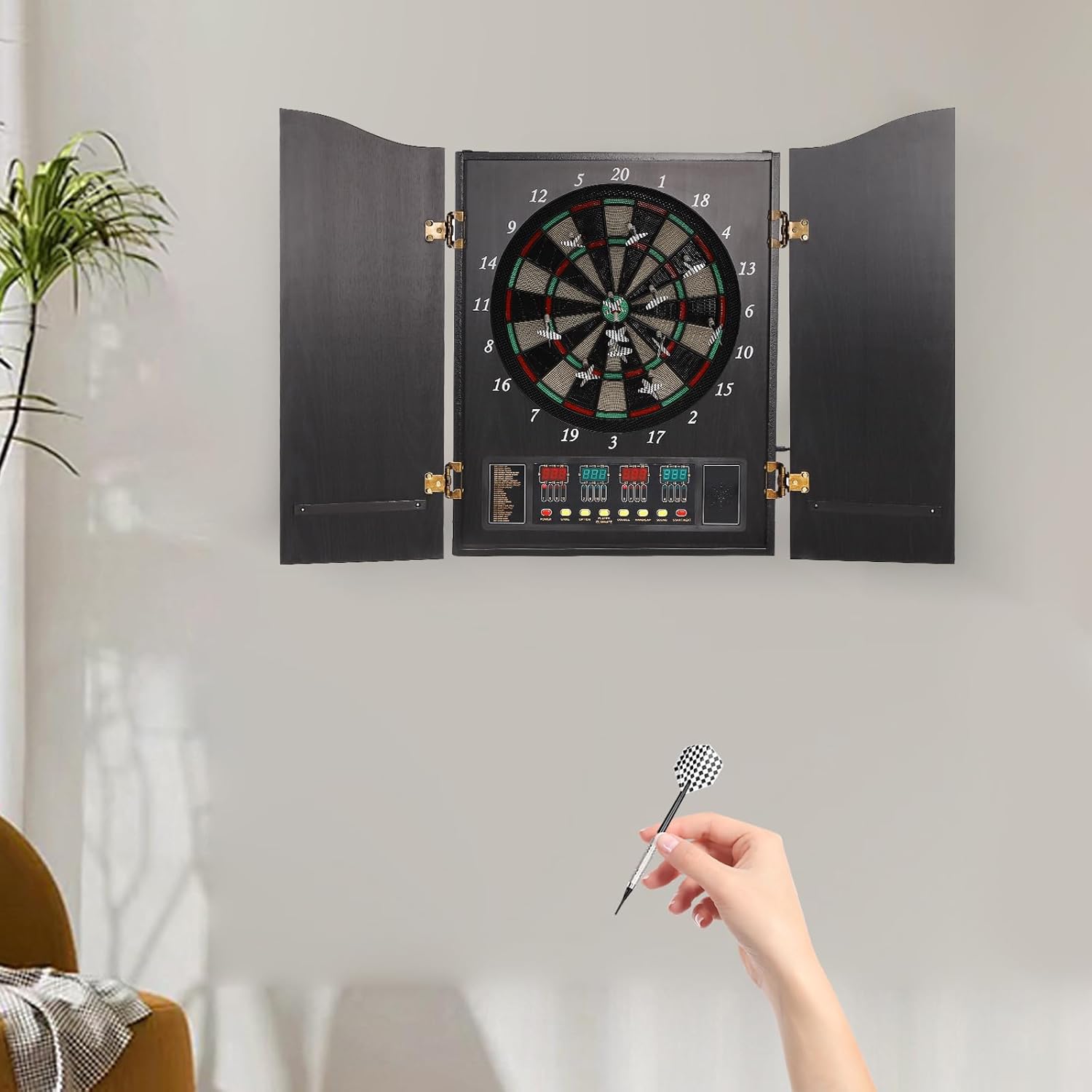 【Bersaglio elettronico con 243 giochi】: 27 categorie principali, 243 sub-varianti, bersaglio elettronico per 1-16 giocatori, modalità torneo e allenamento, perfetto per principianti e professionisti. 【4 display LED & annuncio vocale inglese】: display luminosi mostrano colpi, punteggio residuo e avversità; la voce prompt esegue il gioco – niente calcolo manuale, più divertimento durante le freccette. Armadio in MDF di alta qualità: robusto alloggiamento in legno con 2 porte eleganti, ripiano laterale per frecce morbide, non danneggia la parete e salvaspazio. Aspetto elegante come un murale, ideale per soggiorno, ufficio, sala feste. Set completo di freccette morbide: include 12 freccette, 88 punte di ricambio, alimentatore, materiale di fissaggio e istruzioni grafiche tedesche – iniziare subito a partire; punte in plastica morbida per giocare in sicurezza anche con i bambini. 【Facile da montare e sicurezza】: fori preforati, pieghevole, 9,5 kg di peso, adattatore UE 6 V, bersaglio elettronico montato in pochi minuti a parete o dispositivo a terra; previene danni alla parete.