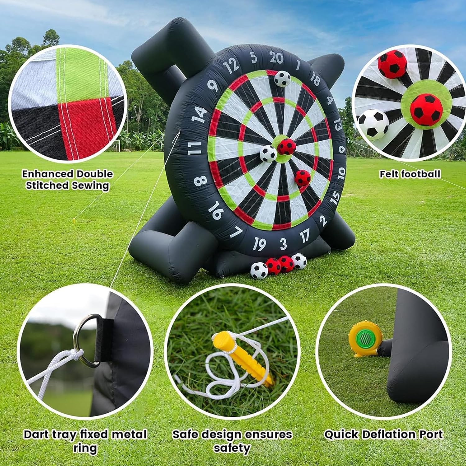 Maggiore durata e stabilità: questo bersaglio gonfiabile per freccette da calcio misura 3 x 3 m, realizzato in tessuto Oxford 210d per proprietà antistatiche e resistenti all'usura. Presenta giunti a doppia cucitura e una superficie bersaglio autoriparante con forte adesione, garantendo un facile montaggio e smontaggio senza danneggiare la palla. Installazione rapida e comoda conservazione: le freccette da calcio possono essere installate in meno di 2 minuti, con un promemoria per chiudere la cerniera prima di gonfiare. Progettato per un facile gonfiaggio e sgonfiaggio, si piega in modo compatto per un facile trasporto e stoccaggio, anche se si dovrebbe prestare attenzione per evitare oggetti appuntiti per evitare l'usura. Design innovativo e coinvolgente: viene fornito con 8 palloni da calcio in feltro, che fondono l'emozione del calcio e delle freccette in un unico sport. Il grande bersaglio gonfiabile autoadesivo è perfetto per bambini e adulti, offrendo un gameplay semplice ma divertente in cui i giocatori possono calciare i palloni sul tabellone, con opzioni per registrare punteggi o inventare nuovi giochi. Applicazioni versatili: ideale per gli appassionati di calcio e rugby, nonché per l'uso in scuole, vacanze al mare, campi estivi, eventi aziendali e feste in giardino. Promuove uno stile di vita attivo e un lavoro di squadra tra amici e familiari. Pacchetto completo di accessori: include 8 palloni da calcio, un soffiatore, una pompa ad aria, 8 picchetti, 4 corde e 4 sacchi di sabbia. Il nostro servizio clienti è disponibile 24/7 per qualsiasi richiesta sui nostri prodotti, assicurandoti di avere tutte le informazioni necessarie prima di effettuare un acquisto.