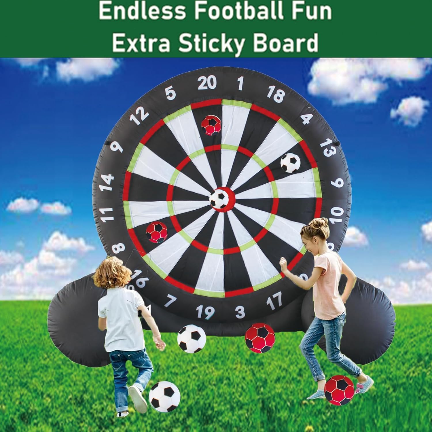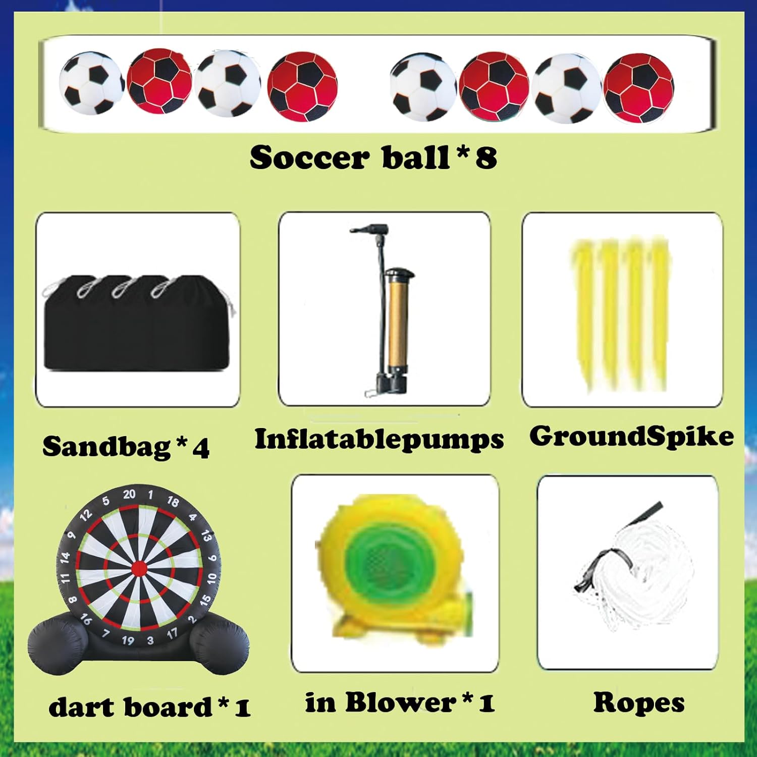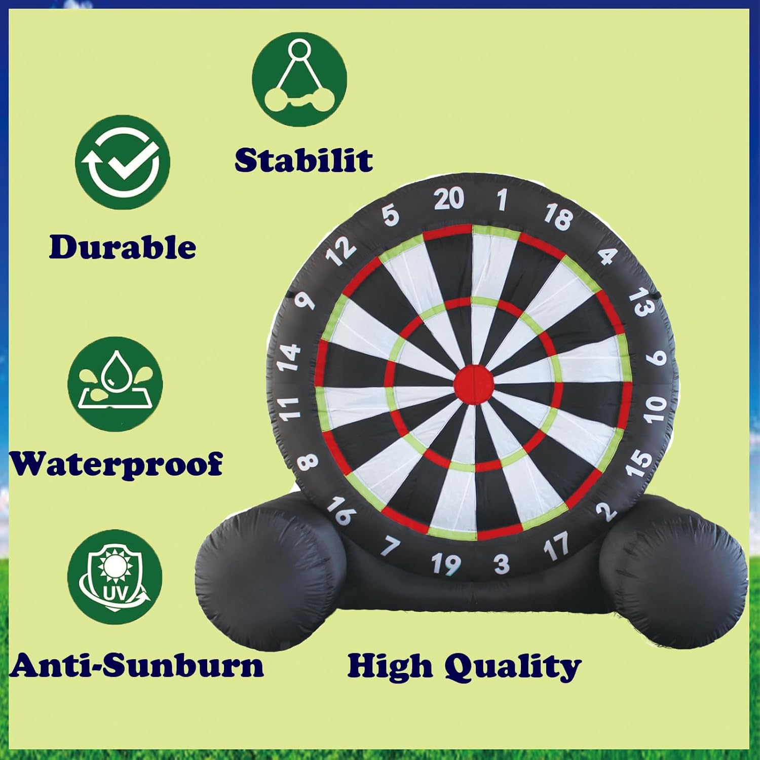 Il calcio in feltro incluso: prova l'emozione di calciare le freccette, l'ultimo sport che combina calci un calcio con le freccette. Perfetto per gli sport per adulti, questo bersaglio extra large dispone di una superficie autoadesiva per facilità d'uso. Costruzione durevole e robusta: il nostro bersaglio per freccette misura 3 m x 3,4 m (larghezza x altezza) ed è realizzato in tessuto Oxford 210D di alta qualità, resistente all'elettricità statica, garantendo durata e longevità. La tecnologia a doppia cucitura migliora la tenuta d'aria e la stabilità generale. Installazione rapida e facile da riporre: goditi una configurazione senza problemi con questo bersaglio gonfiabile che può essere gonfiato in soli 2 minuti. Basta aprire la cerniera prima di gonfiare e quando si sgonfia può essere facilmente ripiegata in un formato compatto e comodamente riposto. Applicazione: punti facendo calpestare i palloni da calcio sfocati sull'enorme bersaglio da 3 m, rendendolo un'attività divertente e coinvolgente per riunioni di famiglia, eventi scolastici, feste in giardino o esercizi di team building aziendali. Crea le tue regole e tieni traccia dei punteggi per un intrattenimento senza fine. Completo di accessori: il set di freccette viene fornito con soffiatore elettrico, pompa a pedale, perni a sfera, punte, corda, panno di riparazione, custodia e sacchetto di sabbia. Questo accessorio assicura che tu sia completamente attrezzato per le attività quotidiane rendendo l'installazione e lo stoccaggio un gioco da ragazzi.