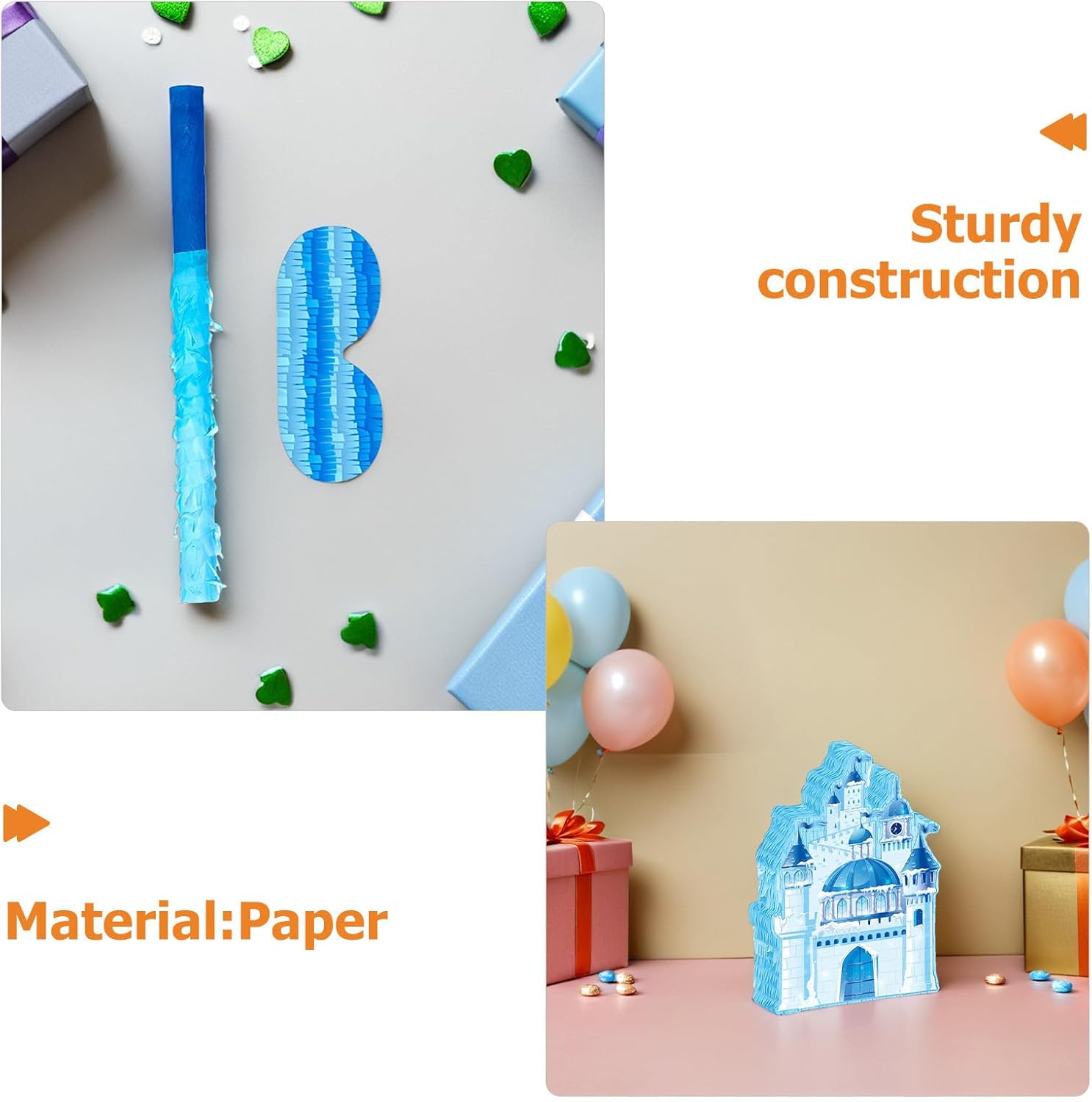 Costruzione in carta: questo contenitore per piñata di caramelle è realizzato in carta, garantendo ai tuoi bambini il divertimento della piñata del castello durante i giochi di festa della piñata Forniture per feste: perfetta per feste di compleanno, eventi scolastici o matrimoni, questa decorazione della piñata del castello brilla sia come decorazione della pignatta per matrimoni che come intrattenimento per la pignatta per feste per bambini Installazione semplice: semplice decorazione della piñata da appendere, trasforma qualsiasi spazio con il fascino della decorazione della piñata del castello e il divertimento visivo Semplice accesso per il riempimento: l'apertura superiore con adesivo ti consente di riempire la piñata per la festa con dolcetti, caramelle, giocattoli o coriandoli Decorazione incantevole: che si tratti di una decorazione per una festa in castello o di un matrimonio da sogno piñata nel castello, questo portagiocattoli piñata arricchisce la tua festa e regala ricordi felici