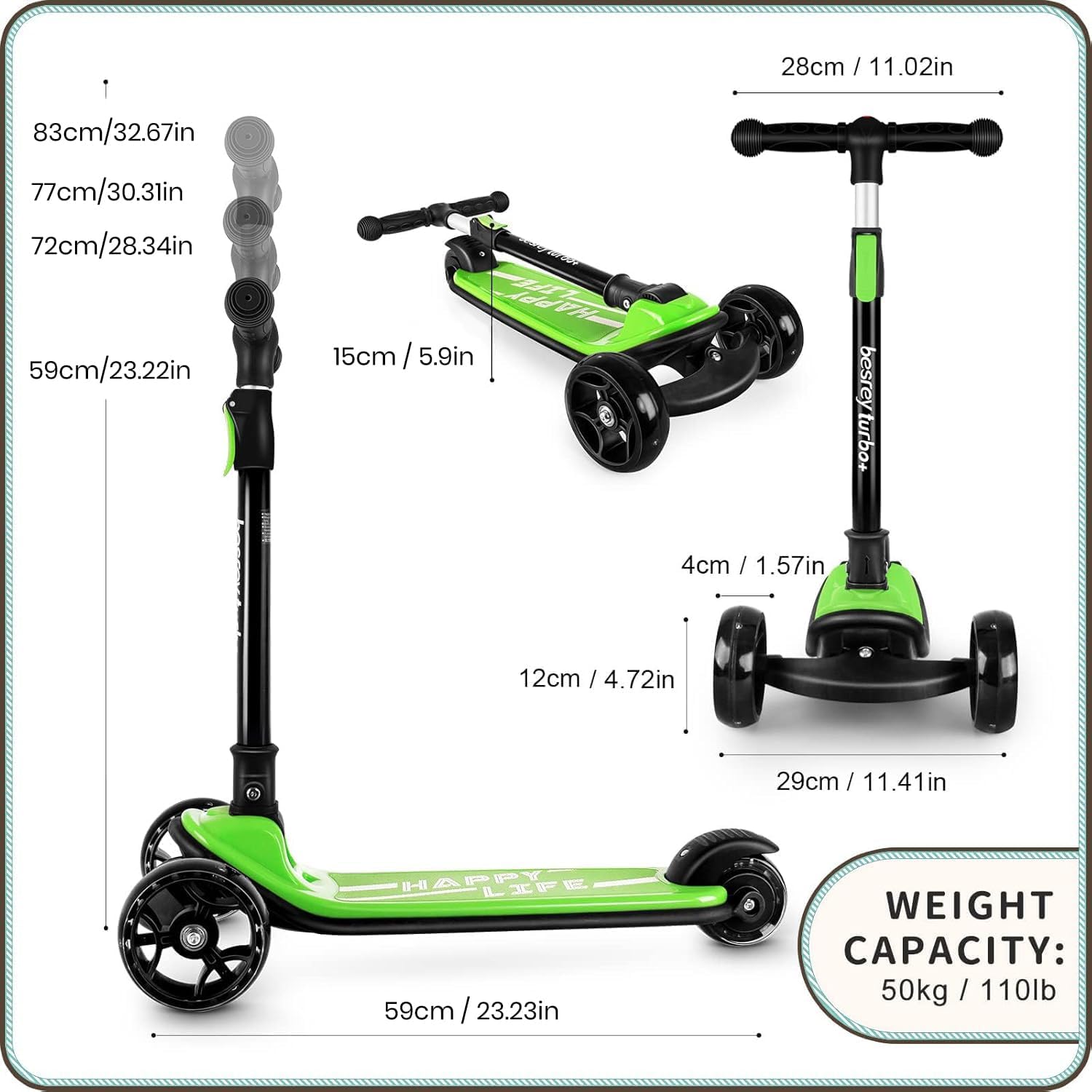 🏆Altezza Regolabile a 4 Livelli - Il monopattino è progettato con manubri TPR e la barra a T può essere regolata in 4 opzioni di altezze 59/72/78/83 cm (misurato dal pavimento). Il Monopattino è adatto per bambini dai 2 ai 10 anni. 🏆Ruote in PU con LED lampeggiante - lo scooter per bambini è dotato di 2 grandi ruote a LED anteriori e una piccola a LED posteriore, che si attivano con il movimento senza bisogno di batterie. Freno posteriore altamente sensibile, si ferma quando viene calpestato. 🏆Guida Facile - Questo scooter è dotato di un cuscinetto ABEC-7. I bambini possono controllare la svolta e mantenere l'equilibrio facilmente grazie alla tecnologia Lean-to-Steer inclinando il corpo nella direzione in cui si vuole andare. Inoltre le ruote Larghe garantiscono maggiore stabilità e aderenza su vari tipi di terreni. 🏆Pieghevole Veloce - non è necessario assemblare, solo un passaggio per aprirlo , facile da trasportare e riporre. 🏆Pedana durevole e ampia - 32 * 13 cm, che può ospitare entrambi i piedi, fornendo più comfort e una migliore stabilità. Robusto, peso massimo 50 kg. Approvato lo standard americano ASTM F963-17 / certificazione europea EN71. 🏆Supporto soddisfacente - besrey fornisce un ottimo servizio clienti, i nostri prodotti hanno superato tutti i test di sicurezza richiesti; dai materiali di qualità al design accurato e alle istruzioni, puoi essere certo che i nostri prodotti sono sicuri per i bambini; forniamo anche una politica di restituzione incodizionata di 24 mesi e una garanzia A VITA per la tua esperienza di acquisto soddisfatta.