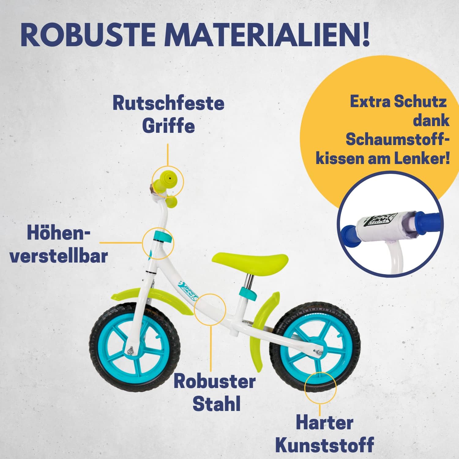 ALTEZZA REGOLABILE - L'altezza della Balance Bike per bambini è regolabile, quindi la Balance Bike didattica può essere facilmente regolata all'altezza desiderata e può quindi essere utilizzata a lungo. GUIDA SICURA - I pneumatici in schiuma dura garantiscono un elevato livello di comfort durante la guida e garantiscono un'efficiente trasmissione della potenza grazie alla rotazione senza sforzo delle ruote MATERIALI ROBUSTI - La bicicletta per bambini è realizzata in robusto acciaio, che ne garantisce la longevità - le maniglie antiscivolo garantiscono una presa sicura PROTEZIONE DEGLI INFORTUNI - Il cuscino in schiuma sul manubrio protegge anche il bambino da possibili lesioni in caso di caduta - quindi nulla ostacola il piacere di giocare QUALITÀ DALLA CONVINZIONE - Come azienda a conduzione familiare di Brema, progettiamo per voi tendenze in prodotti per lo sport e il tempo libero da oltre 40 anni: la vostra soddisfazione è ciò che ci guida