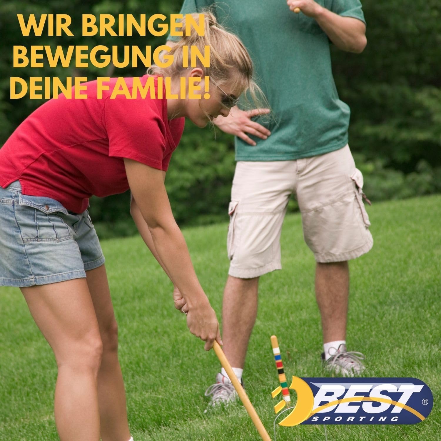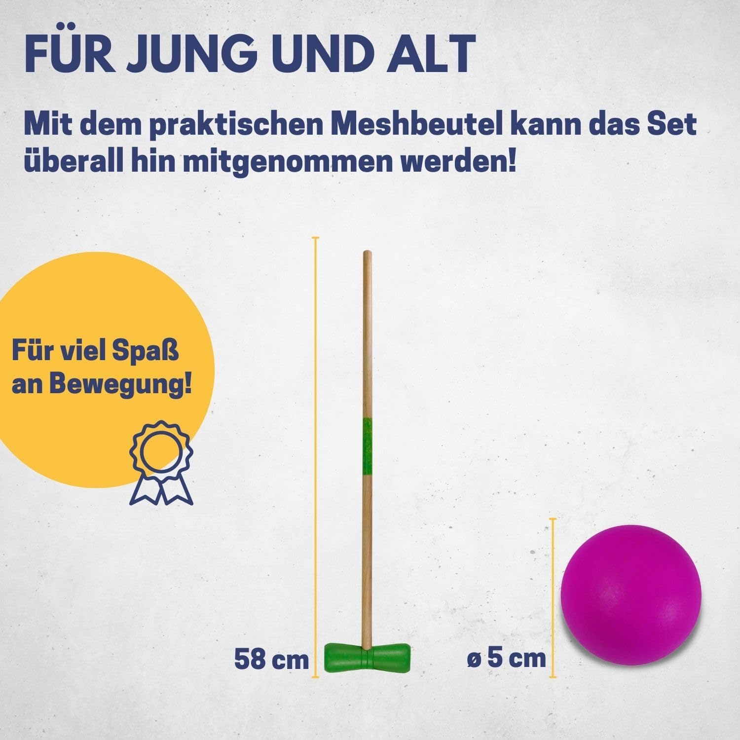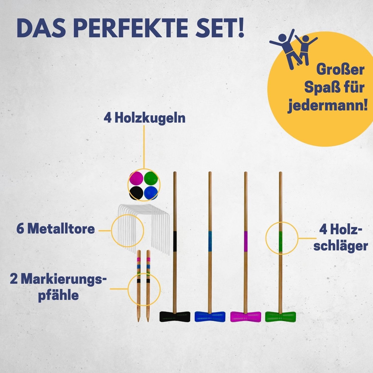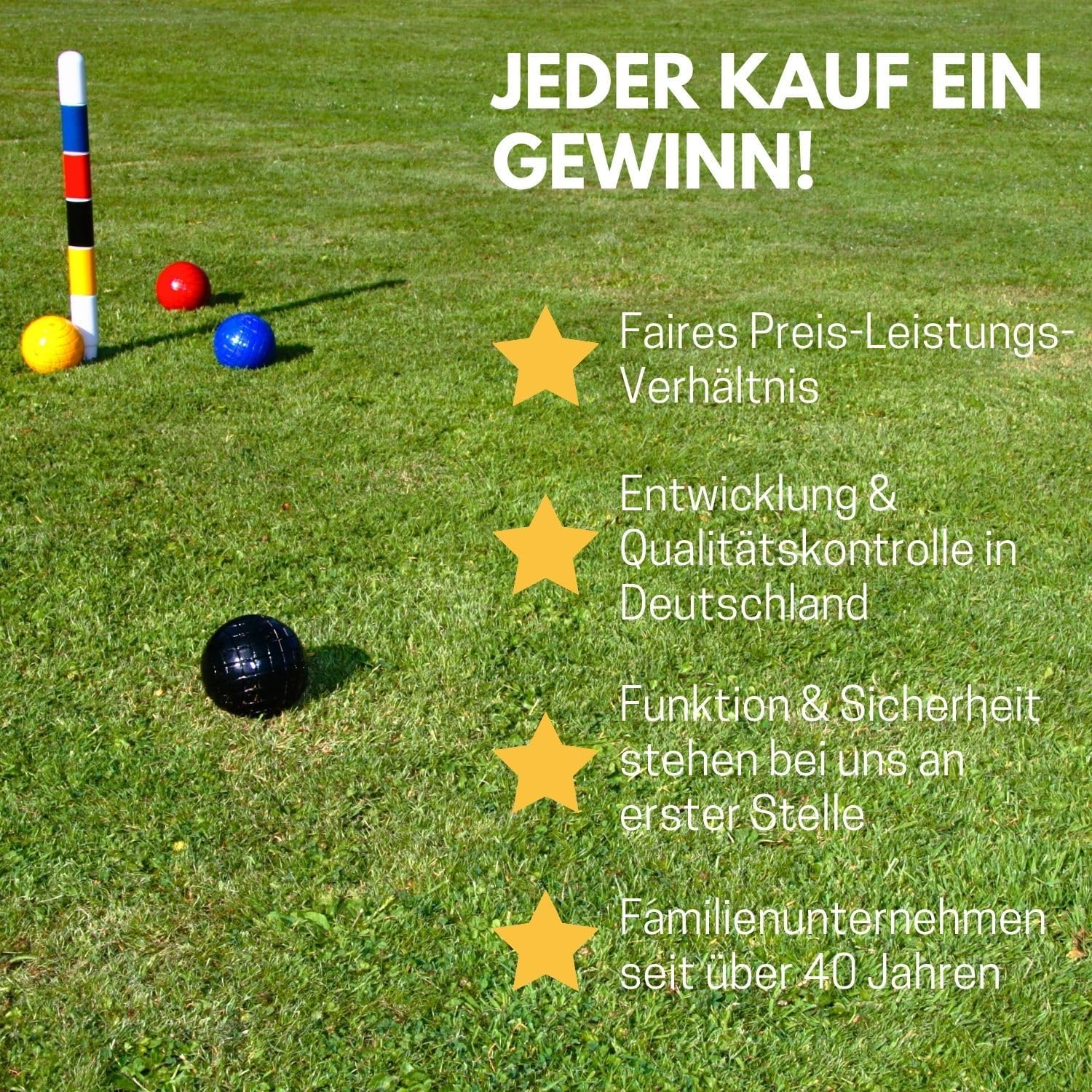 AZIONE DI GRUPPO - Il gioco del croquet è un grande divertimento con tutta la famiglia o gli amici. Lo scopo di questo gioco è far passare la palla attraverso tutte le porte fino al bersaglio con il minor numero di colpi possibile. ALTA QUALITÀ - I nostri giochi da esterno per bambini e adulti colpiscono tutti per la loro qualità robusta e squisita. Ecco perché i paletti, le racchette e le palline sono di legno, le porte sono di metallo. GIOCA E DIVERTIMENTO - I nostri giocattoli da esterno possono essere portati ovunque con la borsa inclusa. Che si tratti di una partita di croquet nel parco, della prossima festa in giardino o in spiaggia. TUTTO IN UNO - Qui trovi tutto in un set da croquet, anche con la borsa a rete inclusa. Sono incluse 4 racchette di legno colorate e palline di legno, 10 porte di metallo e 2 pali per segnare. QUALITÀ DALLA CONVINZIONE - Come azienda a conduzione familiare di Brema, progettiamo per voi le tendenze dei prodotti per lo sport e il tempo libero da oltre 40 anni: la vostra soddisfazione è ciò che ci guida