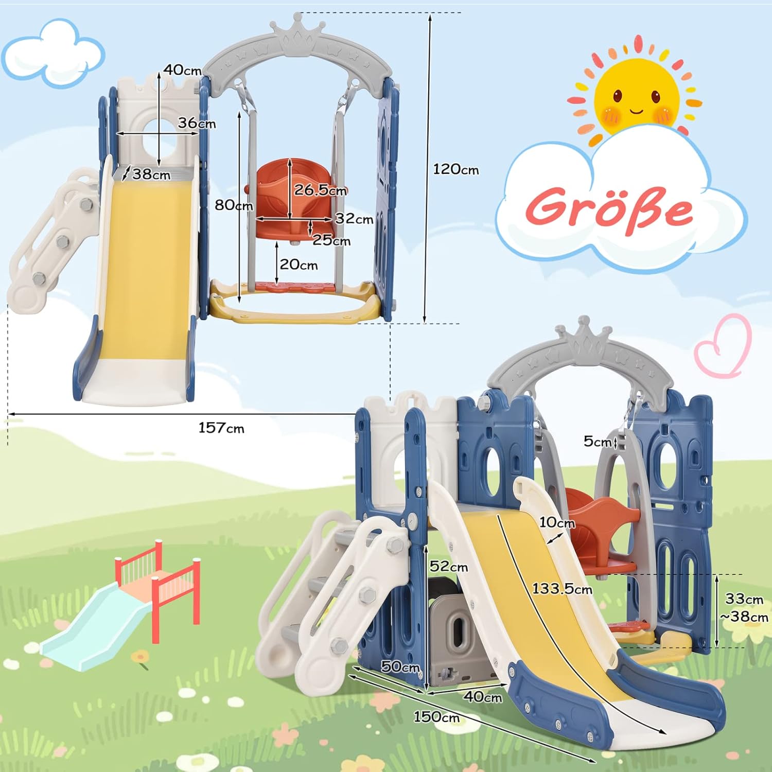 Parco giochi 5 in 1 per bambini: guarda i tuoi bambini divertirsi in questo magico mondo pieno di divertimento. Questo set 4 in 1 con scivolo e altalena include uno scivolo extra lungo, un'altalena, un canestro da basket e una struttura per l'arrampicata con spazio per riporre gli oggetti. Perfetto per il gioco attivo e lo sviluppo dei bambini più piccoli. Lo scivolo è realizzato in polietilene ad alta densità (HDPE), sicuro e robusto. Altalena rinforzata innovativa: questa altalena è un giocattolo che i bambini non possono lasciare. L'abbiamo appositamente migliorata e, per motivi di sicurezza, l'ampia seduta è dotata di un dispositivo di protezione antiribaltamento a T, mentre la seduta comoda e la costruzione professionale rendono questa altalena più funzionale e stabile. Parco giochi per interni ed esterni: questo set di altalene per bambini è facile da montare e smontare e può essere utilizzato sia all'interno che all'esterno. Ad esempio, in soggiorno, nella cameretta, nella sala giochi, nell'asilo nido, nell'asilo nido, nel parco giochi, nel prato, nel cortile o in giardino. Crea un parco giochi privato ed esclusivo per i tuoi bambini. È ideale per le feste di compleanno. Un compagno ideale per avventure indoor e outdoor: questo scivolo per bambini non è solo un set di giocattoli, ma anche un compagno per le tue avventure indoor e outdoor. La sua struttura resistente lo rende il compagno perfetto per il prossimo appuntamento di gioco del tuo bambino. Non è solo un gioco da arrampicata per bambini da 1 a 3 anni, è un compagno per i bambini ogni volta che scivolano, si arrampicano ed esplorano, rendendo ogni avventura sicura e divertente. Facile da montare: questo scivolo per bambini è adatto a bambini da 1 anno in su. Puoi montare facilmente lo scivolo seguendo le istruzioni e il video di installazione nella nostra pagina dei dettagli. I componenti modulari possono essere collegati saldamente senza attrezzi complessi, consentendo una rapida installazione e modifiche di configurazione. Consigli: verificare che le viti siano ben serrate prima dell'uso e serrarle regolarmente dopo l'uso. Per garantire stabilità e sicurezza durante l'uso, aggiungere acqua o sabbia alla base dell'altalena.