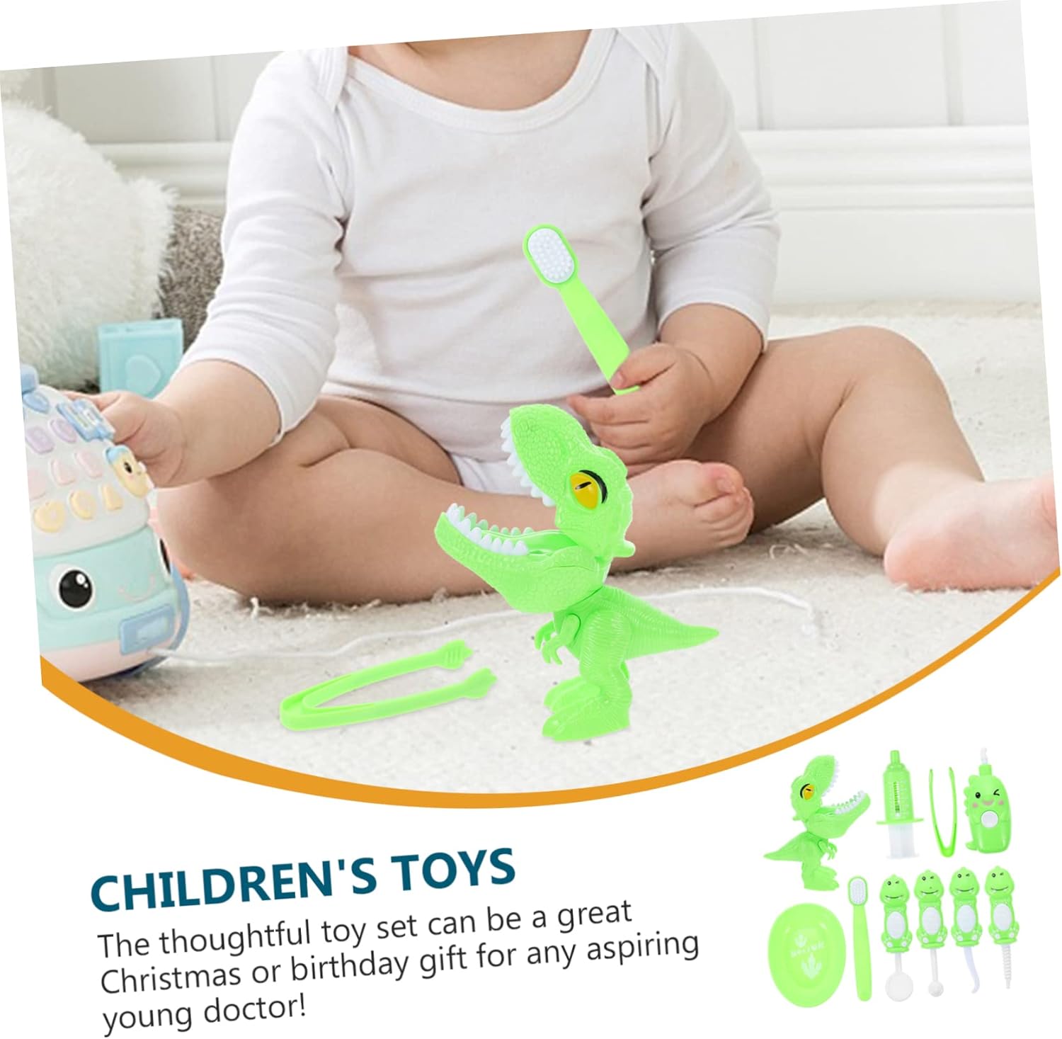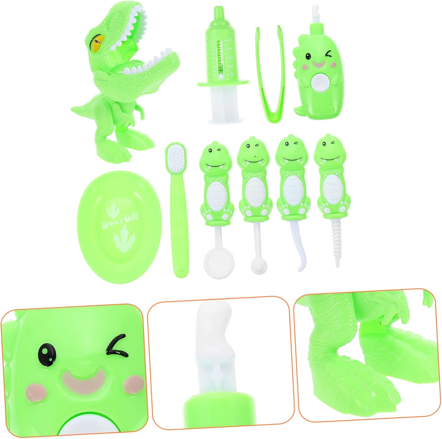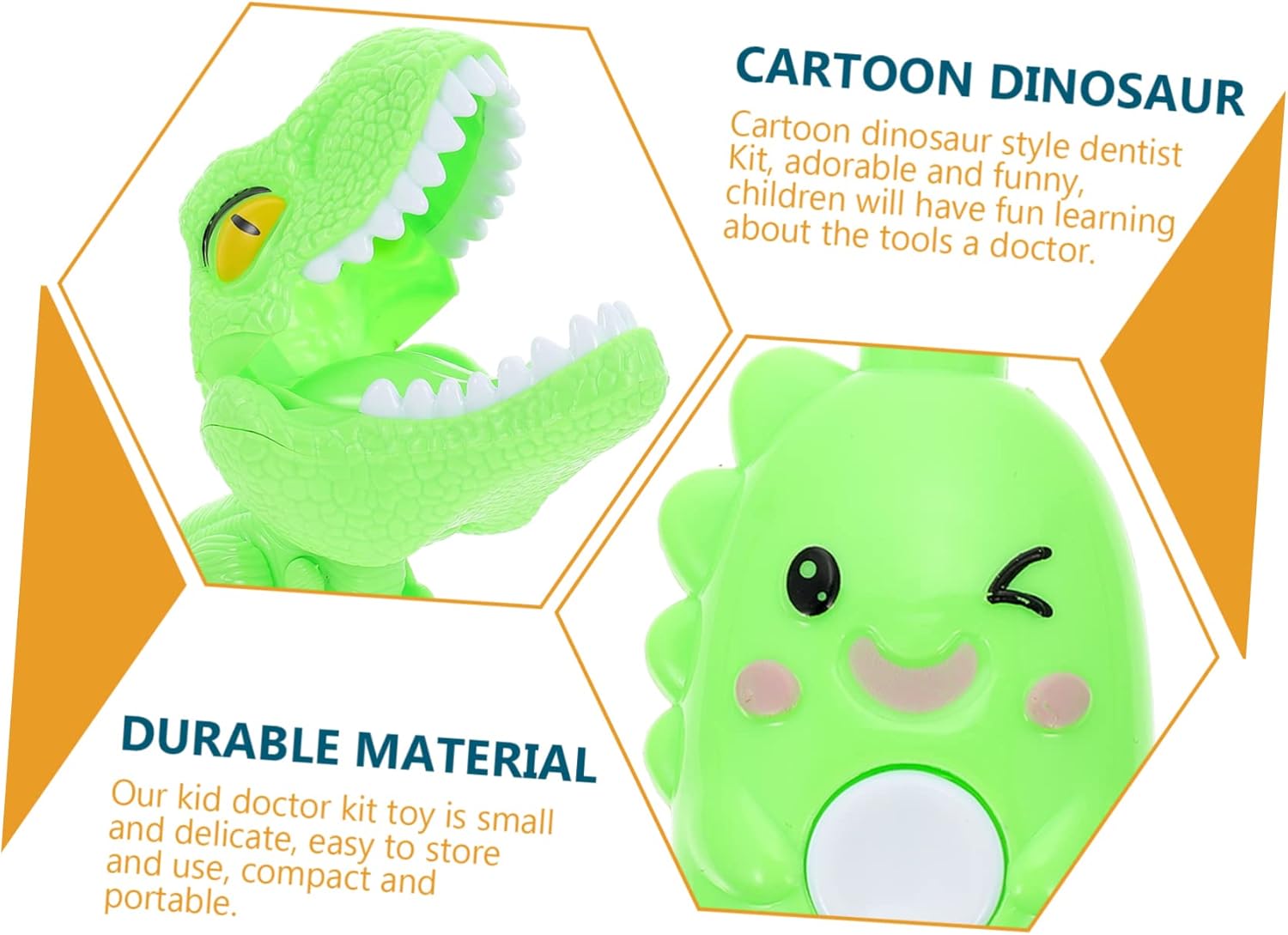 Kit giocattolo dentista: kit dentista in stile dinosauro cartone animato, adorabile e divertente, i bambini divertiranno a conoscere gli strumenti di un medico. Giocattoli per bambini piccoli: il premuroso set di giocattoli può essere un fantastico di natale o di compleanno per qualsiasi aspirante giovane medico! Costume da gioco di ruolo: appositamente progettato per i bambini, leggero e facile da usare, sicuro e delicato, una scelta eccellente. Strumenti in miniatura: ha bordi arrotondati e lisci senza angoli affilati o appuntiti ed è sicuro per i bambini quando giocano. Vestiti per bambini: aiuta i bambini a conoscere l'ospedale e a calmare le paure legate al medico mentre impegnano in giochi di ruolo.