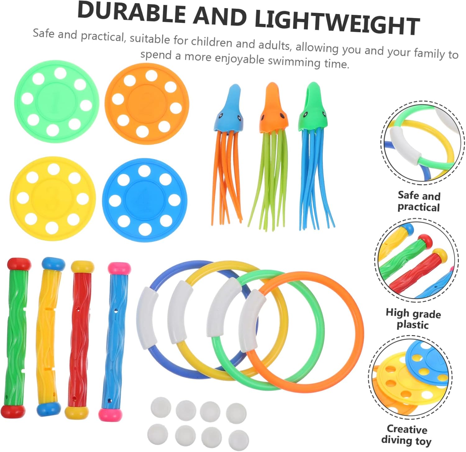 Giocattoli da piscina: leggeri e portatili, facili da trasportare in spiaggia, in piscina, ecc., giochi acquatici Giocattolo per immersioni in piscina: i bordi sono lisci e rotondi, senza sbavature e non danneggiano la pelle, anelli per immersioni in piscina I colori vivaci possono aiutare a stimolare la visione di tuo figlio, incoraggiarli a toccare ed esplorare, i giocattoli da immersione per la piscina Giocattoli da immersione in piscina: mentre divertono, i bambini possono anche divertirsi in piscina e le loro abilità natatorie, giochi d'acqua all'esterno Giocattoli: questo giocattolo per l'immersione è un eccellente strumento di allenamento per l'allenamento di nuoto subacqueo e i giocattoli per l'immersione in piscina