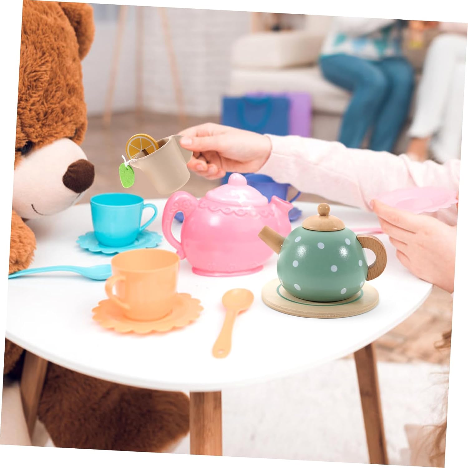 Stoviglie in legno per bambini: migliora efficacemente la capacità di vedere, sentire e coordinare e occhi. lascia che i bambini provino il divertimento di preparare il tè. Decorazioni in miniatura: possono rendere più divertente il tuo fai da te, queste stoviglie rendono la tua casa delle bambole. di piccole dimensioni e di forma, questo piccolo set da tè può essere utilizzato per la decorazione del modello di casa. Piccole stoviglie: il set da tè in legno per casa in miniatura contiene diversi tipi di stoviglie, che possono soddisfare le diverse esigenze di decorazione. Giocattolo per ragazze: fatto di legno, sicuro da usare. un'ottima aggiunta alla cucina giocattolo, ottima per giocare con gli amici. Set da gioco per l'ora del tè: realizzato in materiale sicuro, il materiale non farà male ai tuoi bambini, superficie liscia, facile da impugnare.