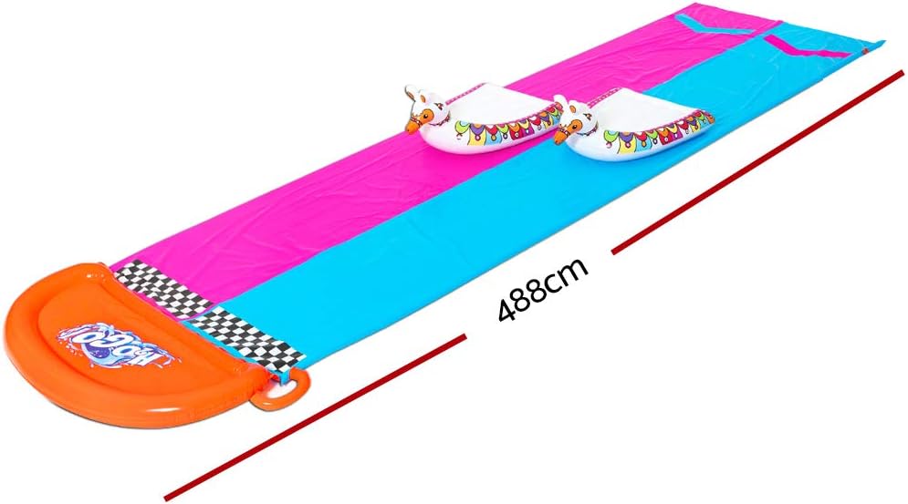 Dimensioni: 4.88 m di lunghezza Due cavalcabili gonfiabili a forma di lama Basta collegare un tubo da giardino Gli spruzzatori integrati che producono un effetto cascata e mantengono le corsie bagnate Contenuto: 1 scivolo, 2 lama gonfiabili, 1 toppa di riparazione