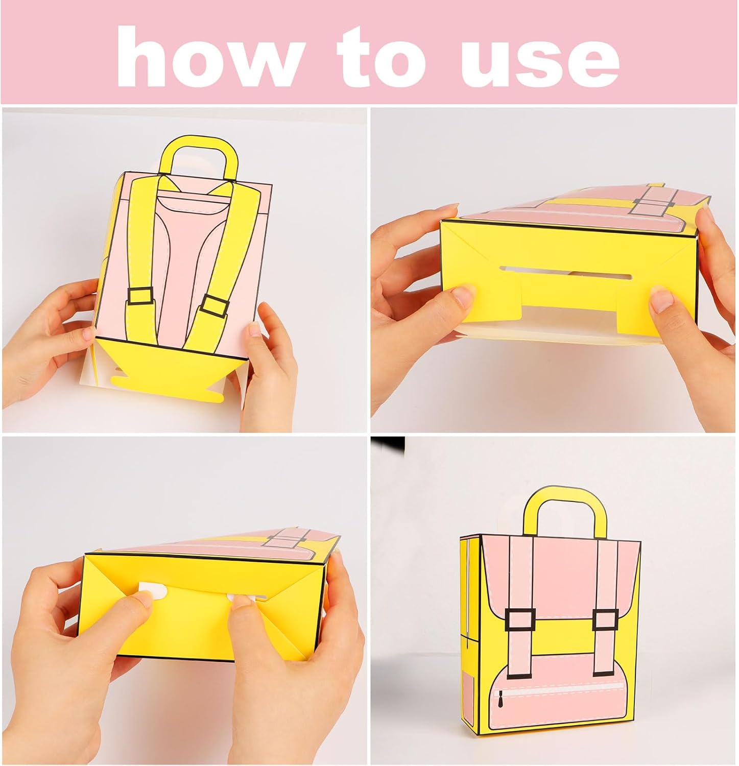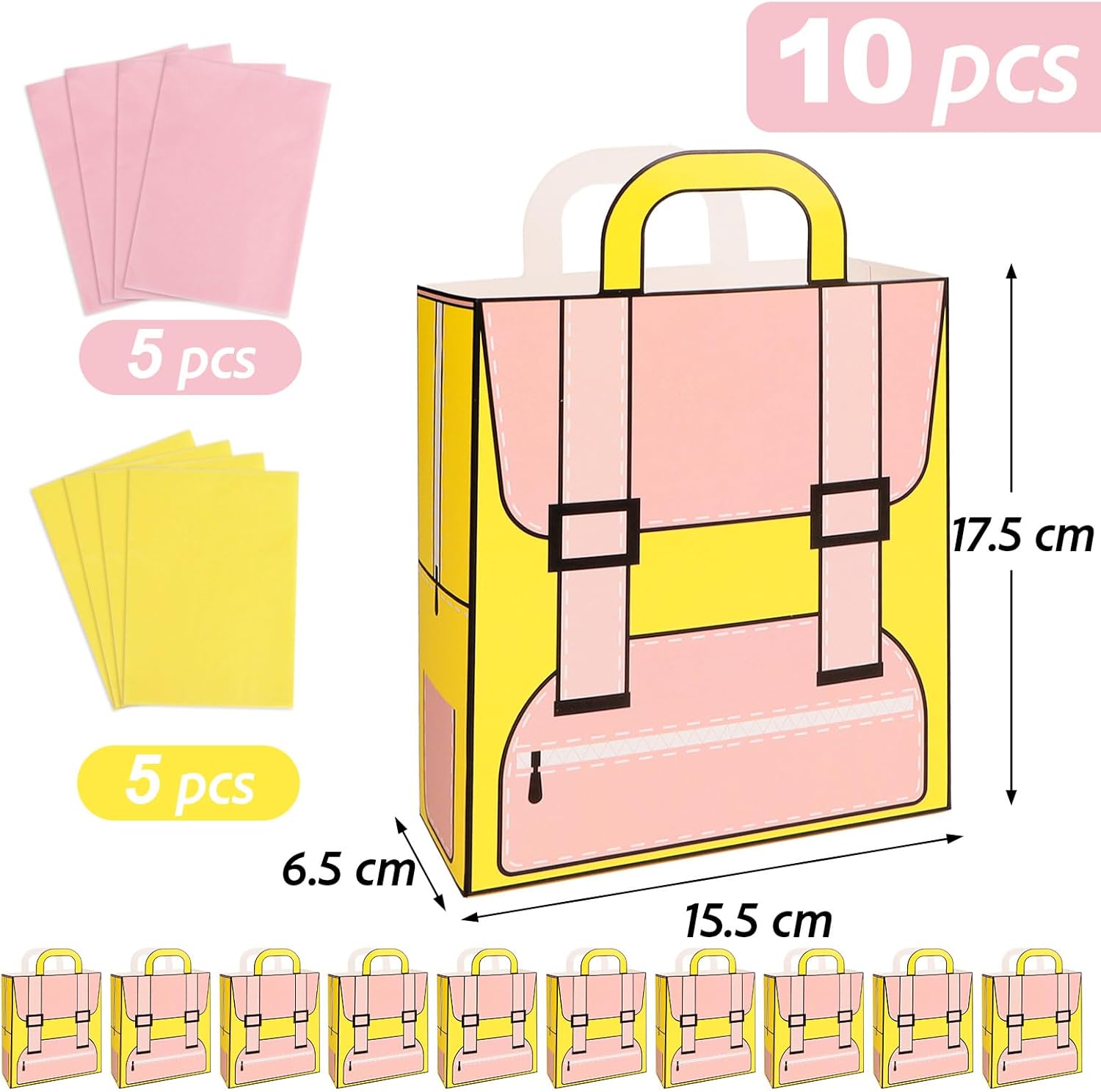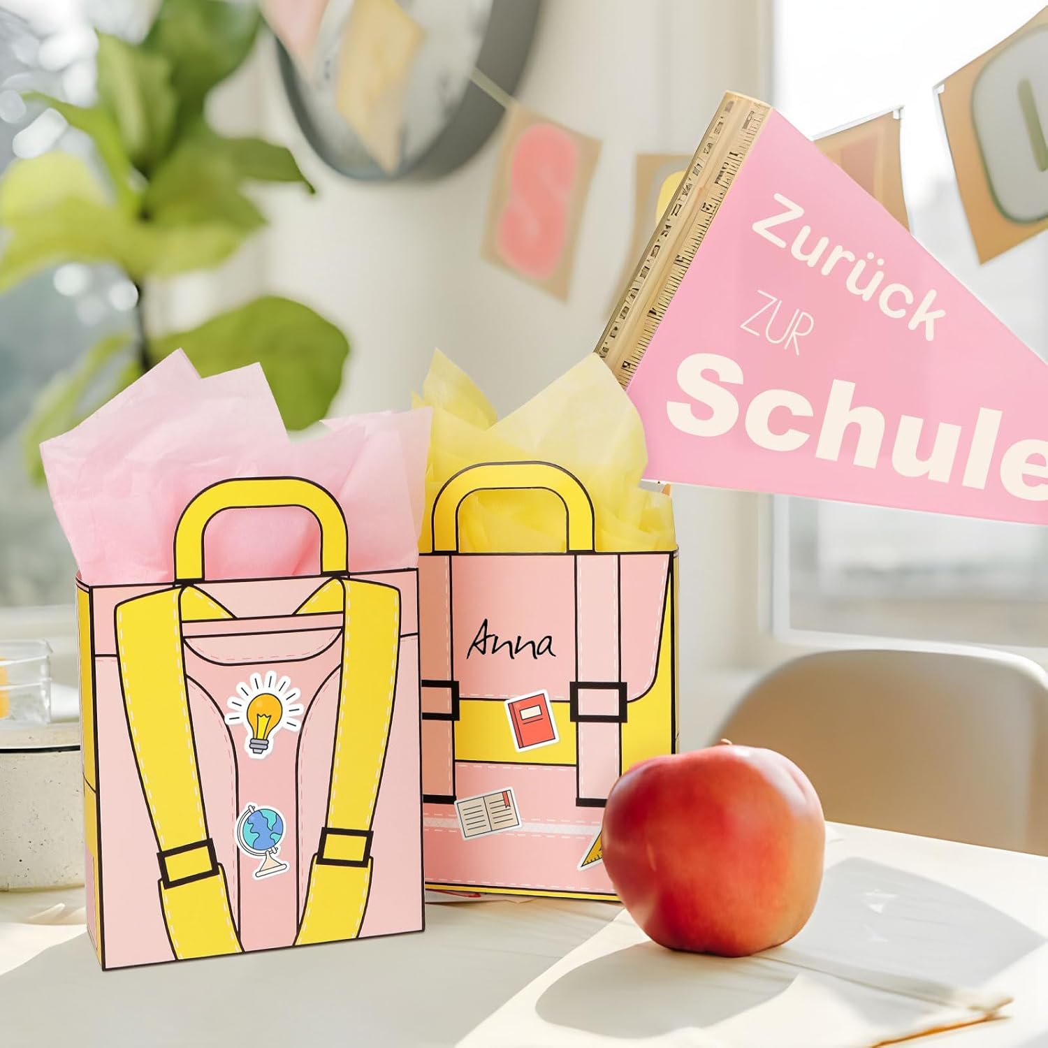 【Design unico dello zaino per la scuola】 - Questi sacchetti di carta dal design amorevole con l'aspetto di uno zaino per la scuola attirano l'attenzione per l'inizio della scuola - perfetti per i piccoli principianti! 【Set completo con carta velina】 - Include 10 sacchetti regalo (15,5 x 6,5 x 17,5 cm) e 10 carte veline abbinate (5x rosa, 5x gialle) - tutto il necessario per un'elegante confezione regalo. 【Versatile】 - Sia come regalino per le feste, per piccoli regali, caramelle o come confezione creativa di denaro - ideale per l'iscrizione a scuola, l'inizio della scuola e gli addii scolastici. 【Personalizzabile e scrivibile】- La parte anteriore e quella posteriore offrono spazio per nomi, adesivi o messaggi, così puoi progettare ogni borsa individualmente per il tuo bambino in età scolare. 【Decorazione suggestiva per la celebrazione】 - Le borse colorate creano immediatamente un'atmosfera di ritorno a scuola sul tavolo dei regali, in classe o alla festa di inizio scuola.