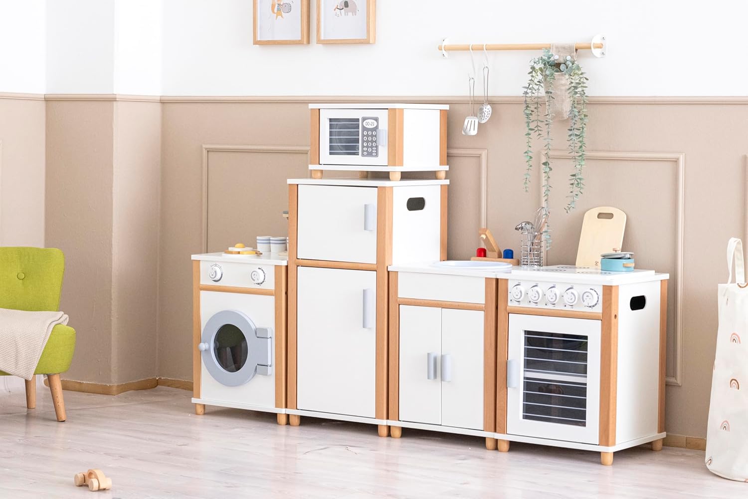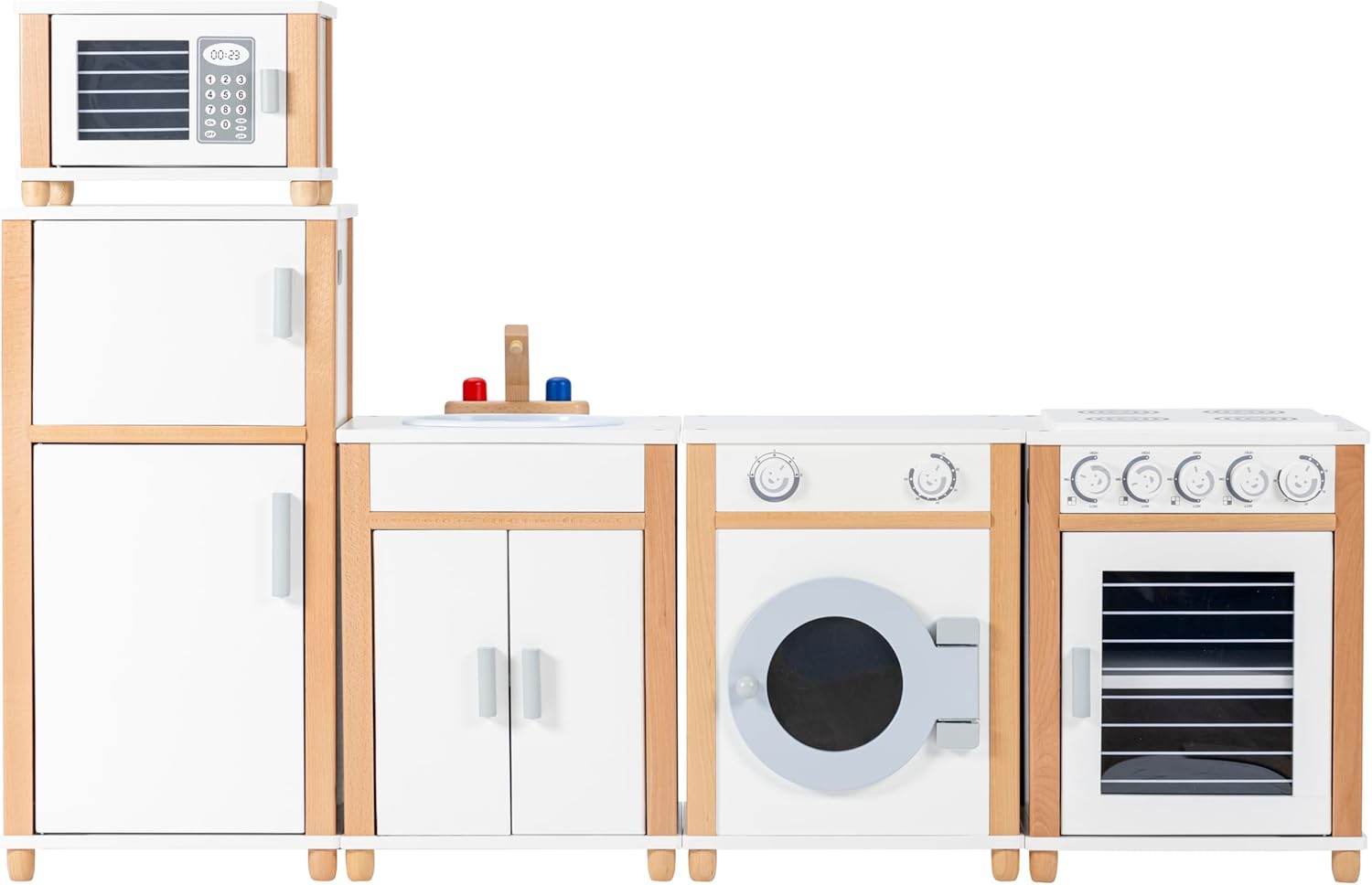 CUCINARE COME I GRANDI: I moduli della cucina per bambini sono progettati come una vera cucina e gli elementi di gioco offrono ai bambini molte opportunità per cimentarsi come cuochi professionisti. CUCINA DA GIOCO IN LEGNO PER BAMBINI: La cucina da gioco dal design moderno offre una grande varietà con 5 elementi di gioco, piano cottura/forno, lavello, lavatrice, frigorifero, congelatore e forno a microonde. AMPLIABILE: la cucina giocattolo in legno può essere ampliata a piacimento. Pentole e padelle e altri elementi come un tostapane o una lavatrice possono ampliare la cucina giocattolo. AUTENTICO PIACERE DI CUCINARE: La cucina in legno per bambini è perfetta per i piccoli appassionati di cucina e offre ai bambini molto spazio di lavoro su cui lavorare. Ha anche abbastanza spazio di archiviazione. GIOCATTOLI REALIZZATI CON MATERIALI NATURALI: La cucina da gioco è realizzata in legno della gomma verniciato e MDF (faggio) di alta qualità. Con un'altezza del piano di lavoro di 53 cm, è la dimensione ottimale per i bambini.