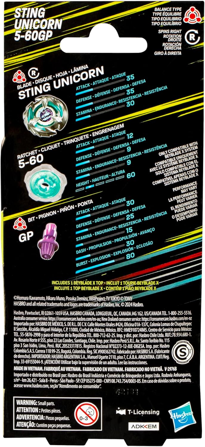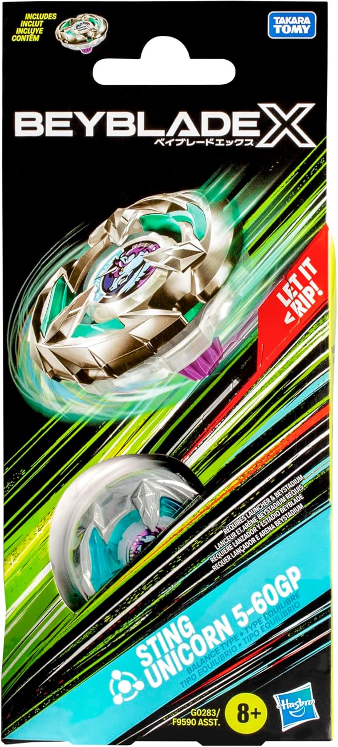 È TEMPO DI VELOCITÀ. Il Beyblade X Sting Unicorn 5-60GP è un giocattolo con bilanciamento a destra. Ispirato ai disegni di Takara Tomy, porta l'universo delle battaglie sul palmo della tua mano. POTENZA COMBINATA AD OGNI MOVIMENTO. Con metallo pressofuso e parti che bilanciano attacco e difesa, il top Sting Unicorn garantisce lanci sorprendenti e molto impatto. Ideale per gli 8 anni in su che amano le competizioni ricche di energia. BATTAGLIE RAPIDE E PERSONALIZZATE. Con lama, ingranaggi e punte intercambiabili, la parte superiore Beyblade X consente di assemblare diverse combinazioni. E con il sistema X-Celerator, attiva Xtreme Advance per lanci ad alta velocità. IL SET COMPLETO PER GRANDI SFIDE. Questo Booster Pack viene fornito con 1 parte superiore di bilanciamento a destra con 3 pezzi facili da montare. Compatibile con lanciatori e arene Beystadium Beyblade X (venduti separatamente) LA BATTAGLIA È SOLO L'INIZIO. Beyblade trasforma il divertimento in competizione e ogni giro in pura adrenalina. I top e gli stadi Beyblade si uniscono per spingere i limiti dell'immaginazione e mettere Blader testa a testa in duelli elettrizzanti.