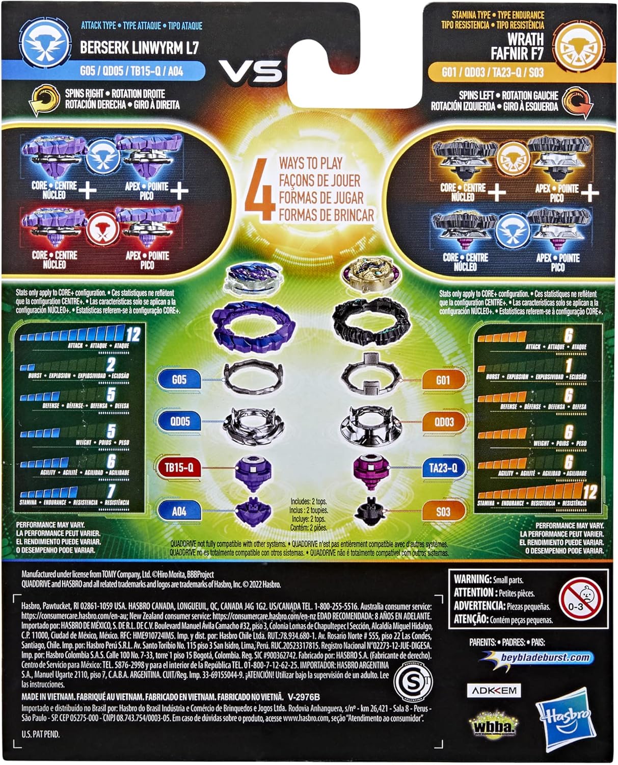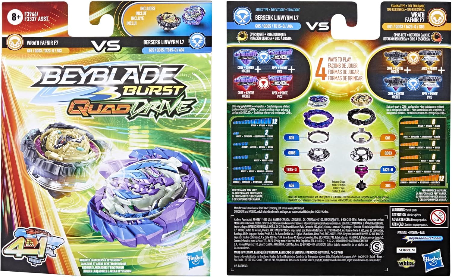 Sfrutta la potenza del Quaddrive: Beyblade Burst QuadDrive ti porta nel futuro di Beyblade con il primo top 4 in 1! Le cime possono essere configurate in 4 modi, quindi puoi personalizzare le cime come mai prima d'ora 2 top personalizzabili: include Beyblade Burst QuadDrive Links-Spin Wrath Fafnir F7 G01 QD03 TA23-Q S03 e Spin Destra Berserk Linwyrm L7 G05 QD05 TB15-Q A04 Tops. Regola la modalità core e apice, quindi la modalità Core+ e Apex+ per cambiare il tipo superiore Guida alla vittoria: costruire la migliore configurazione per la battaglia nel QuadDrive Beystadium (Beystadium e Launcher venduti separatamente, in base alla disponibilità) Arriva in battaglie digitali: scansiona il codice sui top QuadDrive per portare la battaglia al livello successivo. Unisciti all'app Beyblade Burst per liberare il tuo top in una battaglia virtuale con altri bladers in tutto il mondo! Lascialo strappare: inizia in battaglie testa a testa con Beyblade Burst Beystadium, lanciatori e trottole mentre viaggi verso Beymastery. (Ciascuno venduto separatamente, secondo disponibilità)