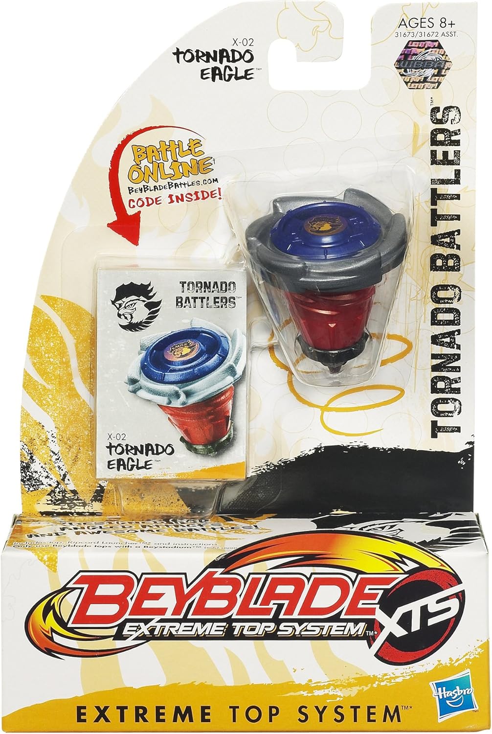 Parte della "Extreme Top System", il TORNADO EAGLE spinning top è angolata filatura azione impressionante mosse di attacco e una punta piatta che genera un giro aggressivo. Include Tornado Battlers trottole, lanciatore ripcord e istruzioni. Per l'utilizzo con un Beyblade Beystadium (venduto separatamente).