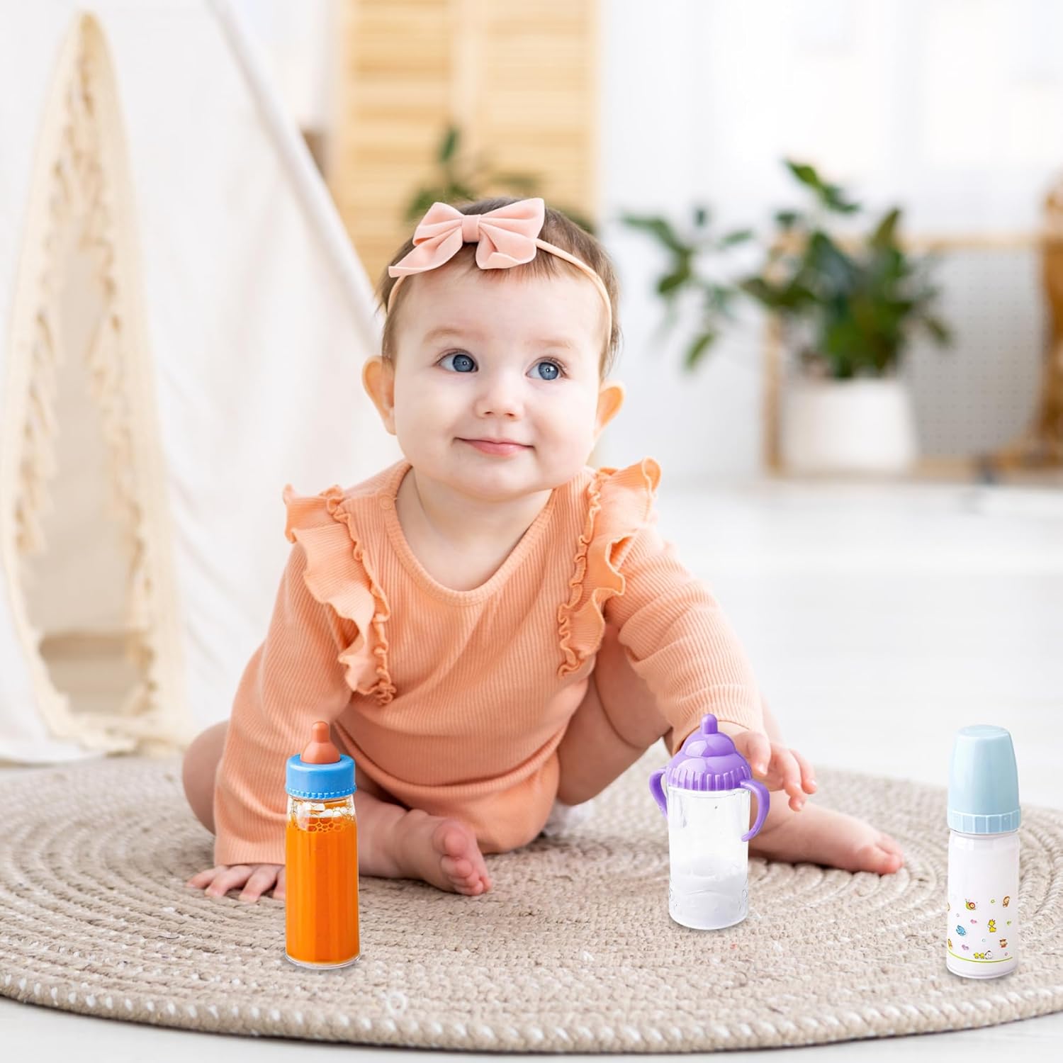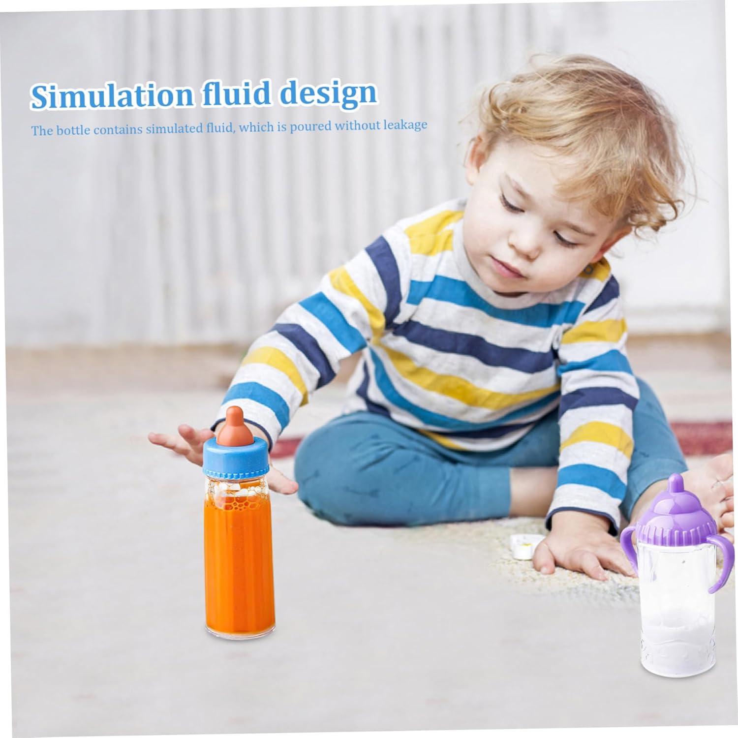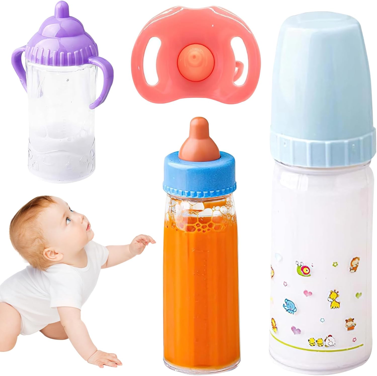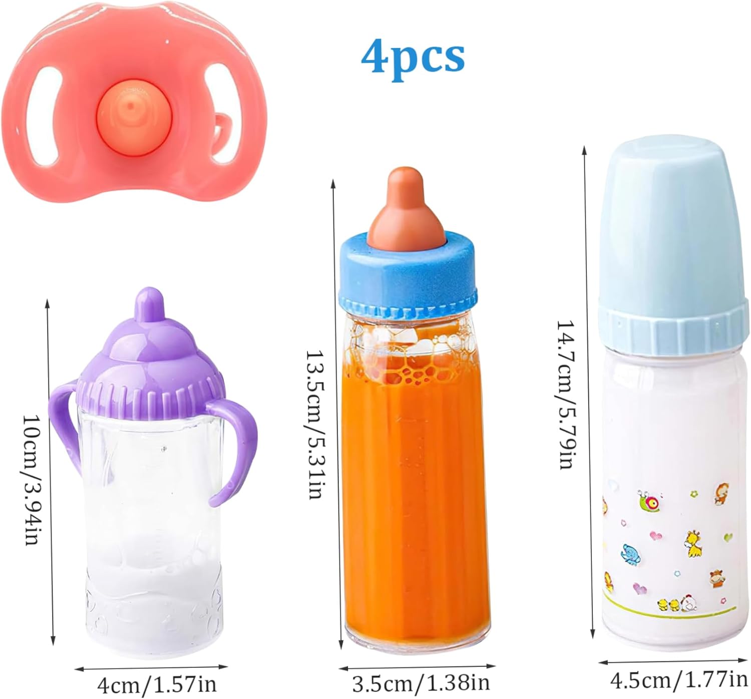 Sviluppo delle abilità: promuovendo l'interazione e lo sviluppo di abilità vitali, il biberon magico è uno strumento eccellente per coinvolgere il tuo bambino con gli altri..Migliora le capacità cognitive, supporta lo sviluppo del cervello e alimenta la crescita emotiva, offrendo a tuo figlio ore piacevoli riducendo il tempo trascorso davanti allo schermo. Ragazza perfetta: questo set per l'alimentazione delle bambole è l'ideale per le ragazze che amano giocare con le bambole e divertono con scenari di gioco fantasiosi..È adatto per compleanni, vacanze o qualsiasi occasione che celebri la gioia dell'infanzia. Divertimento e magia: il liquido contenuto in ogni biberon per bambole "scompare" magicamente quando il biberon viene tenuto inclinato, per far sembrare che la bambola stia bevendo il latte o il succo. Combinazione premurosa: il kit di accessori giocattolo viene fornito con 4 accessori per bambole, tra cui 3 bottiglie di latte per bambole di diverse dimensioni e colori, ciucci giocattolo da 1 pezzo, contenuti sufficienti per i vari usi..Il set di bambole da nutrire utilizza un design grafico carino e colorato per intrattenere le giovani menti e stimolare la loro immaginazione. Materiale sicuro: il biberon magico è realizzato in materiale PP sicuro, che garantisce una sensazione delicata e piacevole, insieme alla massima sicurezza e affidabilità..È atossico, privo di odori e resistente allo sbiadimento..Particolarmente robuste e resistenti alla rottura, queste bottiglie garantiscono un uso duraturo.