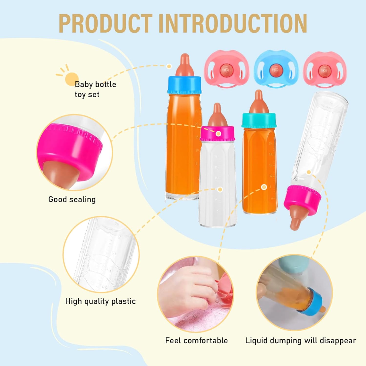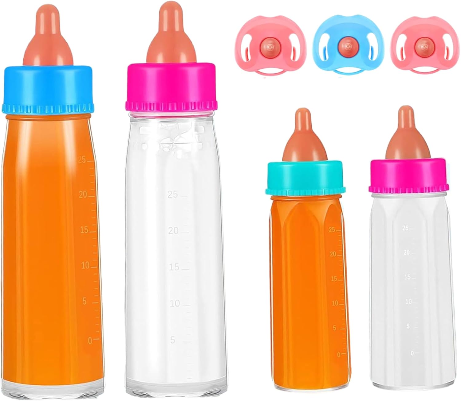 Materiali sicuri e affidabili: realizzati in plastica robusta e sicura, questi biberon e ciucci per bambole sono costruiti per durare..Il materiale di alta qualità garantisce che siano durevoli e non facilmente fragili, consentendo un divertimento a lungo termine. Set completo di accessori per giocattoli: questo set comprende 7 accessori per bambole, tra cui 2 biberon grandi, 2 biberon piccoli e 3 ciucci..Questo kit completo è perfetto per soddisfare varie esigenze di gioco. Opzioni di gioco versatili: ideale per bambini dai 4 anni in su, questo set di biberon per bambole è ottimo per una varietà di attività, tra cui giochi per tutta la famiglia, alimentazione delle bambole, giochi di ruolo e altro ancora..È una meravigliosa aggiunta a qualsiasi collezione di giochi con bambole. Bottiglie di latte e succhi magiche che scompaiono: le bottiglie di questo set presentano un divertente effetto liquido che scompare che aggiunge un tocco magico al tempo di gioco..Quando la bottiglia inclina, il liquido sembra svanire, stimolando l'immaginazione e la creatività. Scelta ponderata: questo set da gioco per l'alimentazione è un regalo delizioso per ogni bambino che ama giocare con le bambole..Perfetto per compleanni, Natale e altre occasioni speciali, porterà sicuramente gioia ed eccitazione.