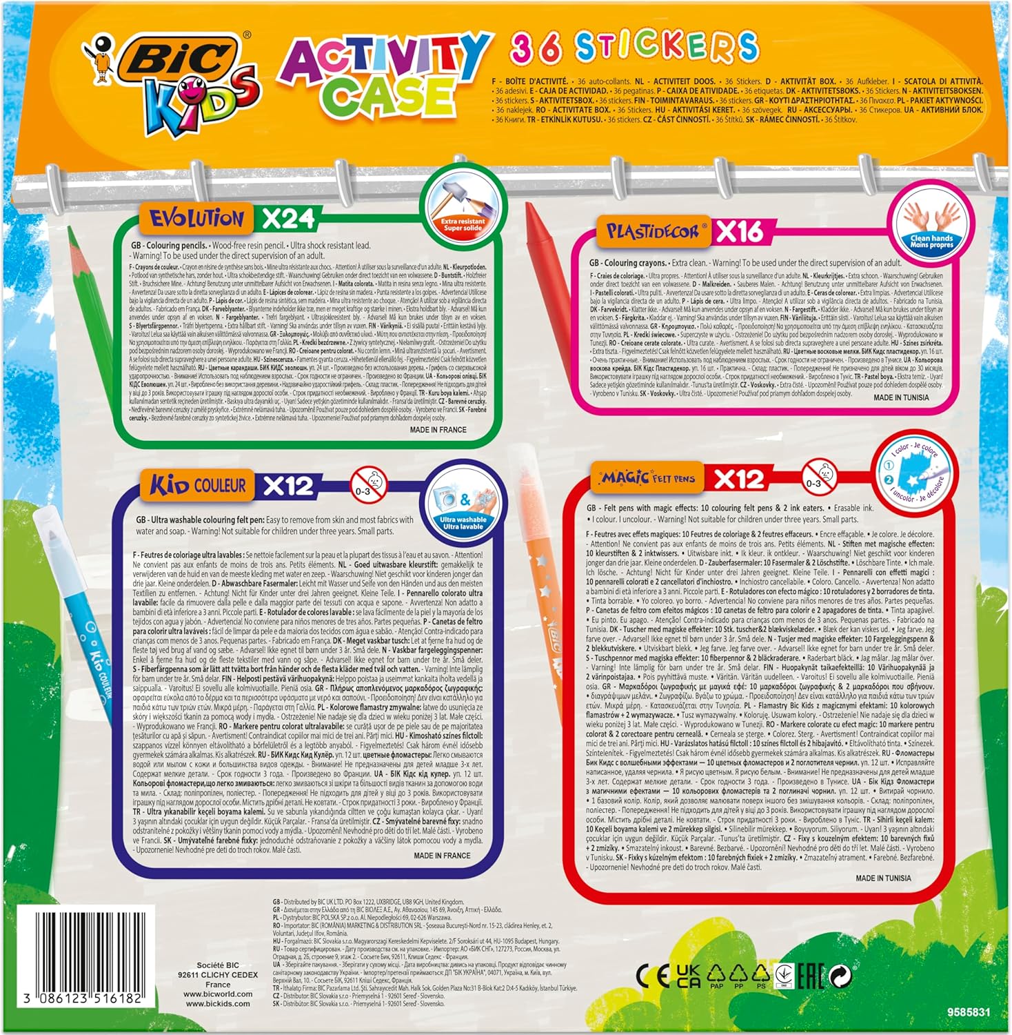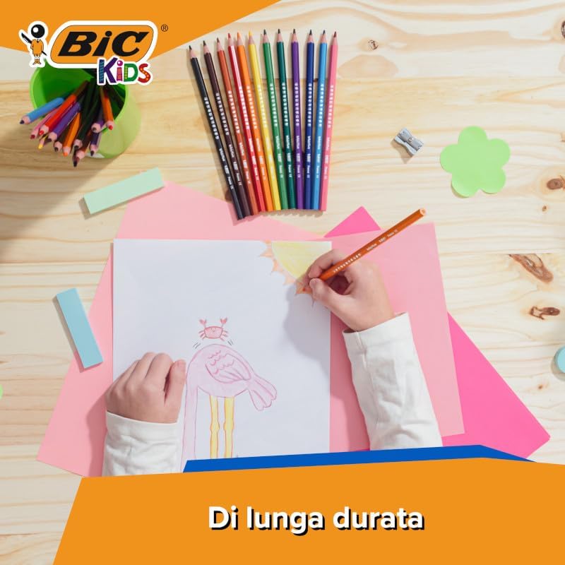 Scaccia la noia con il kit per colorare BIC Kids con 24 matite per colorare, 24 pennarelli, 16 pastelli a cera e 36 adesivi da colorare Il kit contiene 12 pennarelli per colorare ultra lavabili BIC Kids Kid Couleur dai colori accesi con punta robusta a prova di pressione Contiene 24 matite per colorare BIC Kids Evolution: pratiche, con mina resistente e corpo in resina priva di legno anti-schegge Con le 12 penne per colorare cancellabili BIC Kids Magic e le 2 gomme, i bimbi possono correggere i disegni o creare opere d’arte I 16 pastelli a cera per colorare BIC Kids Plastidecor sono extra puliti e resistenti, ideali anche per i più piccoli