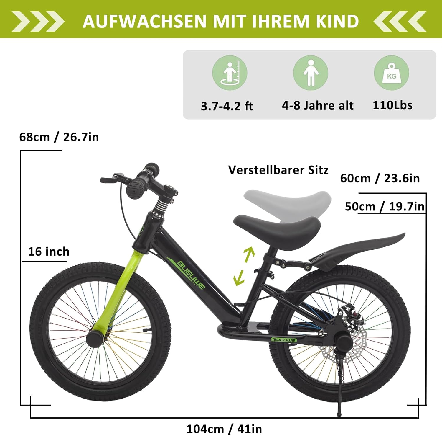 Design colorato: la bici da 16 pollici dispone di raggi vivaci e colorati che la sottolineano visivamente e rendono particolarmente attraente per i bambini. Questo aspetto accattivante lo rende il preferito dei giovani piloti e favorisce il piacere di guidare. Prestazioni frenanti affidabili: il sistema a disco garantisce prestazioni di frenata affidabili ed efficaci. Fornisce una potenza frenante rapida e reattiva, che è fondamentale per la sicurezza dei giovani conducenti. Con questo sistema frenante, i genitori possono essere rassicurati che il loro bambino può fermarsi durante la guida. Facile da riporre: la ruota è dotata di supporto, che rende il parcheggio un gioco da ragazzi. I bambini possono facilmente spegnere la bici da soli, il che è molto comodo per brevi soste durante la guida o quando hanno bisogno di una pausa. Questo rende la bici ancora più comoda e utile. [Protezione efficace] La bicicletta è dotata di parafanghi. Quando si guida su strade bagnate o sporche, i parafanghi impediscono che polvere, fango e acqua schizzi sul conducente in modo che rimanga pulito. [Promozione delle attività all'aperto] La bici da 16 pollici per bambini è progettata per bambini dai 4 agli 8 anni ed è ideale per avventure all'aria aperta. Supporta lo sviluppo di equilibrio, fiducia in se stessi e capacità motorie, mentre i bambini esplorano la natura in modo giocoso.