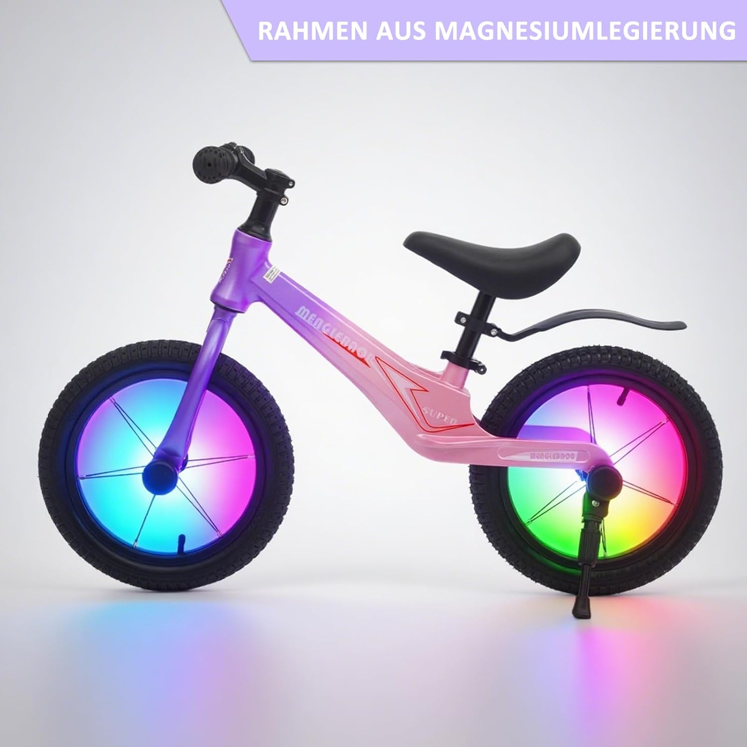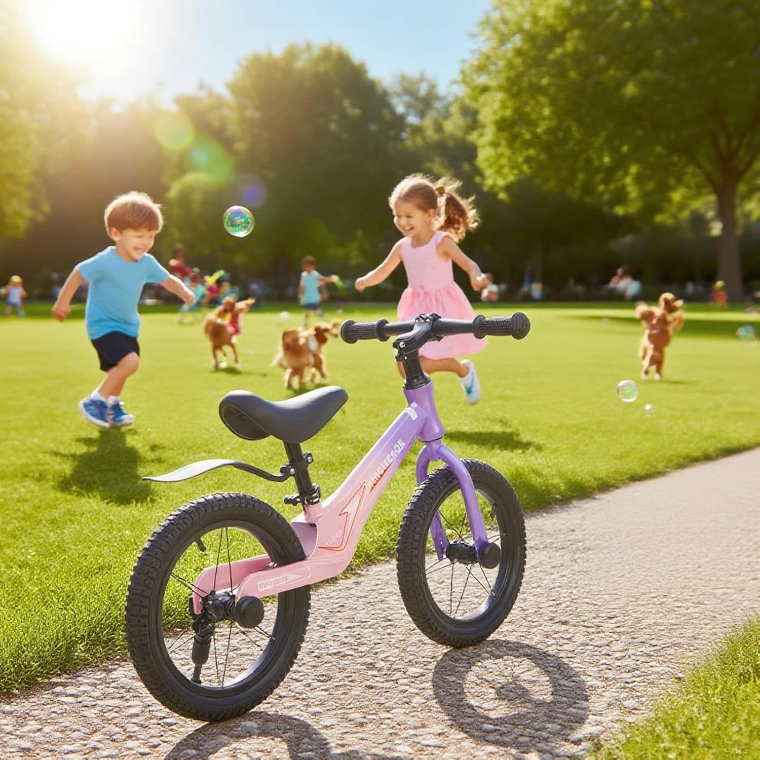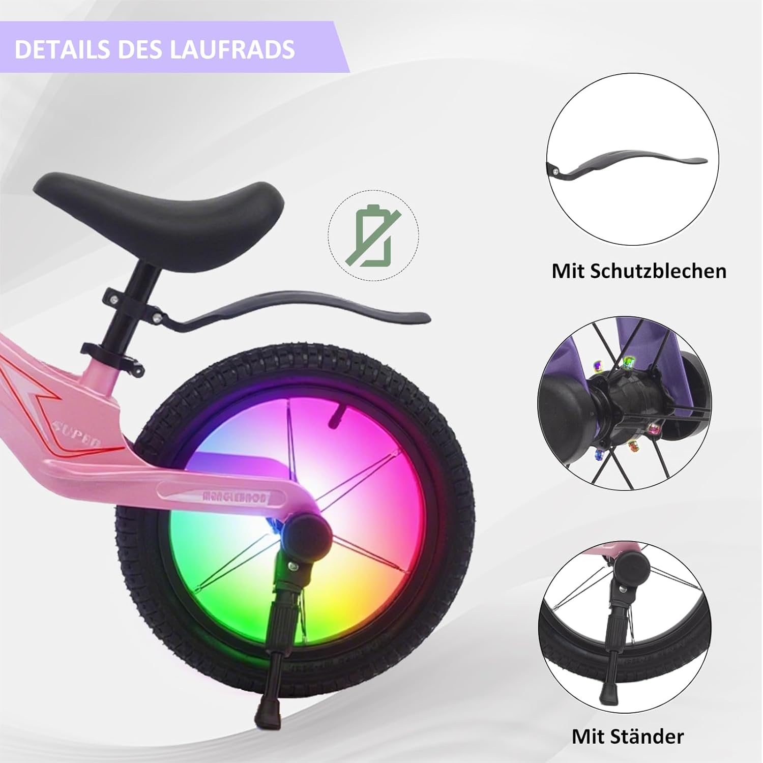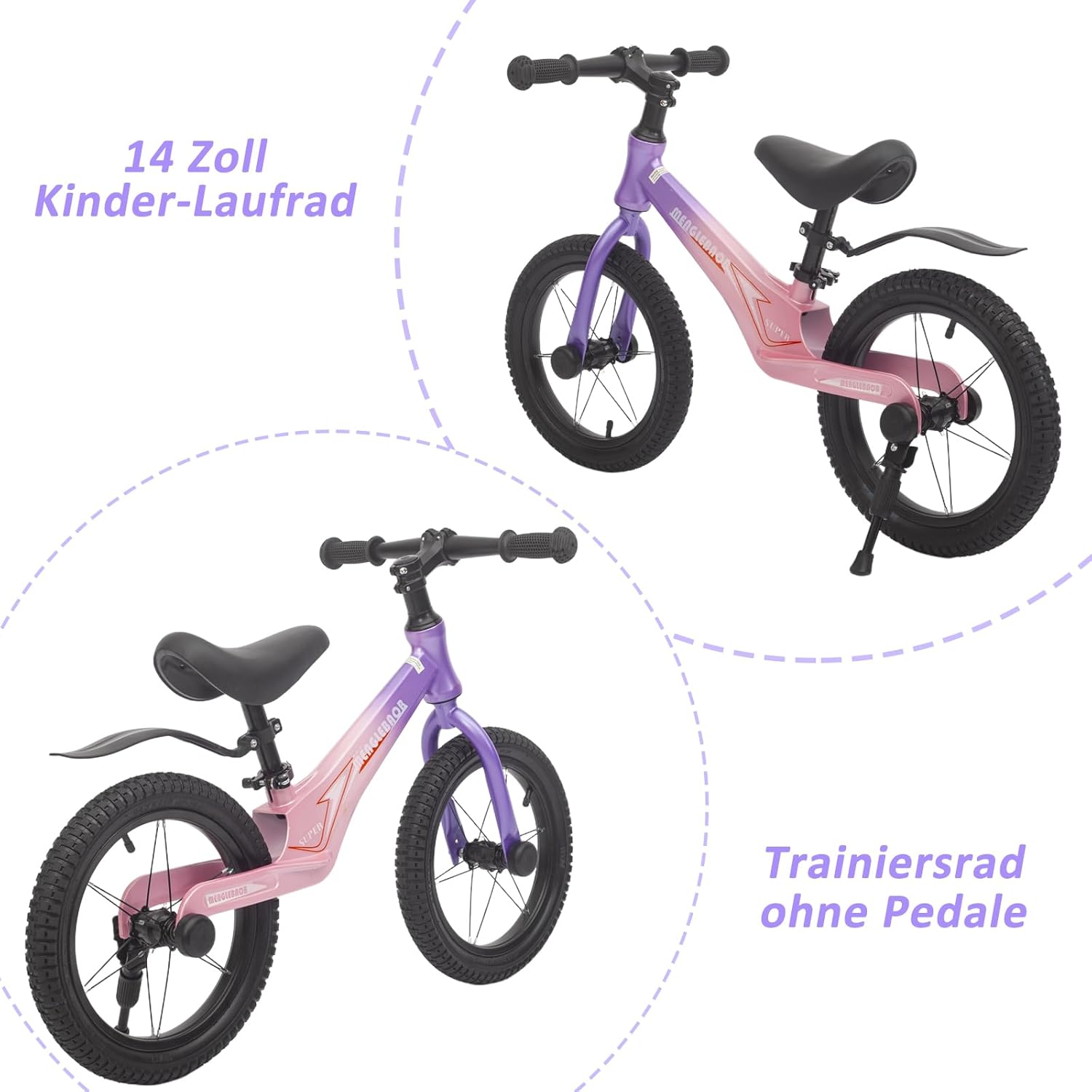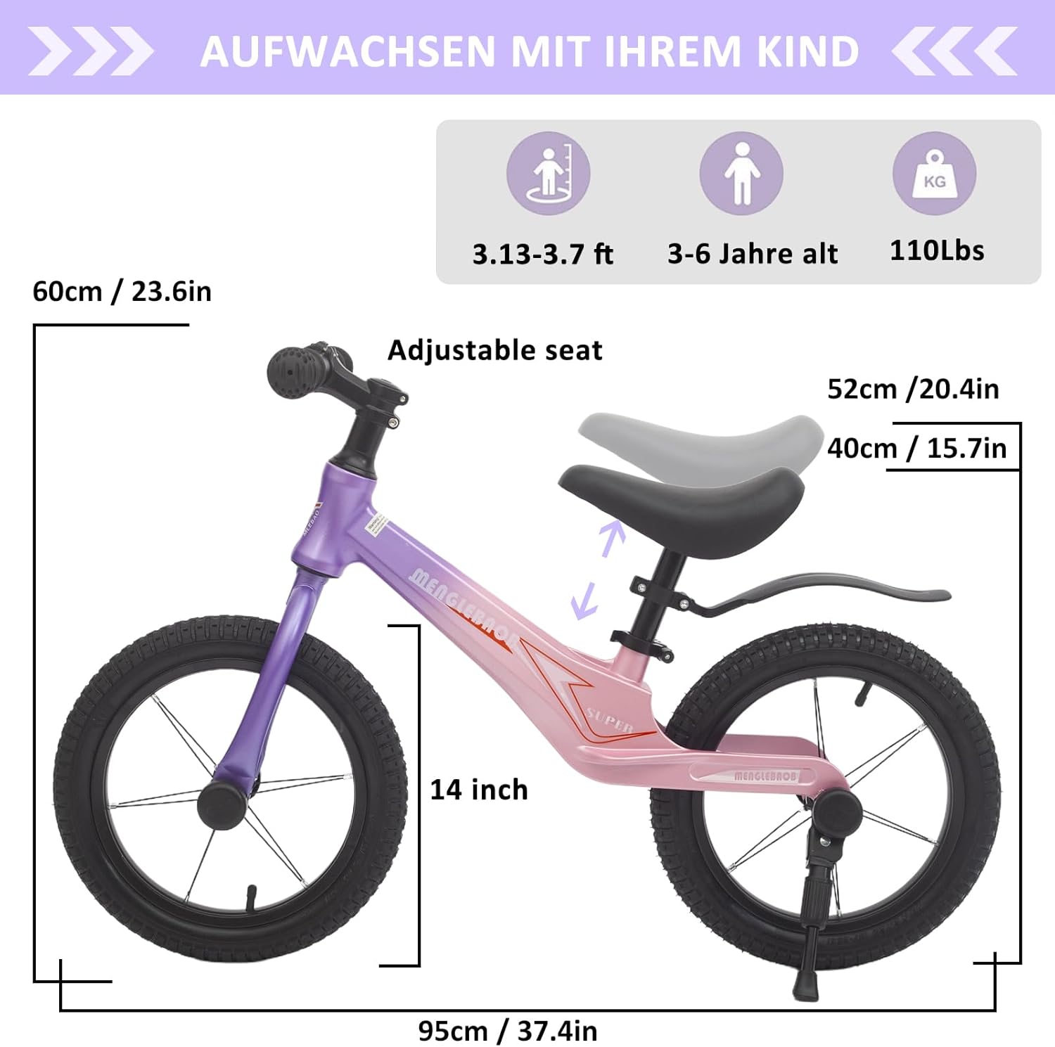 [Telaio leggero] Questa girante presenta un telaio in lega di magnesio con bordi lisci, non solo leggera ma anche resistente. Gli pneumatici gommati da 14 pollici garantiscono un'esperienza di guida stabile e delicata, in modo che i bambini possano muoversi comodamente e senza sforzo. [Comodo parcheggio]Dotato di un supporto, non è necessario fare affidamento su pareti, ringhiere o altri oggetti esterni. Può essere posizionato in modo sicuro ovunque, senza cercare punti di supporto per evitare che il telaio si ribalti o graffi. Design senza pedale: la ruota senza pedali aiuta i bambini a concentrarsi sull'apprendimento dell'equilibrio e delle capacità di guida. Questo è un ottimo modo per sviluppare la fiducia in se stessi e il coordinamento in modo che crescono mentre imparano a guidare. Sedile regolabile: il sedile regolabile è facile da regolare in base all'altezza del bambino, in modo da poter godere della bici anche con la crescente età. Motiva i bambini ad uscire e divertirsi in modo sano! [Facile da montare]Include tutti gli strumenti di montaggio necessari e una pompa ad aria, senza bisogno di ulteriori acquisti. Questa fantastica bici è la sorpresa perfetta per i piccoli avventurieri di età compresa tra 3 e 6 anni per compleanni o Natale.