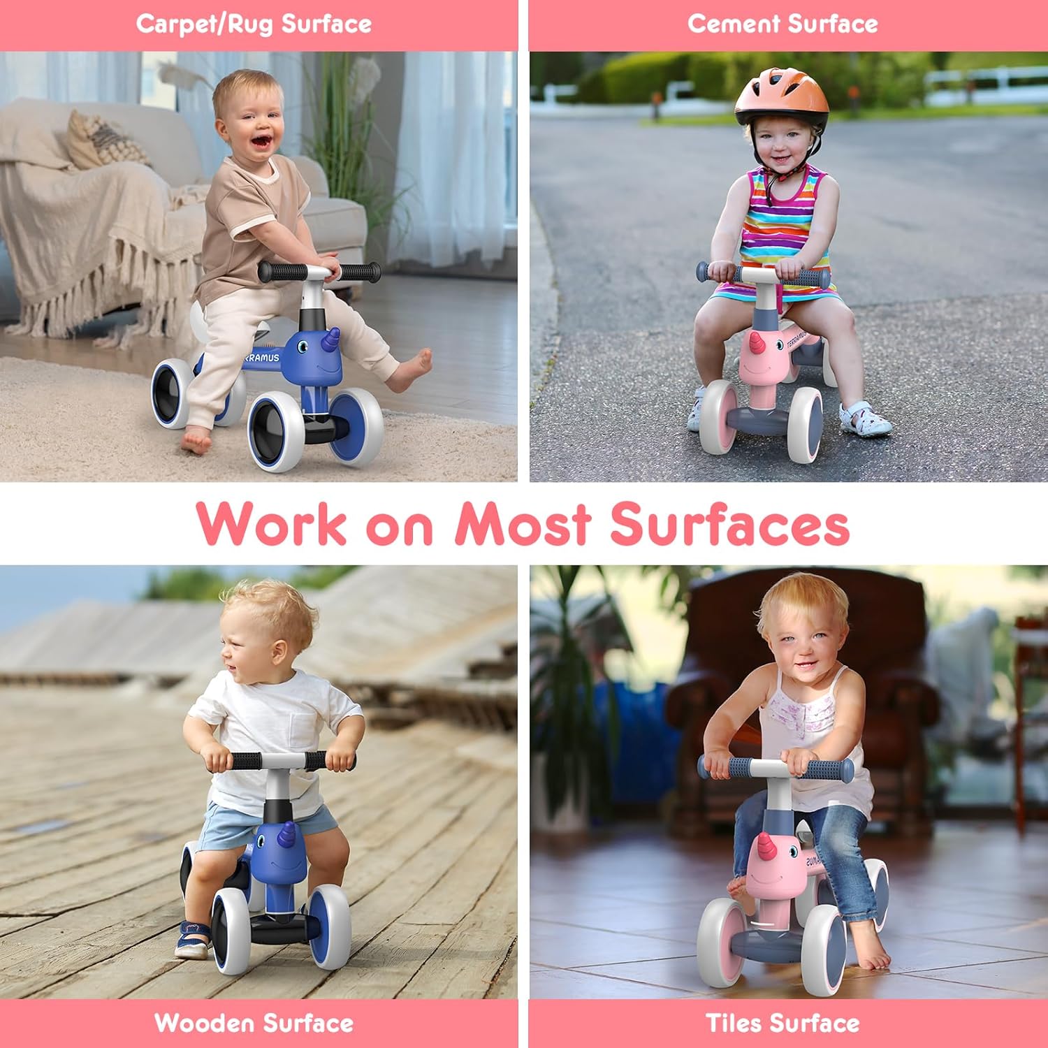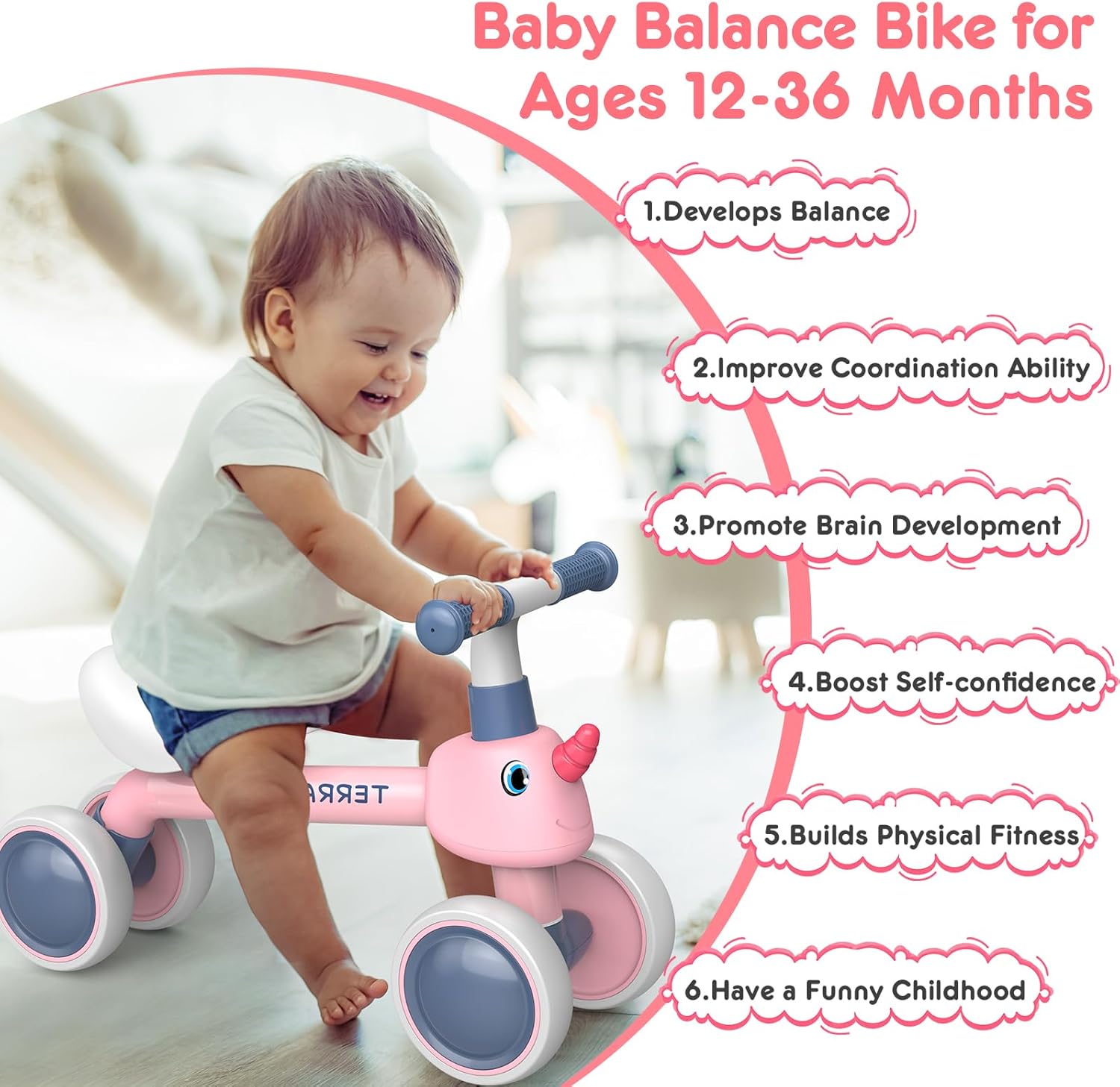 Guida sicura: certificazione di sicurezza ASTM F963 da United States Childern's Product Safety, guida facile per bambini piccoli. Bicicletta a 4 ruote con baricentro basso per una migliore stabilità. Nessun pedale e ruota chiusa completamente allargata per evitare di pizzicare i piedi del bambino. Sterzo di 135° limitato per evitare cadute laterali. Nessuna parte affilata, più sicura per il tuo bambino. 【BICICLETTA PER INIZIANTI】 Età consigliata per 12-36 mesi. La bici per bambini è il miglior regalo di compleanno per i bambini per imparare a correre e cavalcare. Aiuta a sviluppare l'equilibrio, la sterzata e il coordinamento dei bambini, acquisendo fiducia in se stessi fin dalla giovane età. Facile da montare: le biciclette per bambini sono facili da montare e il montaggio richiede solo pochi minuti. Non hai bisogno di strumenti complessi o sofisticati. Basta collegare le parti direttamente tra loro e il gioco è fatto. Facile da trasportare, anche per bambini con soli 1,8 kg. Nella confezione sono incluse le istruzioni di installazione e un manuale multilingue incluso lo spagnolo. Design stabile e confortevole: il corpo della bicicletta è realizzato in acciaio legato robusto di alta qualità, un manubrio in EVA morbido antiscivolo e un sedile imbottito per offrire al bambino una posizione comoda per tenere e sedersi. Le ruote silenziose funzionano sia all'interno che all'esterno. Offri al tuo bambino un ambiente di guida stabile e confortevole, per far divertire il tuo bambino a guidare ogni giorno. 【Il miglior partner per bambini】 Giocare non è mai stato migliore! La bici TERRAMUS è stata progettata per i bambini dai 12 ai 36 mesi per sviluppare le capacità motorie necessarie per camminare e infine guidare. Ottimo regalo per il primo compleanno per ragazzi e ragazze