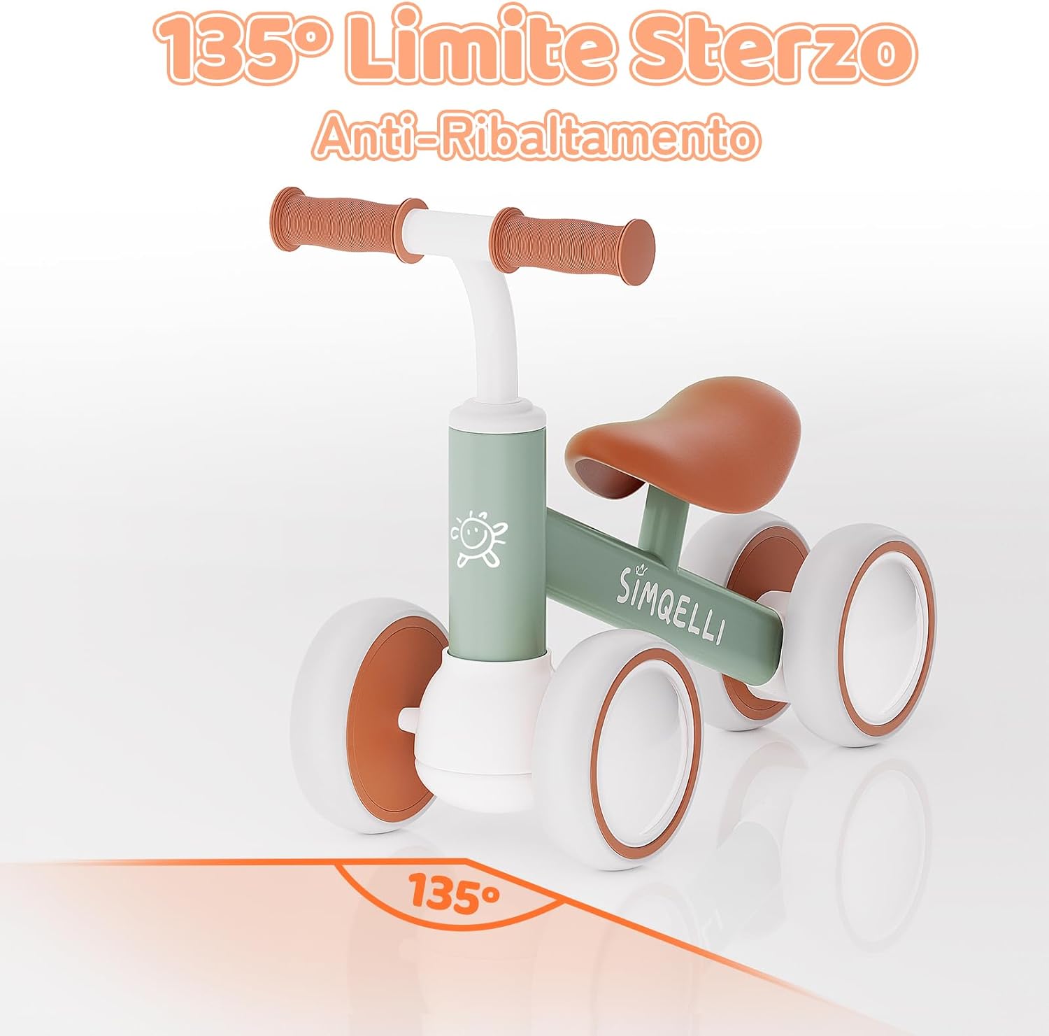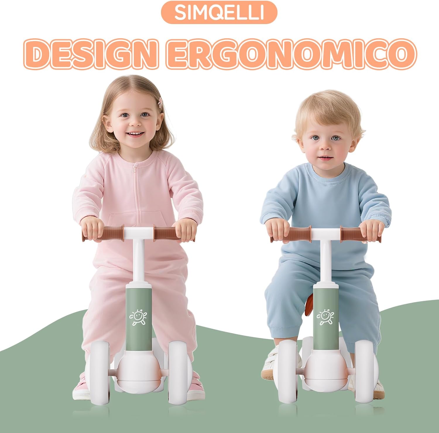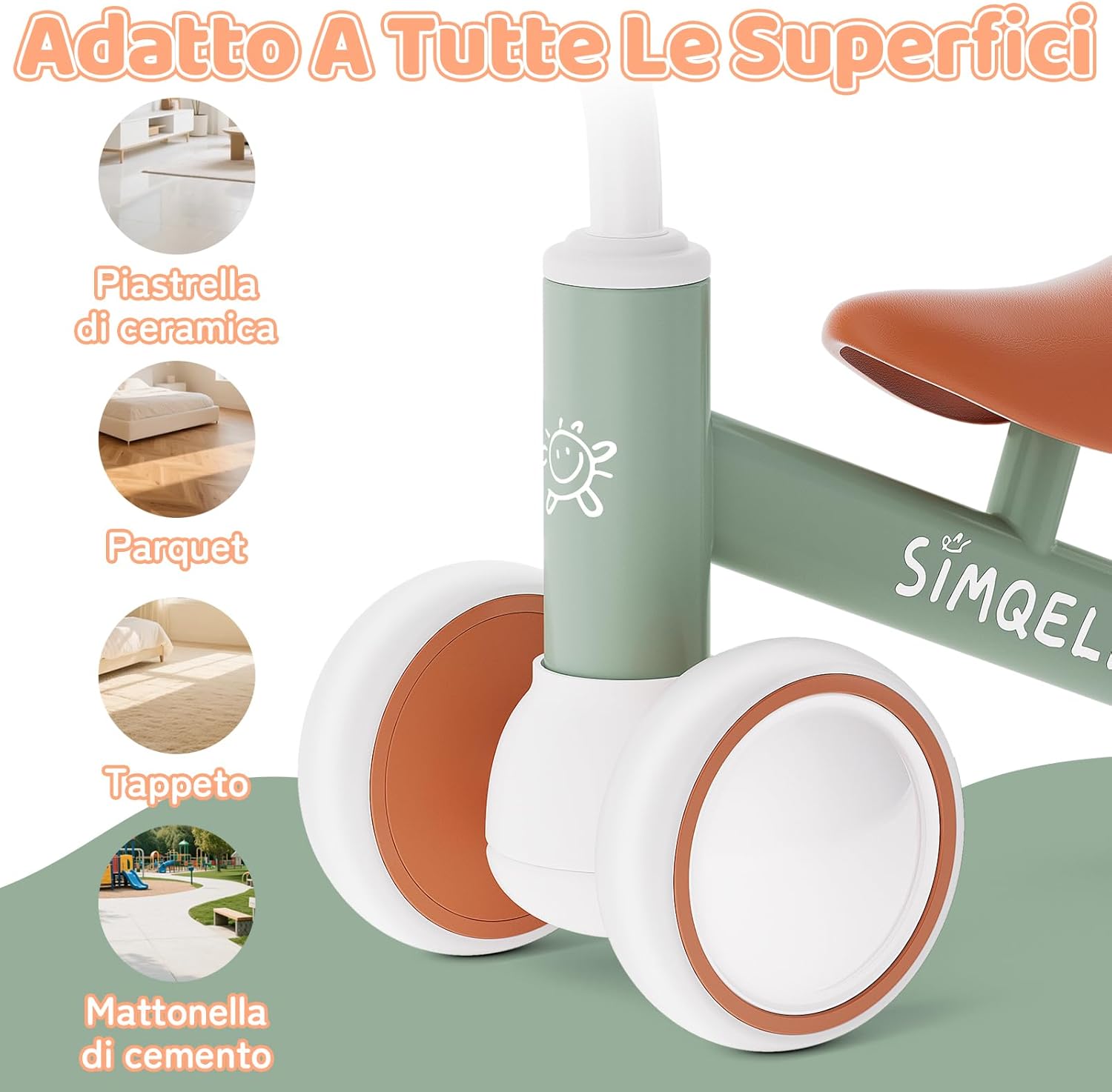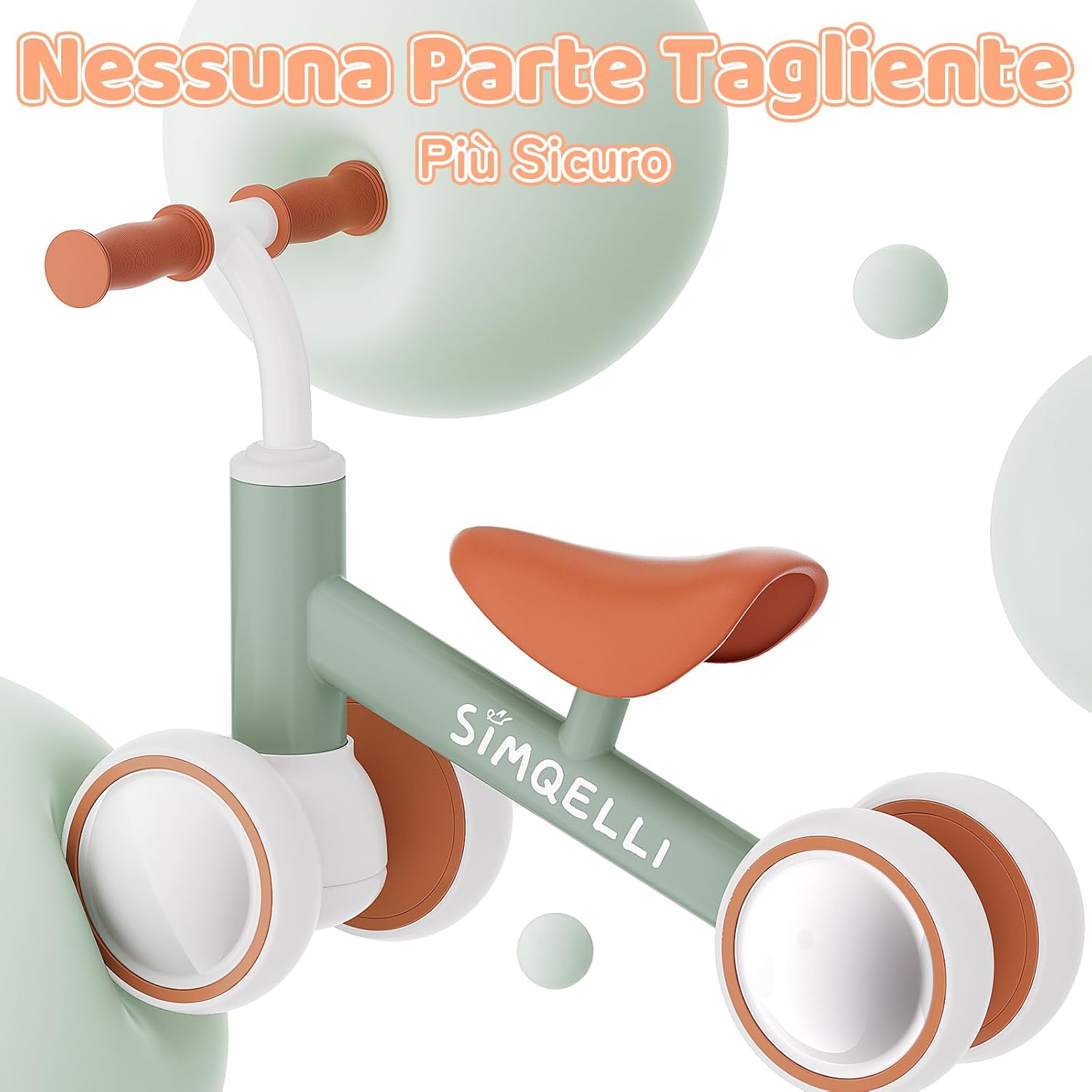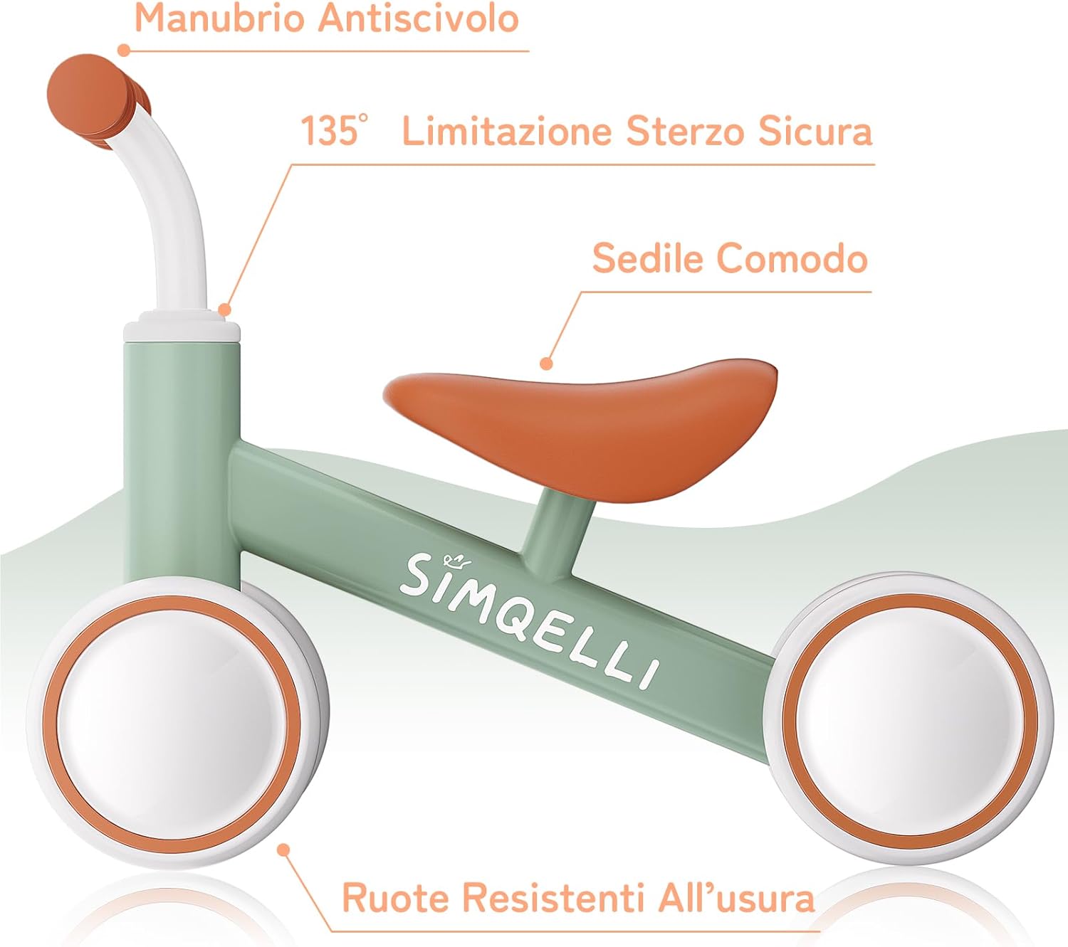 【𝐑𝐄𝐆𝐀𝐋𝐎 𝐏𝐄𝐑𝐅𝐄𝐓𝐓𝐎 𝐏𝐄𝐑 𝐈 𝐏𝐈𝐂𝐂𝐎𝐋𝐈 𝐍𝐄𝐎𝐍𝐀𝐓𝐈】La bici senza pedali per bambini è progettata appositamente per bambini di età compresa tra 12-24 Mesi ed è il giocattolo perfetto per ogni occasione, che si tratti di un compleanno o di una festa speciale. Porta gioia ai più piccoli e stimola la loro curiosità di imparare a pedalare 【𝐁𝐀𝐑𝐈𝐂𝐂𝐈𝐎 𝐁𝐀𝐒𝐒𝐎 𝐄 𝐏𝐎𝐒𝐈𝐙𝐈𝐎𝐍𝐄 𝐃𝐄𝐋𝐋𝐄 𝐑𝐔𝐎𝐓𝐄 𝐋𝐀𝐑𝐆𝐀】 Grazie alla seduta bassa (26 cm) e alle ruote larghe (22 cm anteriori, 10 cm posteriori), i bambini possono appoggiare i piedi a terra in sicurezza. L'angolo di sterzata di 135° garantisce un equilibrio ottimale e riduce al minimo il rischio di cadute. Ciò consente inoltre un movimento flessibile in spazi ristretti e dà ai bambini la sicurezza di guidare senza preoccupazioni. La capacità di carico massima è di 25KG 【𝐃𝐄𝐒𝐈𝐆𝐍 𝐒𝐈𝐂𝐔𝐑𝐎 𝐄 𝐀𝐃𝐀𝐓𝐓𝐎 𝐀𝐈 𝐁𝐀𝐌𝐁𝐈𝐍𝐈】 La sicurezza del tuo bambino è la nostra massima priorità. La bici non ha spigoli vivi o angoli appuntiti. La robusta struttura in acciaio, il manubrio antiscivolo e la seduta morbida garantiscono una guida comoda e sicura 【𝐅𝐀𝐂𝐈𝐋𝐄 𝐃𝐀 𝐀𝐒𝐒𝐄𝐌𝐁𝐋𝐀𝐑𝐄 𝐄 𝐏𝐎𝐑𝐓𝐀𝐓𝐈𝐋𝐄】 La bici senza pedali si monta in pochi semplici passaggi. Con un peso di soli 1.8 kg (4 libbre), è facile da trasportare ovunque per i bambini. Che sia all'interno o all'esterno, la bici senza pedali segue il tuo bambino, trasformando qualsiasi spazio in un parco giochi ideale 【𝐏𝐑𝐎𝐌𝐔𝐎𝐕𝐄 𝐋𝐀 𝐂𝐑𝐄𝐒𝐂𝐈𝐓𝐀 𝐄 𝐋𝐎 𝐒𝐕𝐈𝐋𝐔𝐏𝐏𝐎】 Andare in bici senza pedali aiuta i bambini ad allenare il loro senso dell'equilibrio, rafforzare i muscoli e costruire la fiducia in se stessi. Promuove inoltre la consapevolezza spaziale e supporta lo sviluppo fisico e mentale precoce. Permette di giocare e imparare allo stesso tempo, rendendo la crescita divertente!