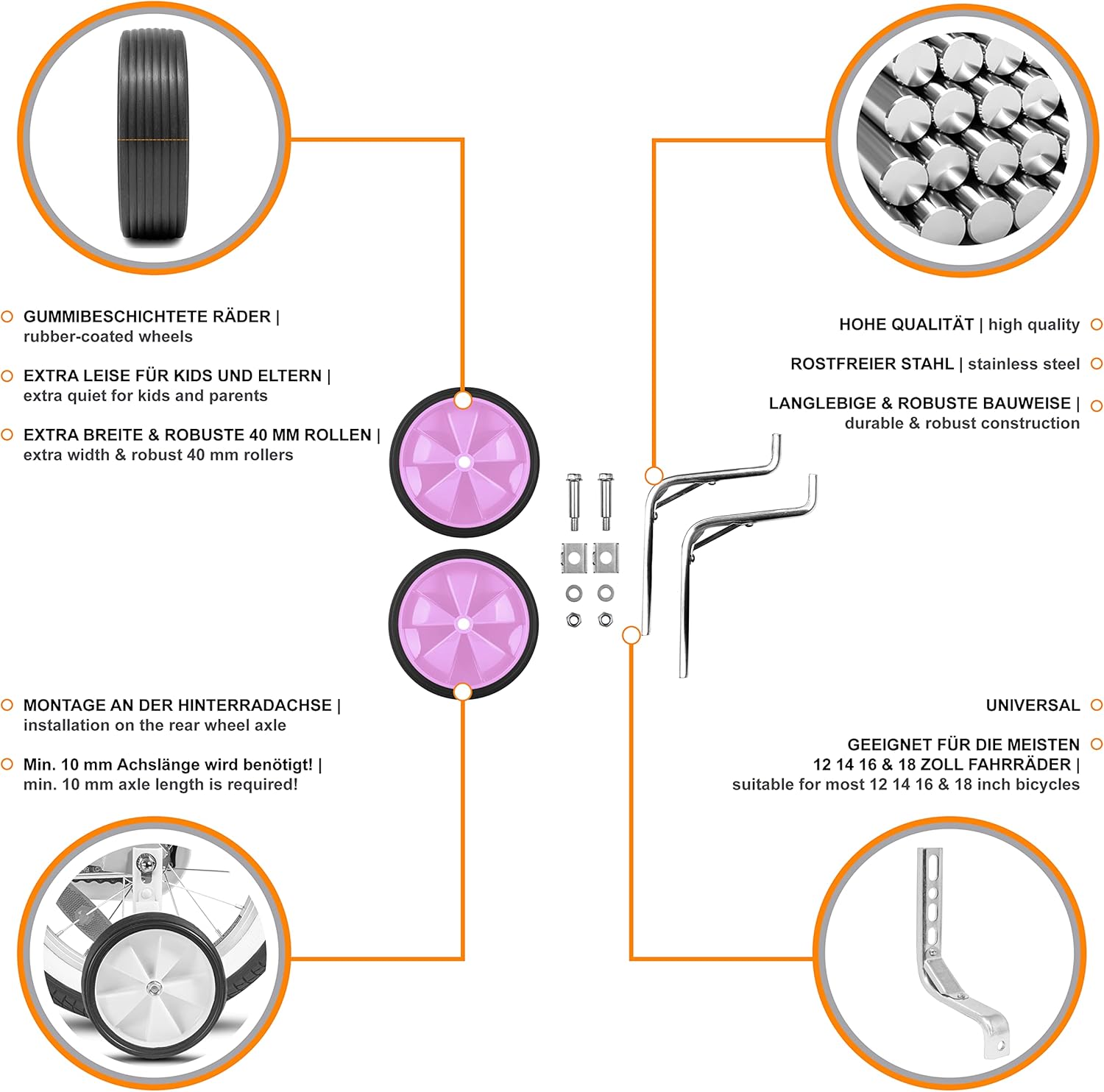 ATTENZIONE: Si prega di misurare la lunghezza dell'asse posteriore della bicicletta per bambini prima di ordinare (almeno 10 mm di spazio)! Queste ruote per bici per bambini NON sono adatte per le bici per bambini PUKY! EXTRA SILENZIOSO: ruota per bicicletta in gomma, che offre una resistenza minima e una guida silenziosa. STABILIZZATORE PER BICI PER BAMBINI DI ALTA QUALITÀ: struttura in acciaio durevole e molto robusta con un robusto bordo in plastica. Le nostre ruote per bici per bambini piccole sono adatte per biciclette per bambini da 12 a 18 pollici con almeno 10 mm di lunghezza su ciascun lato dell'asse posteriore! UNIVERSALE: ruote per bici per bambini piccole regolabili individualmente per dimensioni di ruote 12 pollici, 14 pollici, 16 pollici e 18 pollici, adatte per la maggior parte delle biciclette per ragazzi e ragazze, facili da montare. SICUREZZA: Queste ruote da bici per bambini aiutano i piccoli ciclisti finché non sviluppano il senso dell'equilibrio. Il tuo bambino è al sicuro e acquisisce fiducia.