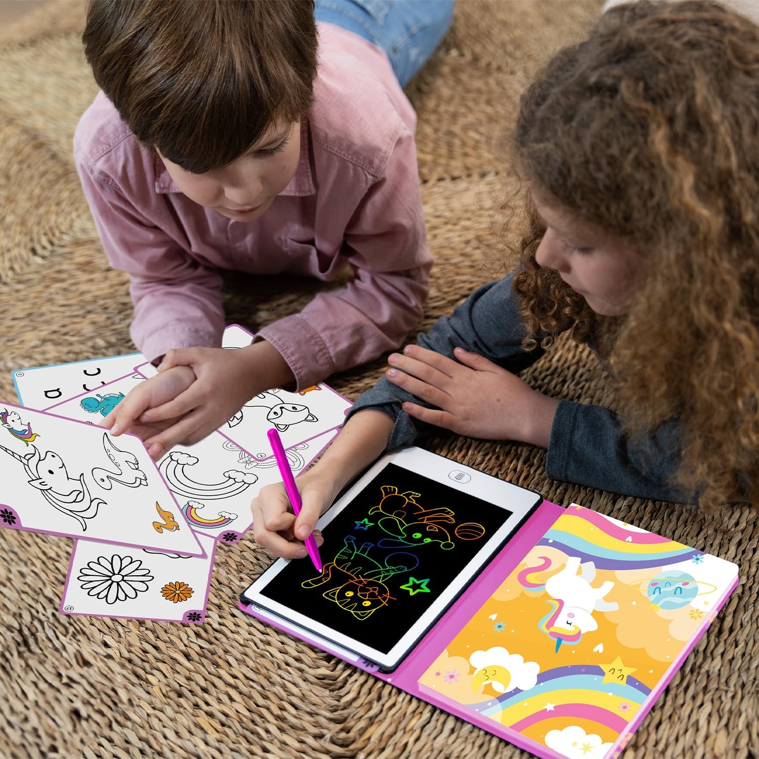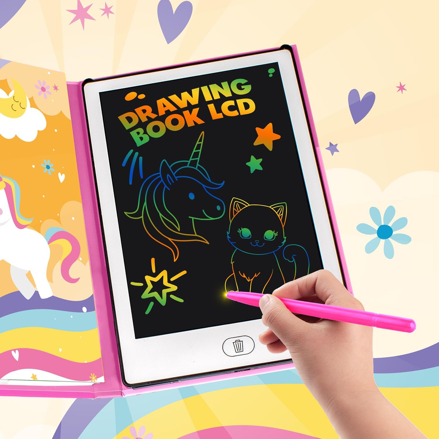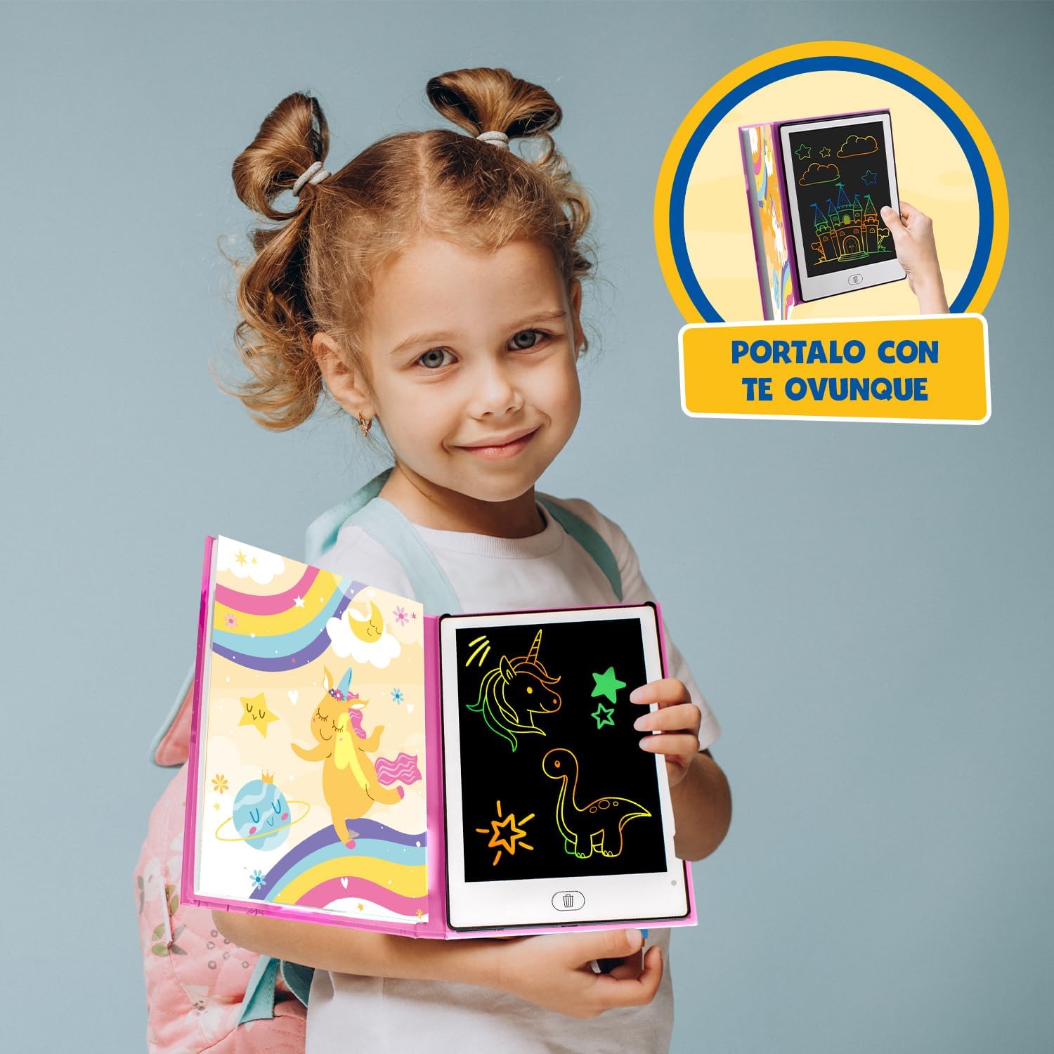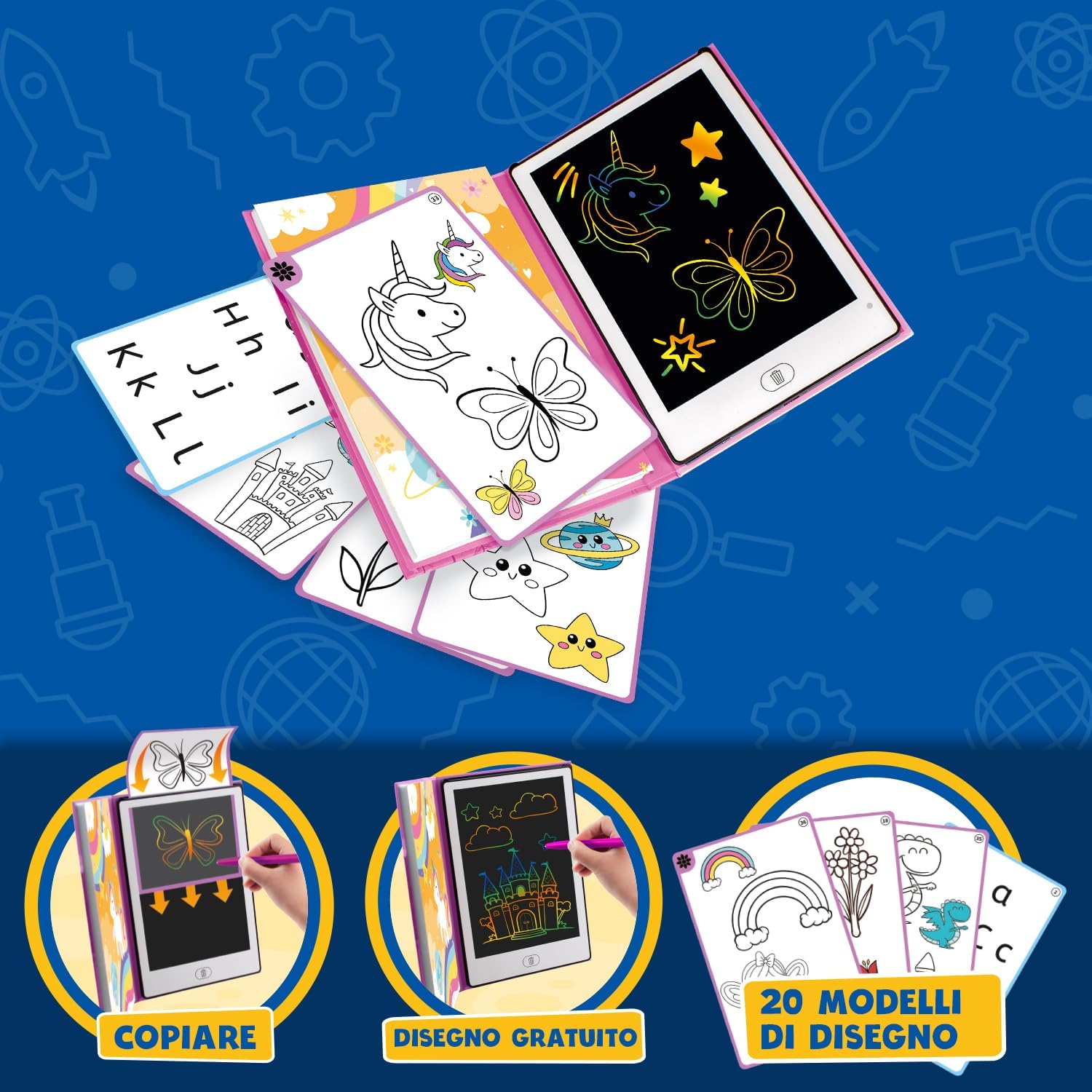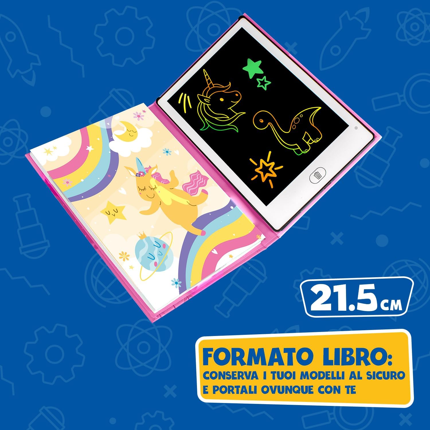 📟 LAVAGNA LCD PER BAMBINI 📟 La lavagnetta magnetica bambini offre un'esperienza di disegno senza problemi. Con questa tavoletta grafica lcd, i vostri bambini potranno sperimentare la magia del disegno e della scrittura. Un regalo bambina 7 anni che incoraggia la creatività e lo sviluppo. 💼 DESIGN PORTATILE E PRATICO 💼 La lavagnetta bambini da 21,5 cm in formato libro è perfetta da portare ovunque, per consentire ai vostri bambini di divertirsi con i giochi e la creatività in movimento. Ideale per viaggi e gite in famiglia. 🎨 POSSIBILITÀ DI DISEGNO LIBERO 🎨 La lavagna digitale offre la possibilità di disegnare liberamente, permettendo ai piccoli artisti di esplorare la loro creatività senza limiti. È una lavagna lcd e tavoletta lcd ideale per lo sviluppo artistico. 👨🏫 DIVERTIMENTO E DIDATTICA 👨🏫 La lavagna bambini è un ottimo modo per combinare divertimento e apprendimento. Questa lavagna cancellabile bambini e tablet disegno bambini è perfetta per promuovere lo sviluppo delle capacità motorie e artistiche. 🧽 FACILE DA CANCELLARE E RIUTILIZZARE 🧽 Con questa lavagnette cancellabili i bambini possono cancellare facilmente le loro creazioni e ricominciare da capo. La tablet per disegnare bambini incoraggia la pratica continua ed è un ottimo strumento per imparare a disegnare. 📑 20 MODELLINI REVERSIBILI 📑 la lavagna interattiva include 20 modellini reversibili per disegnare, così i bambini possono imparare a disegnare e sviluppare la loro immaginazione, creando farfalle, unicorni e castelli, tra le altre cose. Questa lavagna per disegnare elettronica rosa per bambini è lo strumento perfetto per le piccole mani creative. 🎁 REGALI PER BAMBINI 🎁 Questo album da disegno LCD è un regalo ragazza ideale per le bambine, regalo bambina 3 anni, regalo bambina 5 anni.... Sorprendete i piccoli artisti in ogni occasione speciale con questa tavolette per scrittura lcd ed ewriters