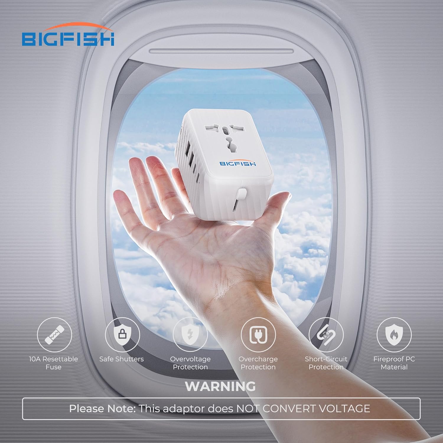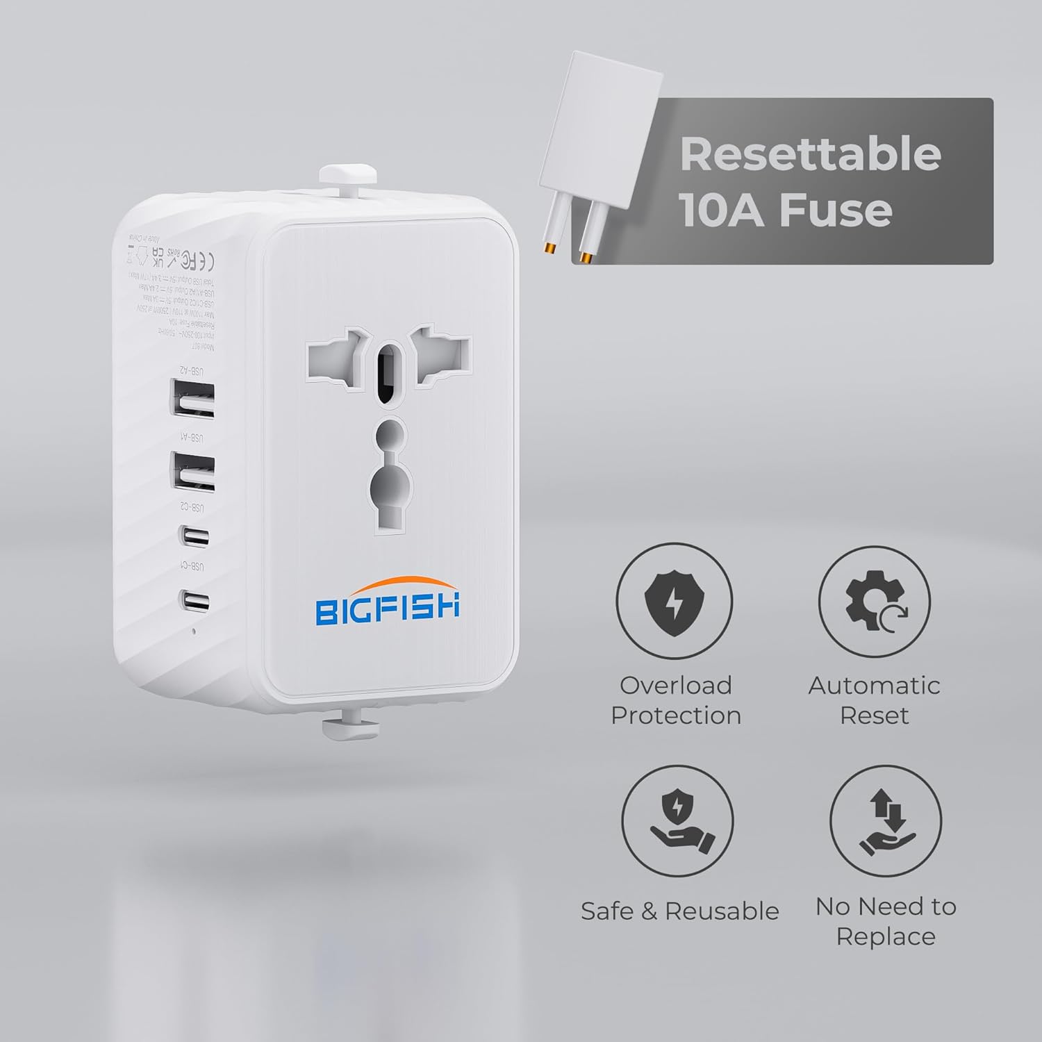 Adattatore universale: questo adattatore da viaggio universale è dotato di prese EU, UK, AU e US. Ti consente di viaggiare in molti paesi come Europa, Stati Uniti, Regno Unito, Germania, Asia, Tailandia, Australia, Cina, Giappone, Israele, Italia, Colombia, ecc. Adattatore da viaggio con 4 porte USB: questo adattatore dispone di 2 porte USB-A (uscita totale: 5 V⎓2,4 A max) e 2 porte USB-C (uscita totale: 5 V⎓3 A). Uscita combinata di tutte le porte USB: 5 V⎓ 3,4 A, 17 W max Adattatore da viaggio universale con fusibile ripristinabile da 10 A: fornisce una protezione affidabile dal sovraccarico e può essere utilizzato più volte senza sostituire il fusibile. Compatibile con una tensione di 100–250 V, 50–60 Hz. Potenza massima: fino a 2500 W a 250 V AC, 1100 W a 110 V AC Formato compatto e materiali di qualità: Dimensioni: 8,4 × 5,0 × 4,0 cm. Dotato di nucleo in rame ad alta conduttività, durevole e resistente alla corrosione. L'alloggiamento è realizzato in materiale PC ignifugo (resistente al calore fino a 750°C), garantendo eccellente stabilità e resistenza agli urti Nota importante: questo NON è UN CONVERTITORE DI TENSIONE. Questo adattatore è compatibile solo con dispositivi a doppia tensione o dispositivi globali che supportano un intervallo di tensione di 100-250 V. Non converte tensione o frequenza