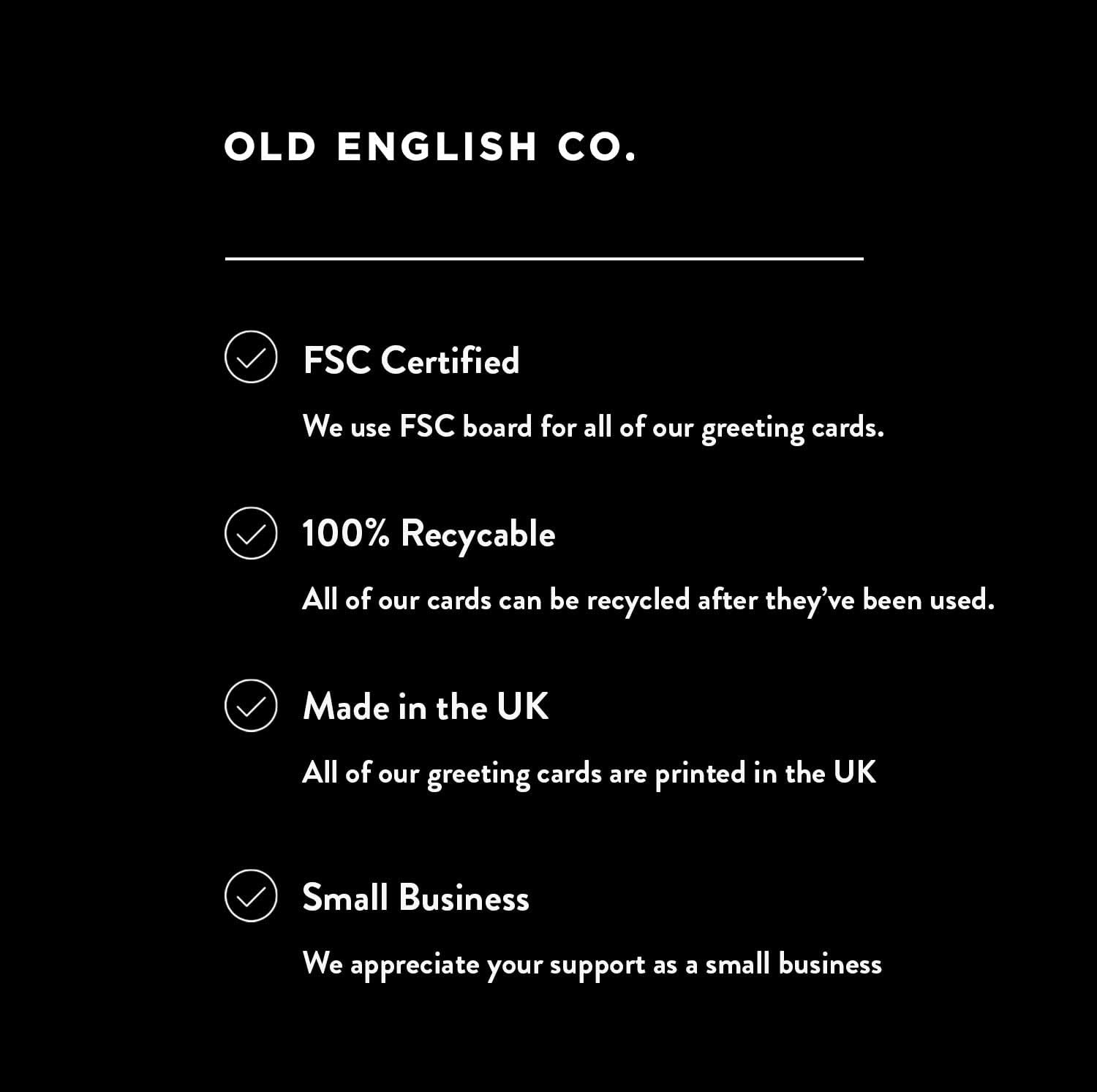 Elegante biglietto d'auguri: questo affascinante biglietto d'auguri sarebbe perfetto da regalare a un familiare, un amico o un collega nel giorno del suo compleanno. Un design elegante che farà sicuramente risaltare questo biglietto d'auguri dal resto. ✨ Passaggi speciali: trova il biglietto di auguri perfetto per la famiglia e gli amici. Abbiamo modelli per tutte le occasioni. Ci preoccupiamo: la nostra gamma di biglietti d'auguri è progettata internamente e tutta stampata in Inghilterra su cartoncino certificato FSC. Le nostre carte sono dotate di una busta di alta qualità realizzata con materiali sostenibili per ridurre al minimo l'impatto ambientale. FORMATO E DIMENSIONI: I nostri biglietti misurano 150 x 150 mm, sono stampati su cartoncino spesso da 280 g/m² e vengono forniti con una busta sigillata in un sacchetto di plastica. Tutti i biglietti sono vuoti all'interno, lasciando molto spazio per i tuoi messaggi personali e sentimentali. 🎁 Informazioni su Old English Company: Ciao, siamo Old English Company. Siamo un marchio di articoli di cancelleria e articoli da regalo con sede nel Regno Unito. Progettiamo e creiamo prodotti splendidamente illustrati e scritti a mano, con l'obiettivo di offrire prodotti eleganti e semplici con messaggi che risuonino con le persone.