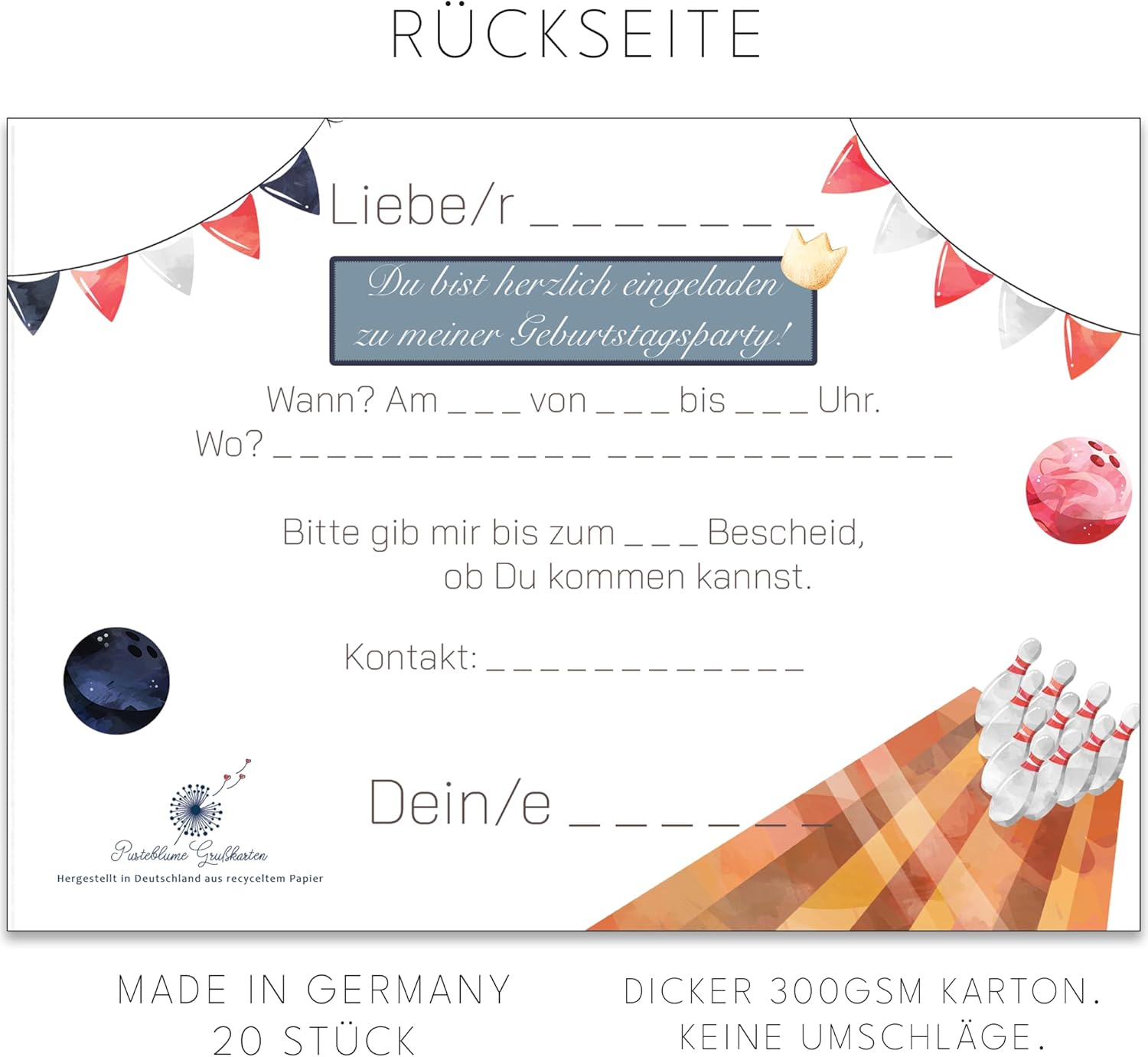 Strice! Con questi fantastici biglietti d'invito il compleanno dei bambini sarà sicuramente un vero piacere. Questo set contiene 20 carte in formato A6 con un allegro motivo bowling sulla parte anteriore, perfetto per i piccoli fan del bowling. Che si tratti di una pista da bowling o una festa per bambini con divertimento a cono, questi inviti sono immediatamente voglia di giocare e divertirsi. I biglietti sono realizzati in cartone riciclato, robusto, sostenibile e realizzato con amore. Sul retro c'è abbastanza spazio per inserire tutte le informazioni importanti per la festa: chi invita quando e dove viene arrotolato, e se forse sono richieste calze colorate. Basta compilare, distribuire – il primo colpo della festa è pronto! Formato A6: maneggevole, ordinato e perfetto da distribuire a scuola o all'asilo. Realizzato in cartone riciclato, ecologico e resistente. Progettato con amore da una piccola azienda a conduzione familiare in Germania, qualità con cuore.