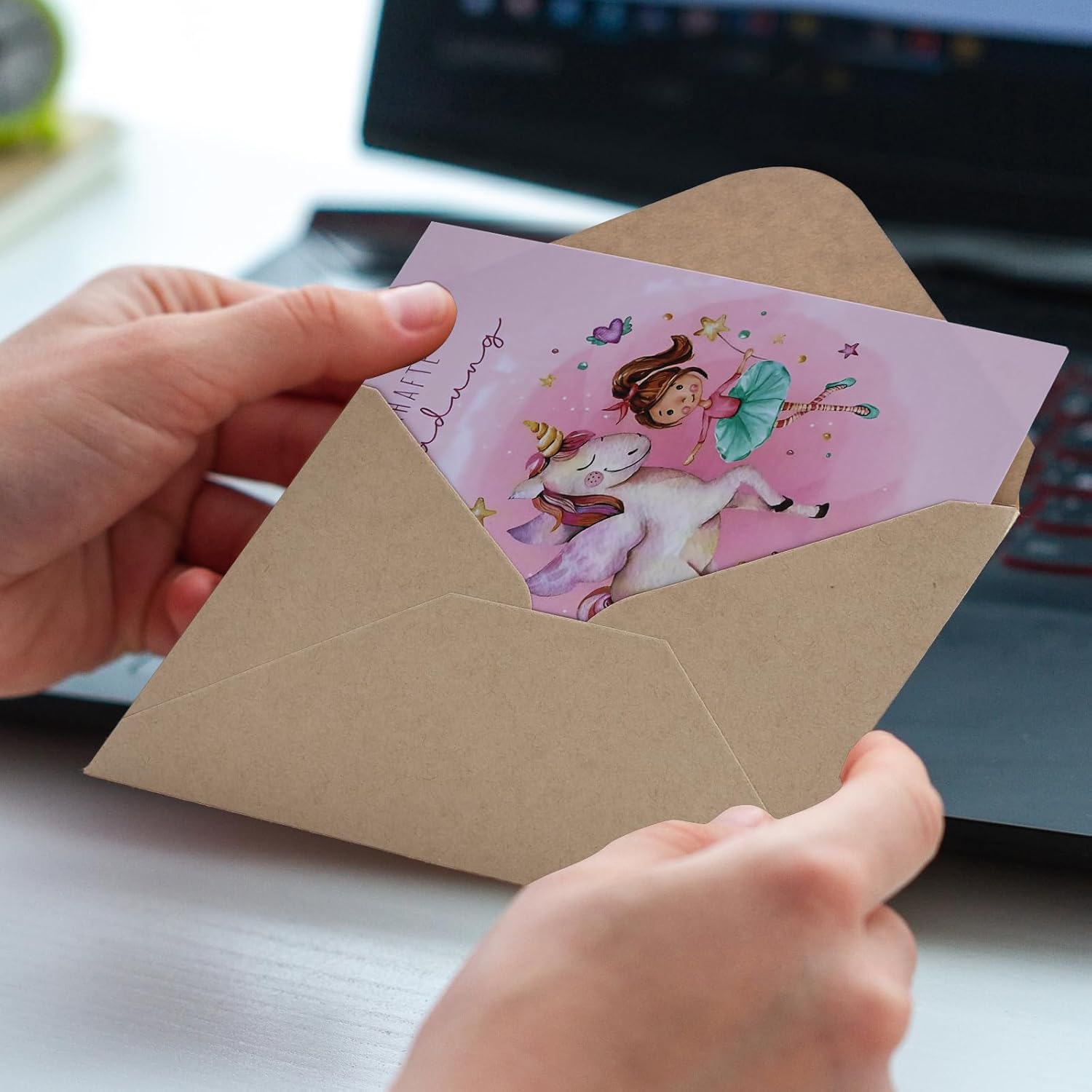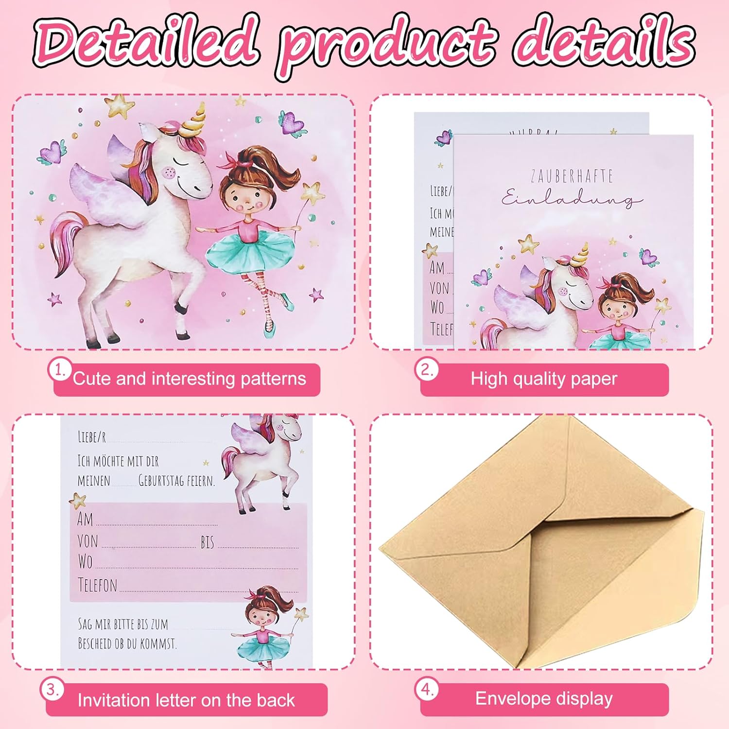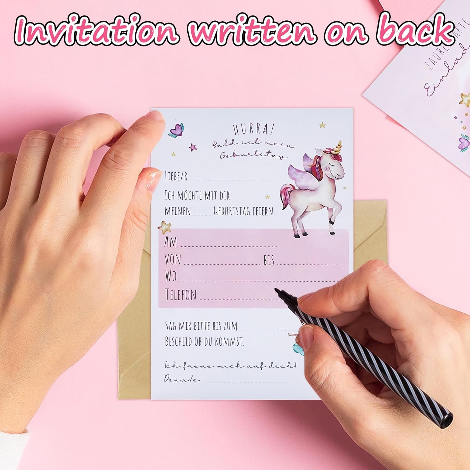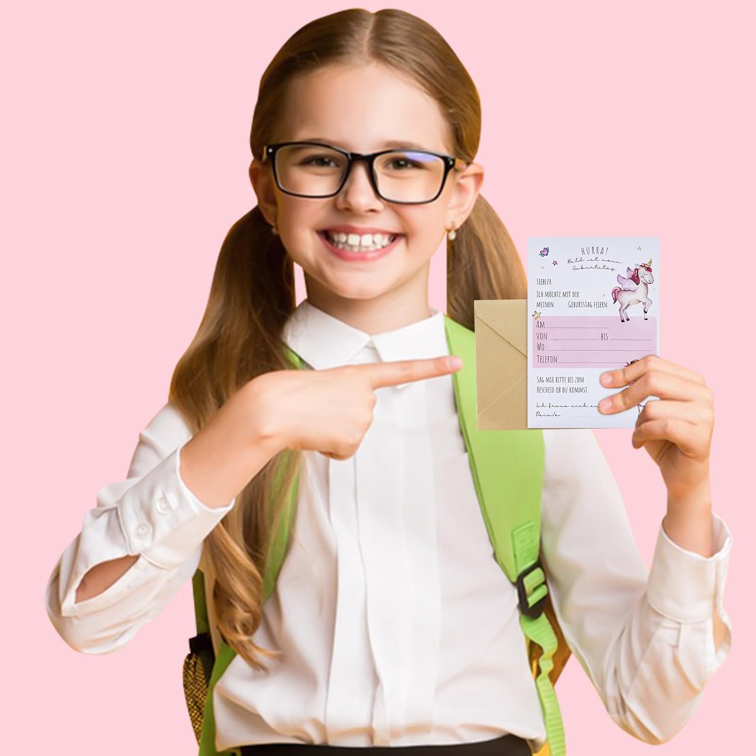 10 biglietti d'invito per il compleanno dei bambini: 10 biglietti d'invito rosa dal design accattivante con motivi di unicorno e ragazza e 10 buste originali color legno. Usa queste carte per invitare i tuoi compagni di classe e i tuoi amici a una festa festiva. ALTA QUALITÀ: I nostri biglietti d'invito per compleanno sono realizzati con carta di alta qualità, resistente e rigida, con stampa chiara e consistenza setosa. Ogni biglietto d'auguri è sottoposto a un rigoroso controllo di qualità. Non è facile da strappare, l'inchiostro non penetra, ecc. Facile da riempire: sul retro dei biglietti d'invito per il compleanno dei bambini troverete suggerimenti per la compilazione che facilitano la compilazione del modulo da parte dei bambini. È possibile utilizzare matita, penna a sfera, penna per firma, non toccare immediatamente dopo la scrittura, basta asciugare un po'. Design: l'intera carta è una combinazione di rosa e bianco, ci sono unicorni e una bambina con una coda di cavallo, la combinazione di colori da sogno sarà sicuramente amata dai bambini. Regala la busta al tuo amico per far sentire apprezzati i tuoi compagni di classe e i tuoi amici. Molteplici occasioni disponibili: i biglietti d'invito possono essere utilizzati non solo per inviti di compleanno, ma anche per feste in piscina, feste a tema, comunioni, battesimi, rientro a scuola, lauree, ecc., in modo che possano venire tutti gli amici e i familiari.