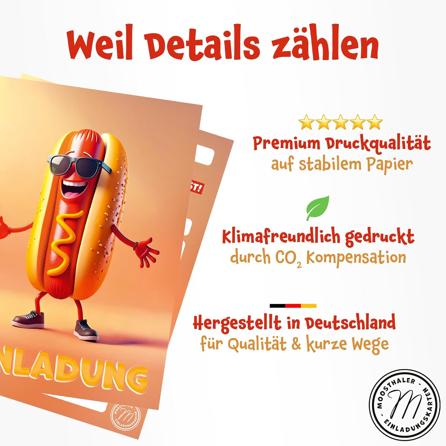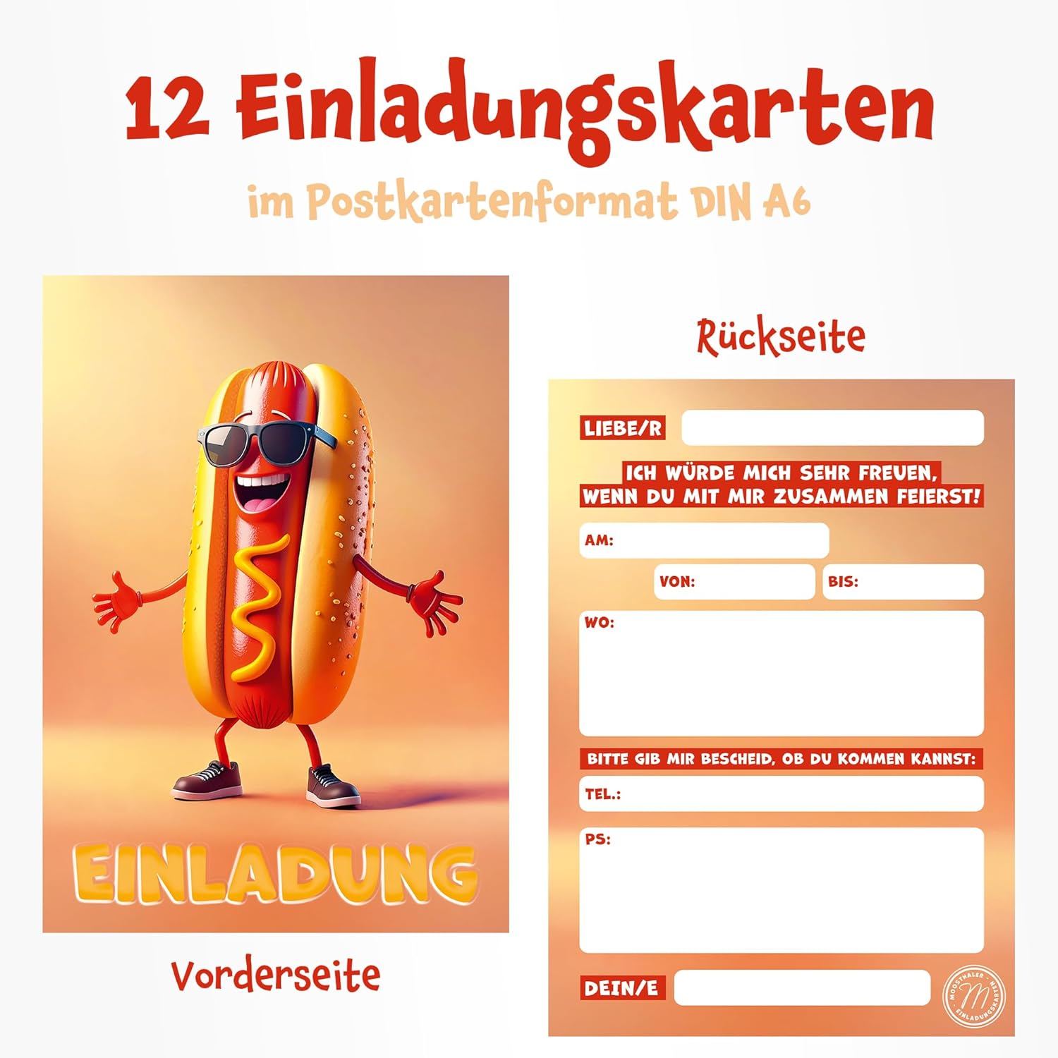 Design divertente per un buon umore: il divertente personaggio di hot dog con occhiali da sole garantisce un sorriso! Perfetto per grigliate, compleanni a tema fast food o feste estive Adatto per molte occasioni: che si tratti di compleanno dei bambini, feste estive o grigliate, questo invito si adatta sempre quando si desidera essere delizioso, divertente e colorato ️ Compilazione adatta ai bambini: retro con campi prestampati per tutte le informazioni importanti, compilato in modo facile e veloce. Ideale per bambini e genitori Prodotto in Germania, progettato e stampato in Germania, rispettoso del clima grazie al bilanciamento di CO₂. Stampa di alta qualità su carta robusta da 350 g/m² Contenuto della confezione: 12 biglietti di invito in formato A6 (10,5 x 14,8 cm), lati frontali con finitura lucida. Salvaspazio e pronto all'uso